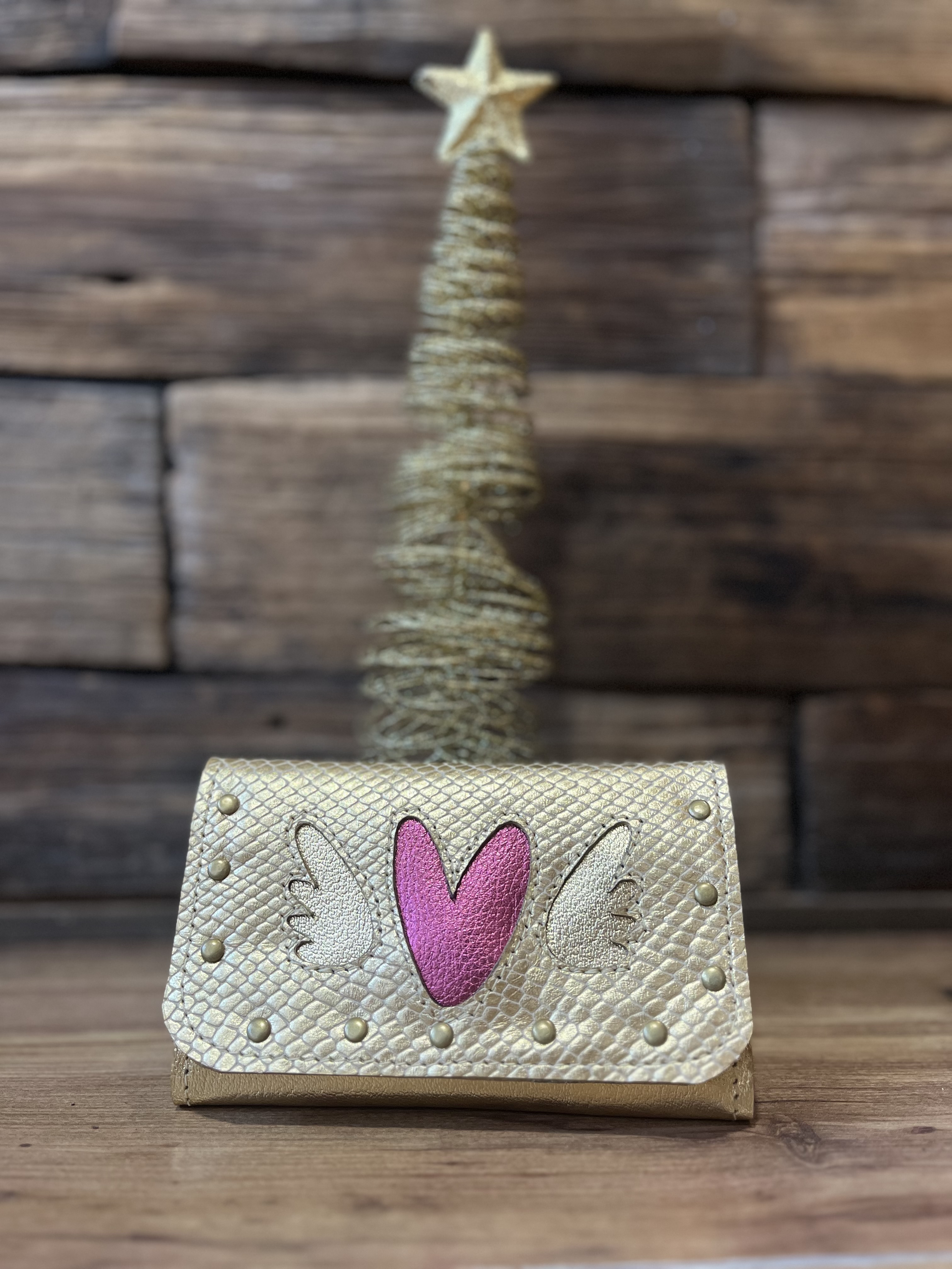Billetera cuero corazon alado dorado fucsia 3 cuerpos