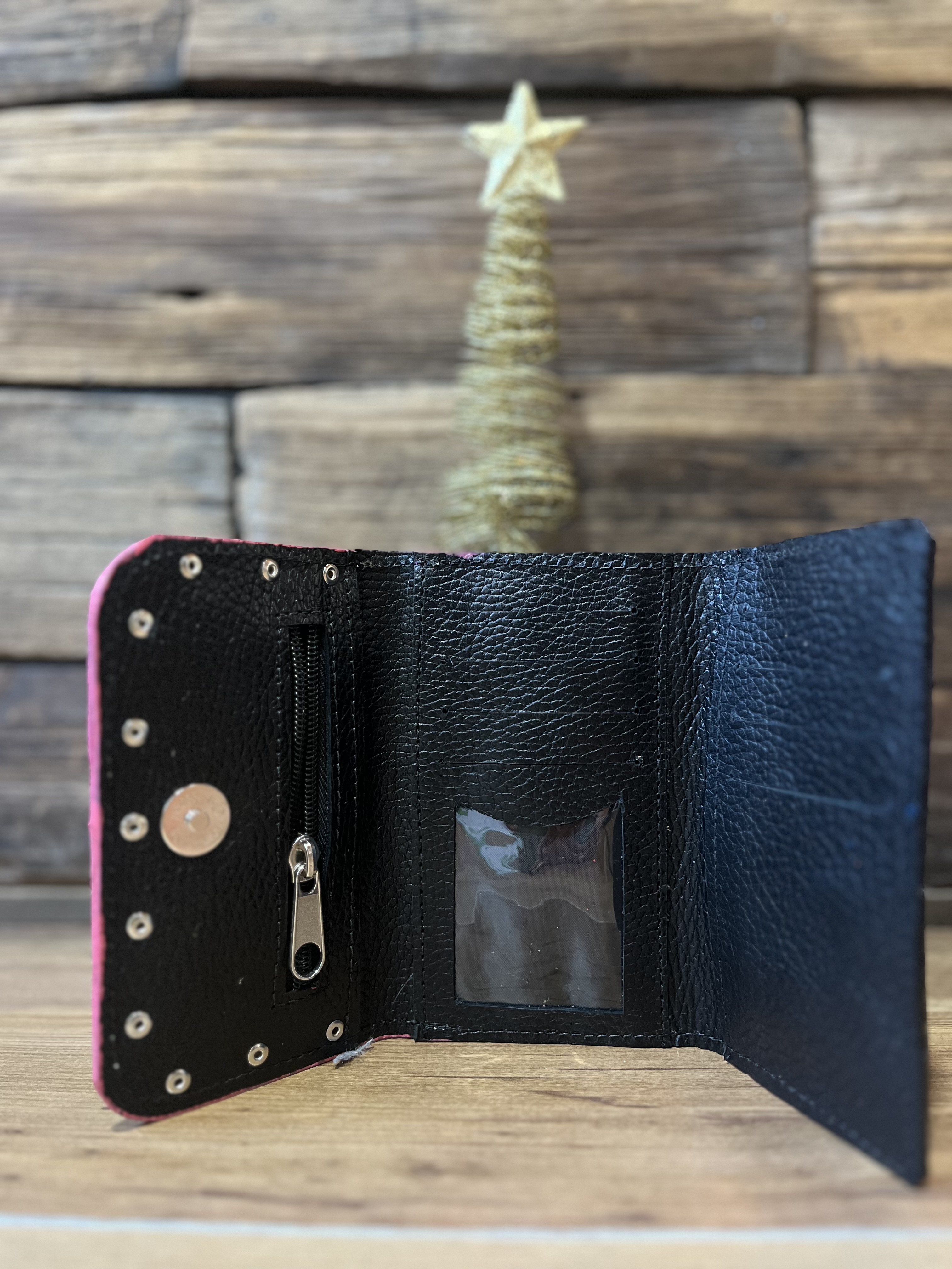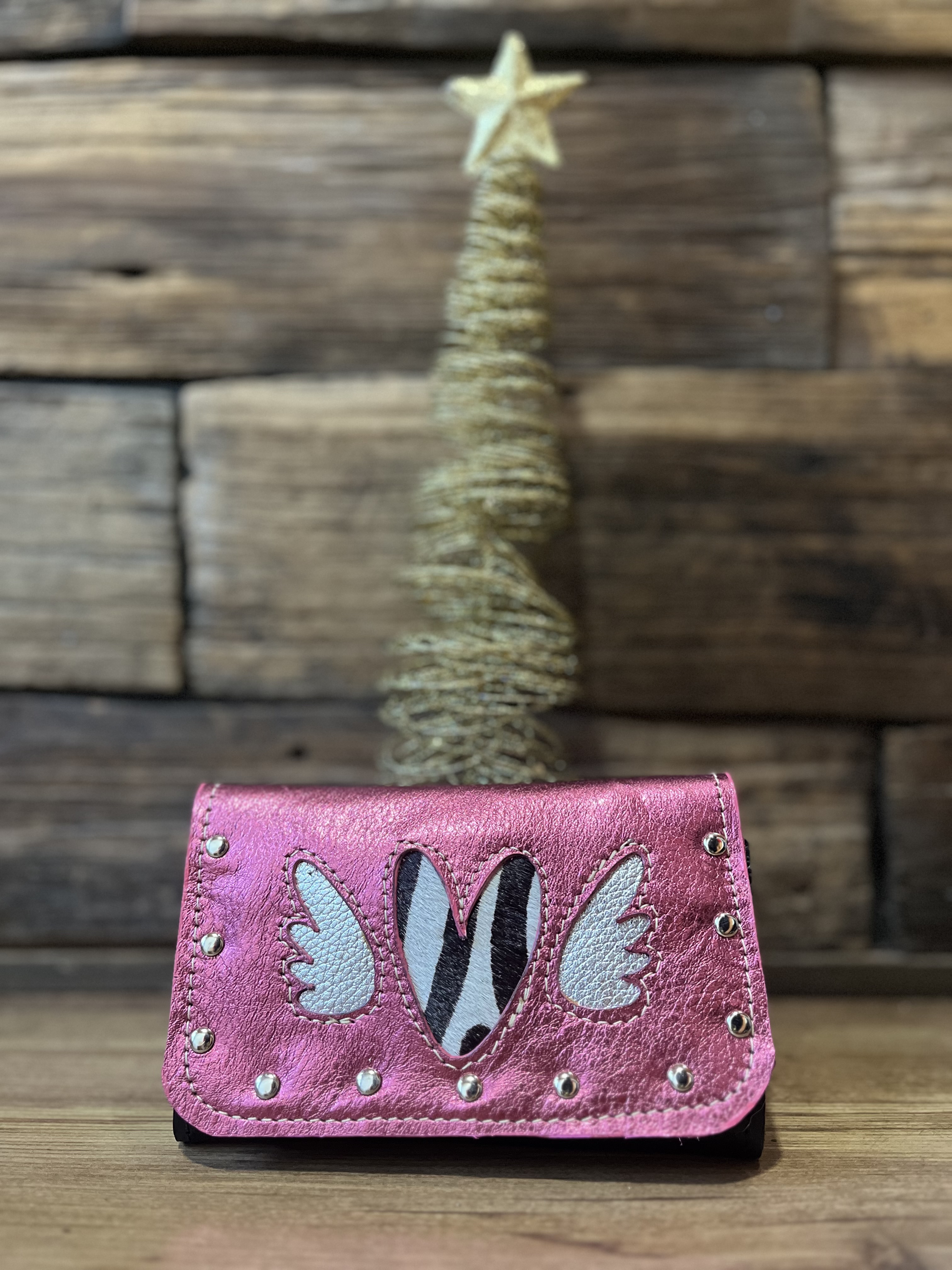 Billetera cuero corazon alado fucsia negro 3 cuerpos