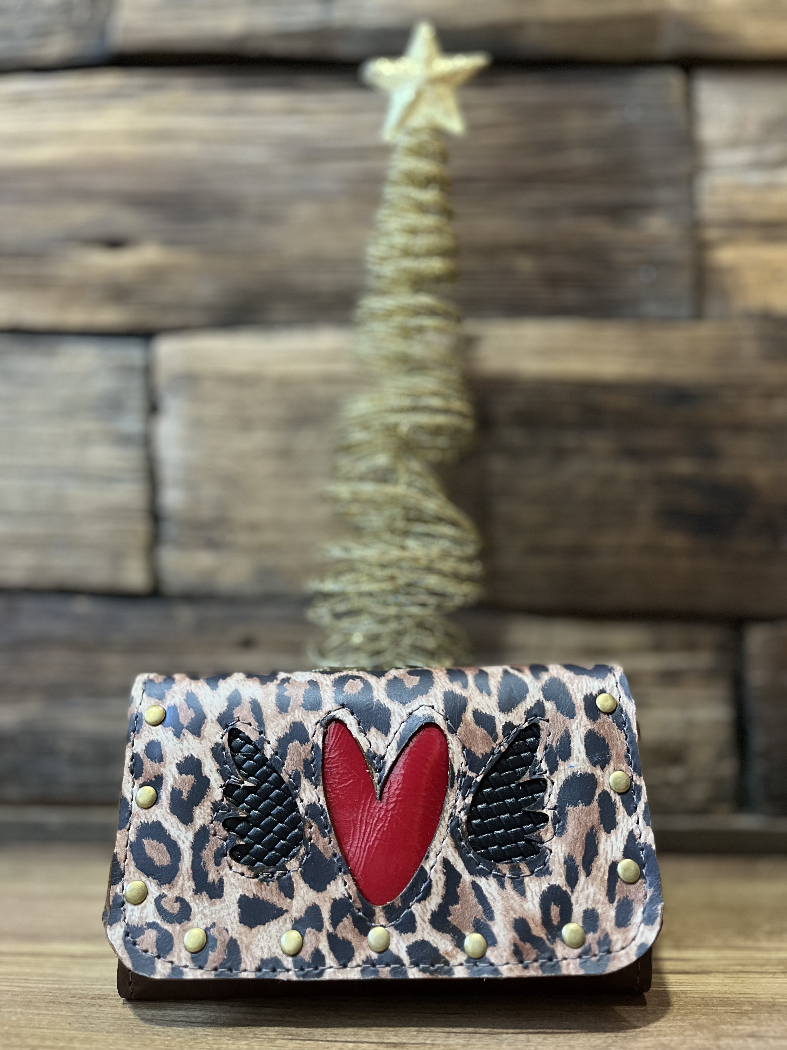 Billetera cuero corazon alado leopardo camel rojo 3 cuerpos