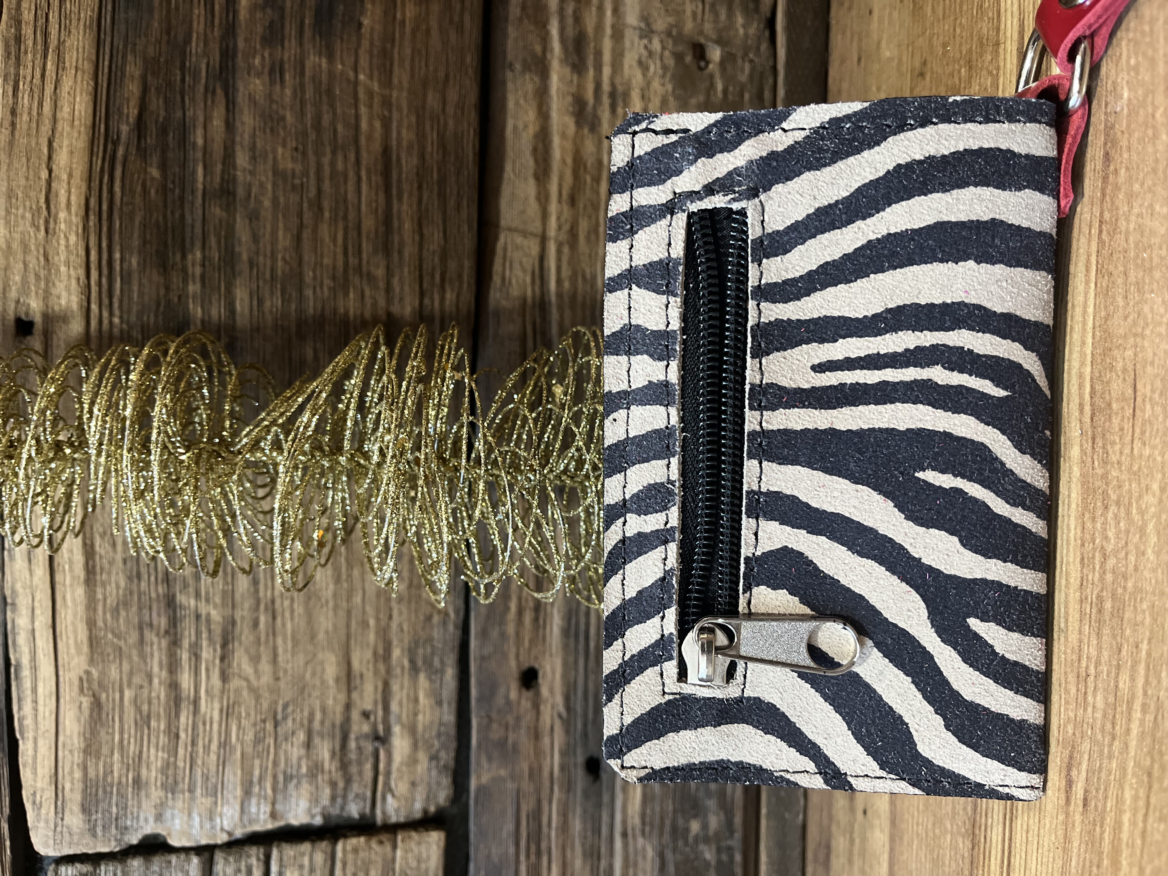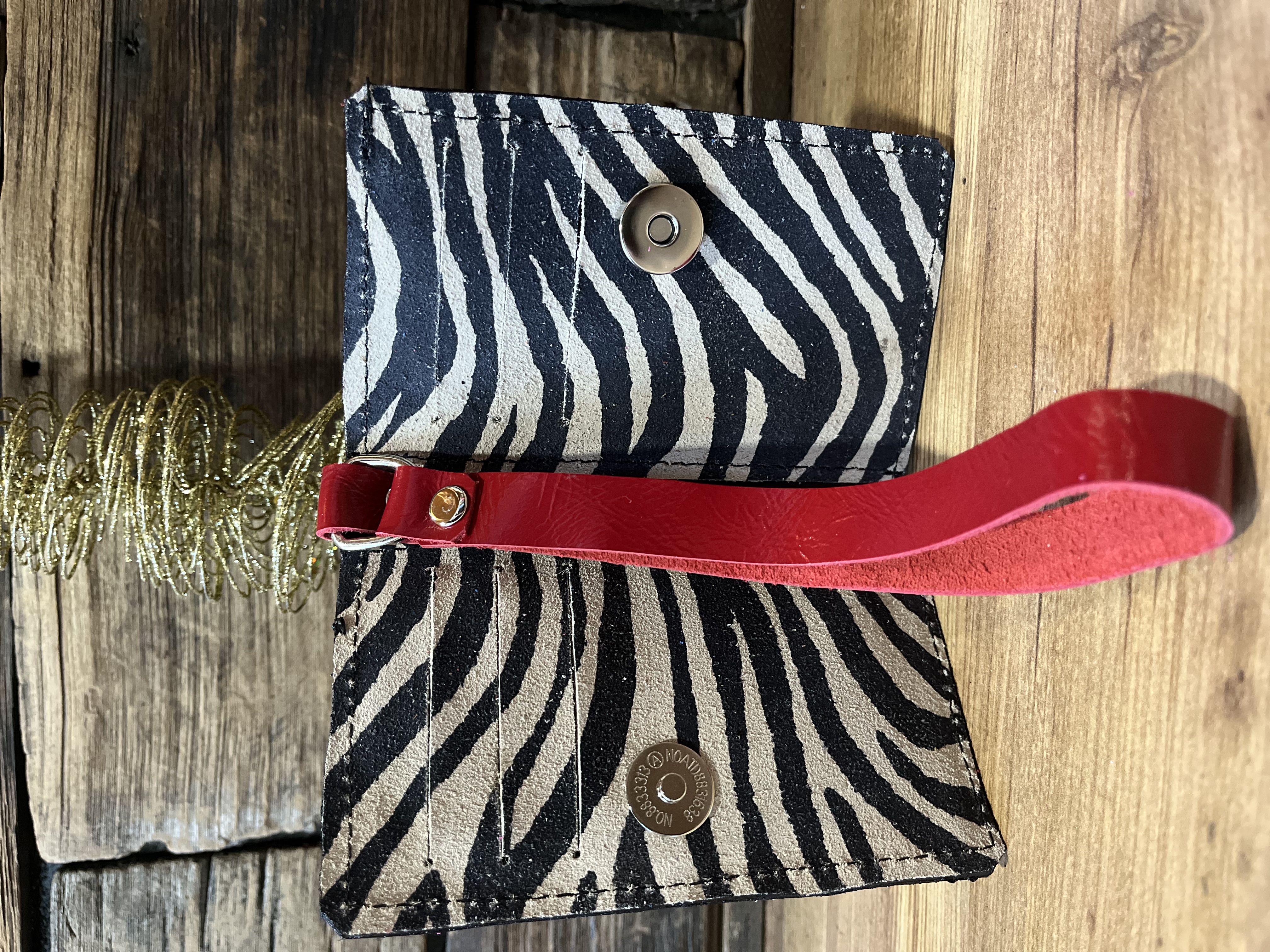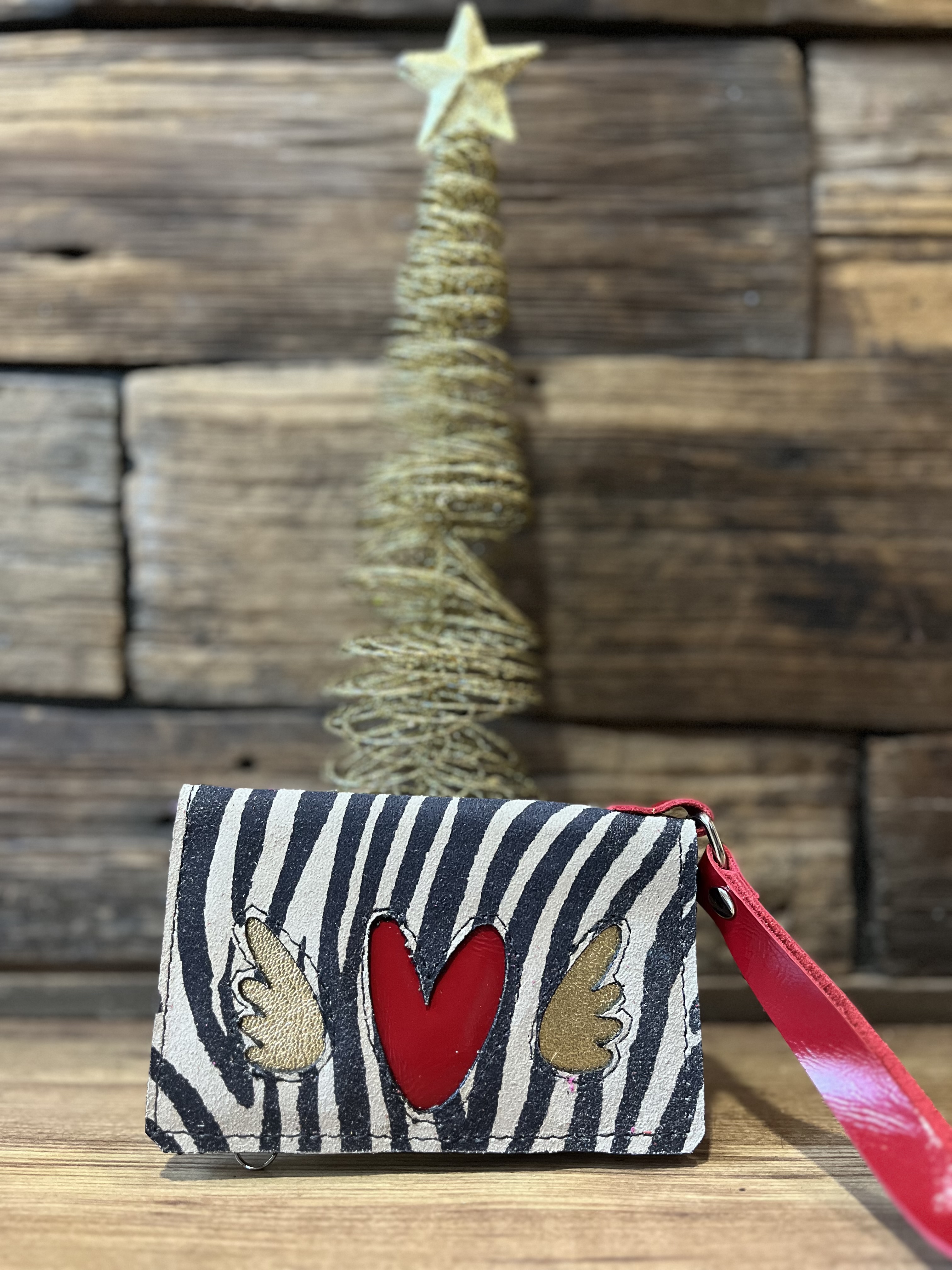 Billetera mini cuero corazon alado cebra rojo 2 cuerpos