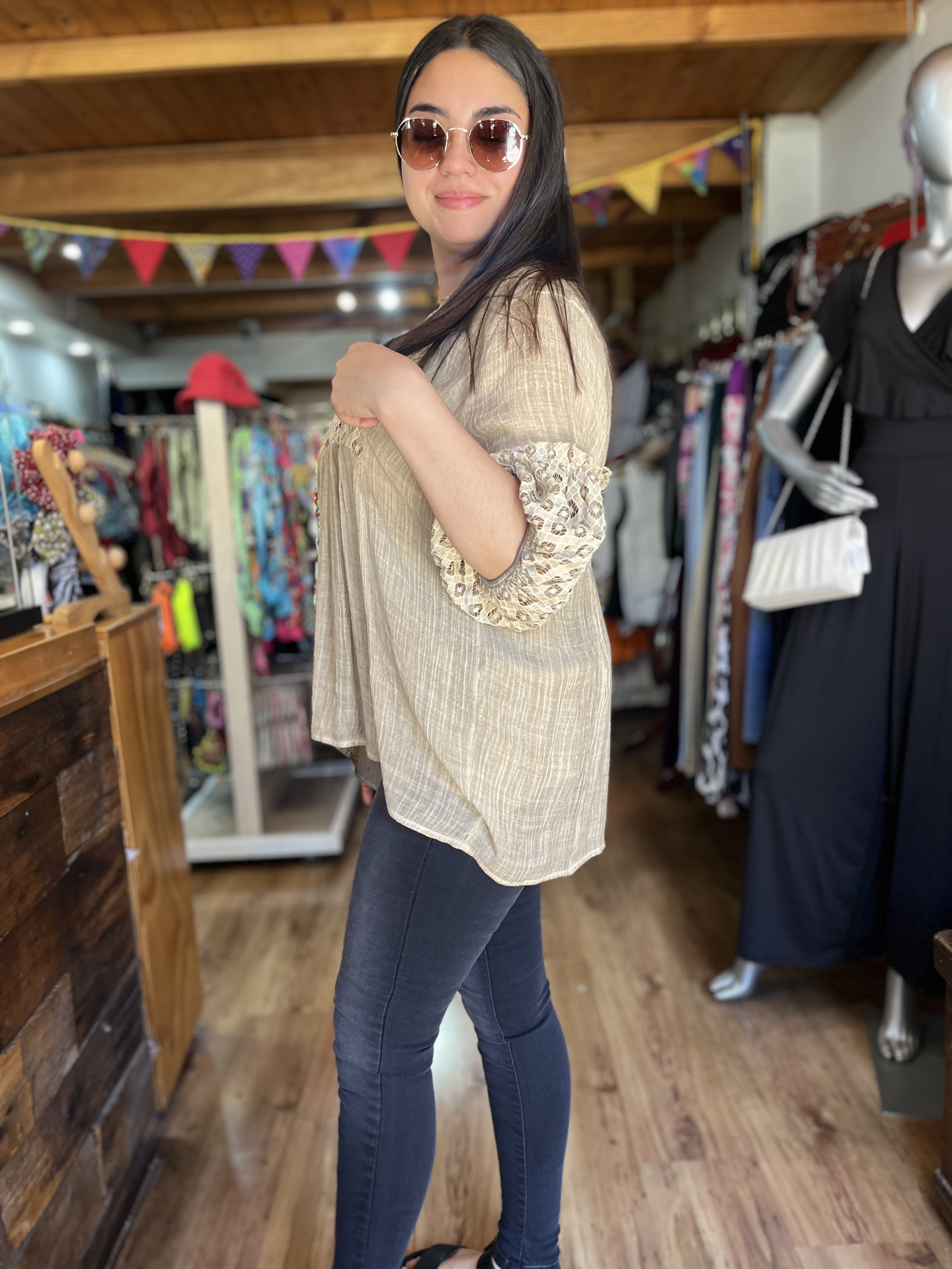 Blusa lino encaje beige manga globo