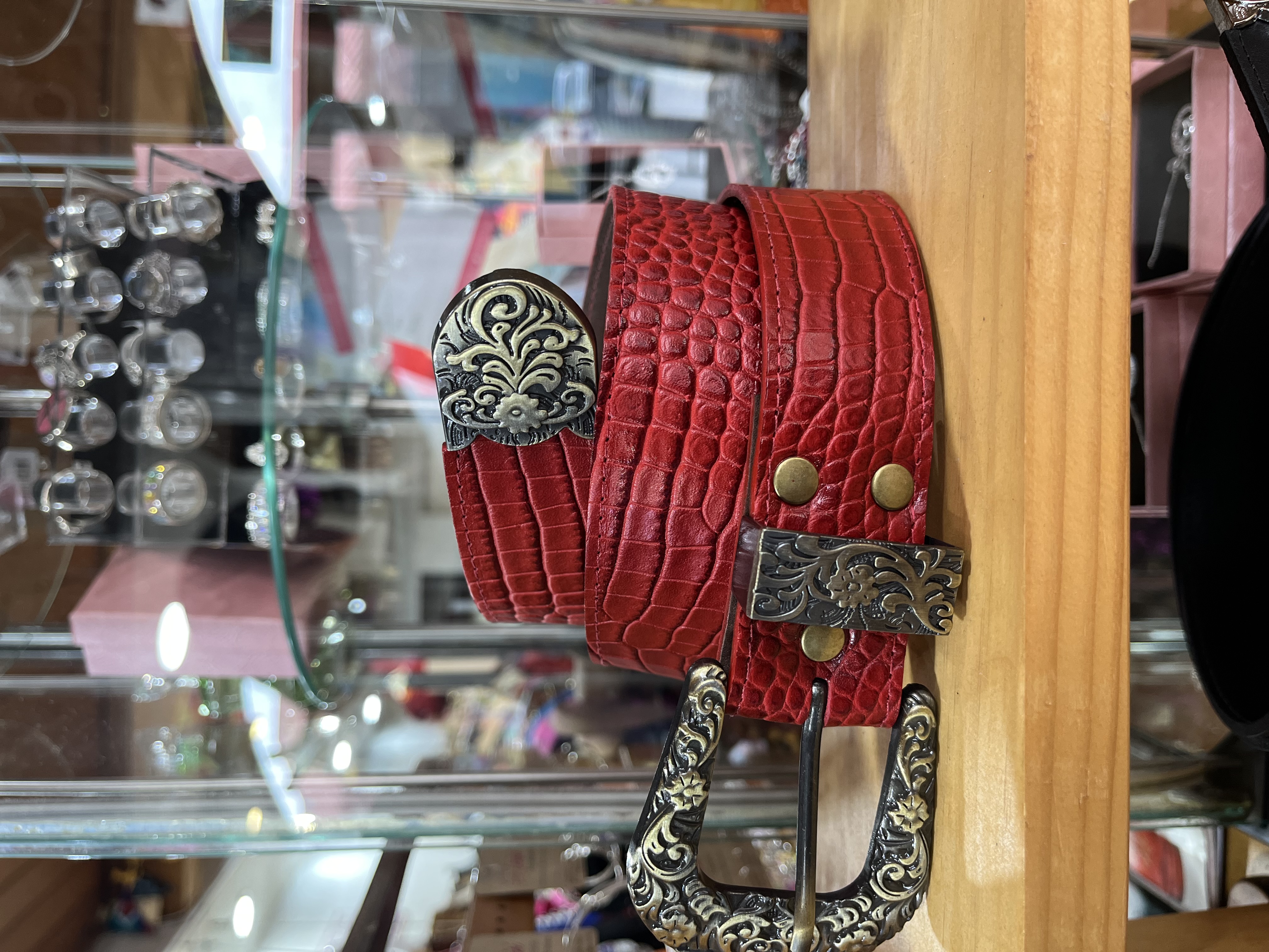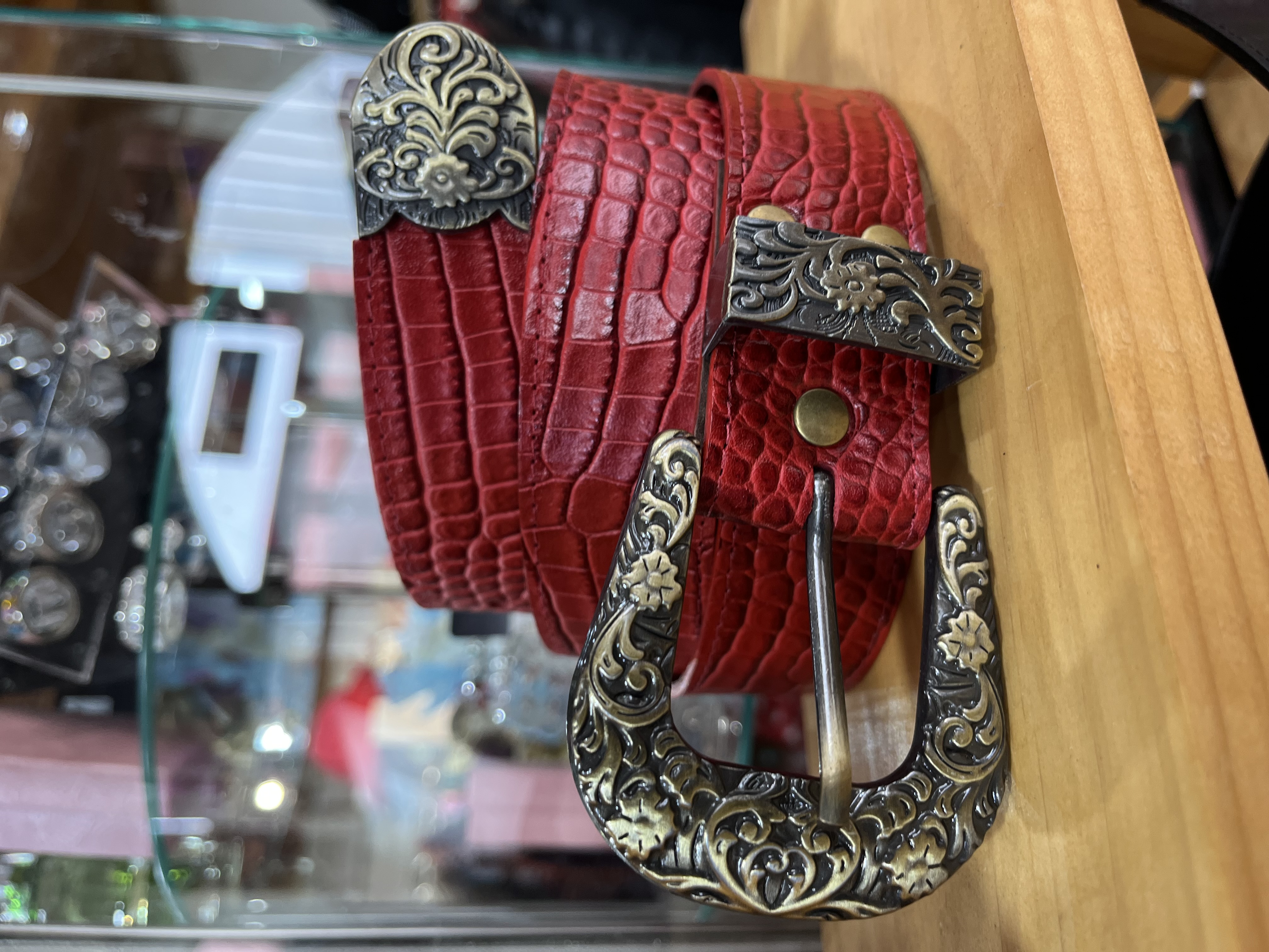 Cinturon cuero rojo cocodrilo textura 3,5 cms ancho con puntera