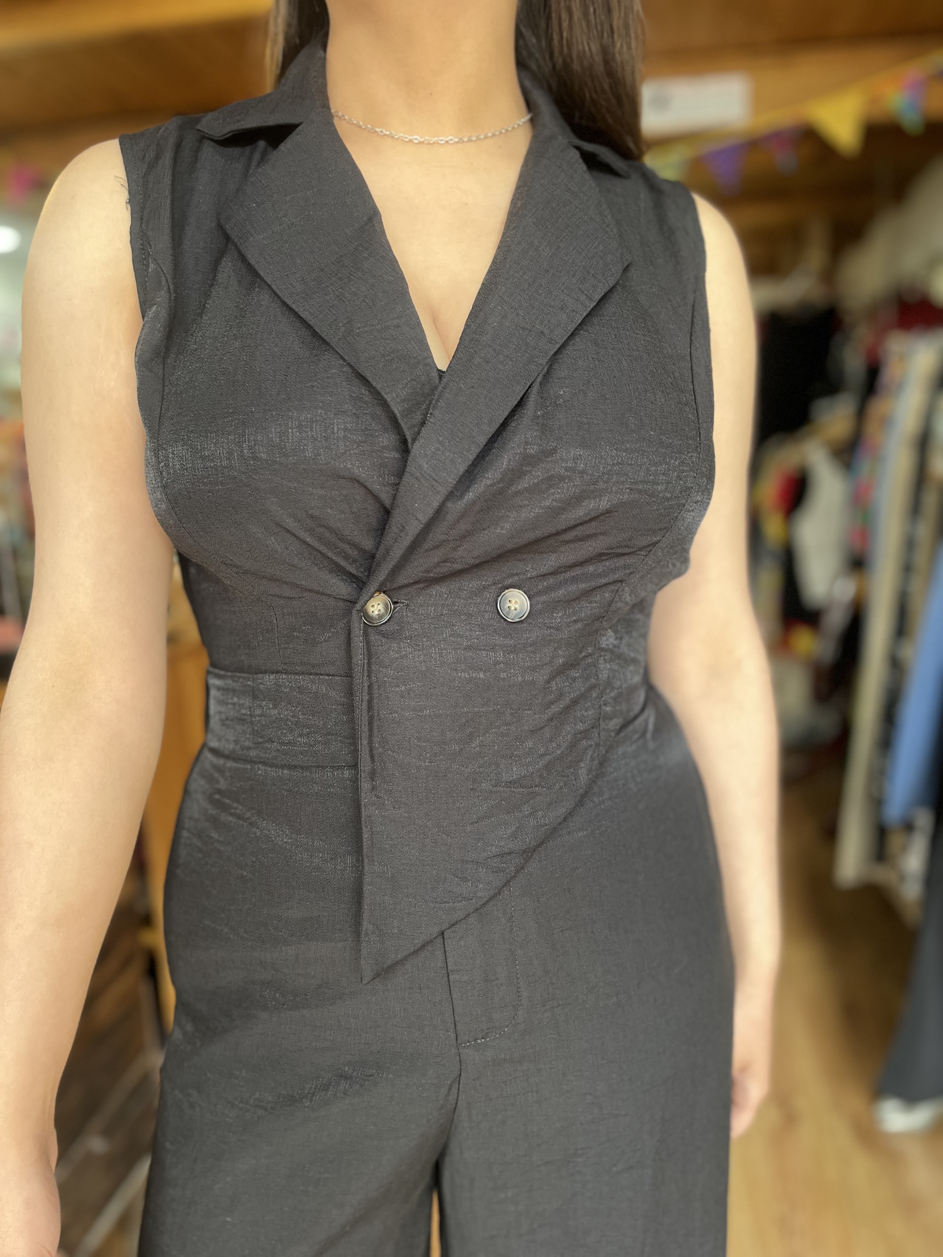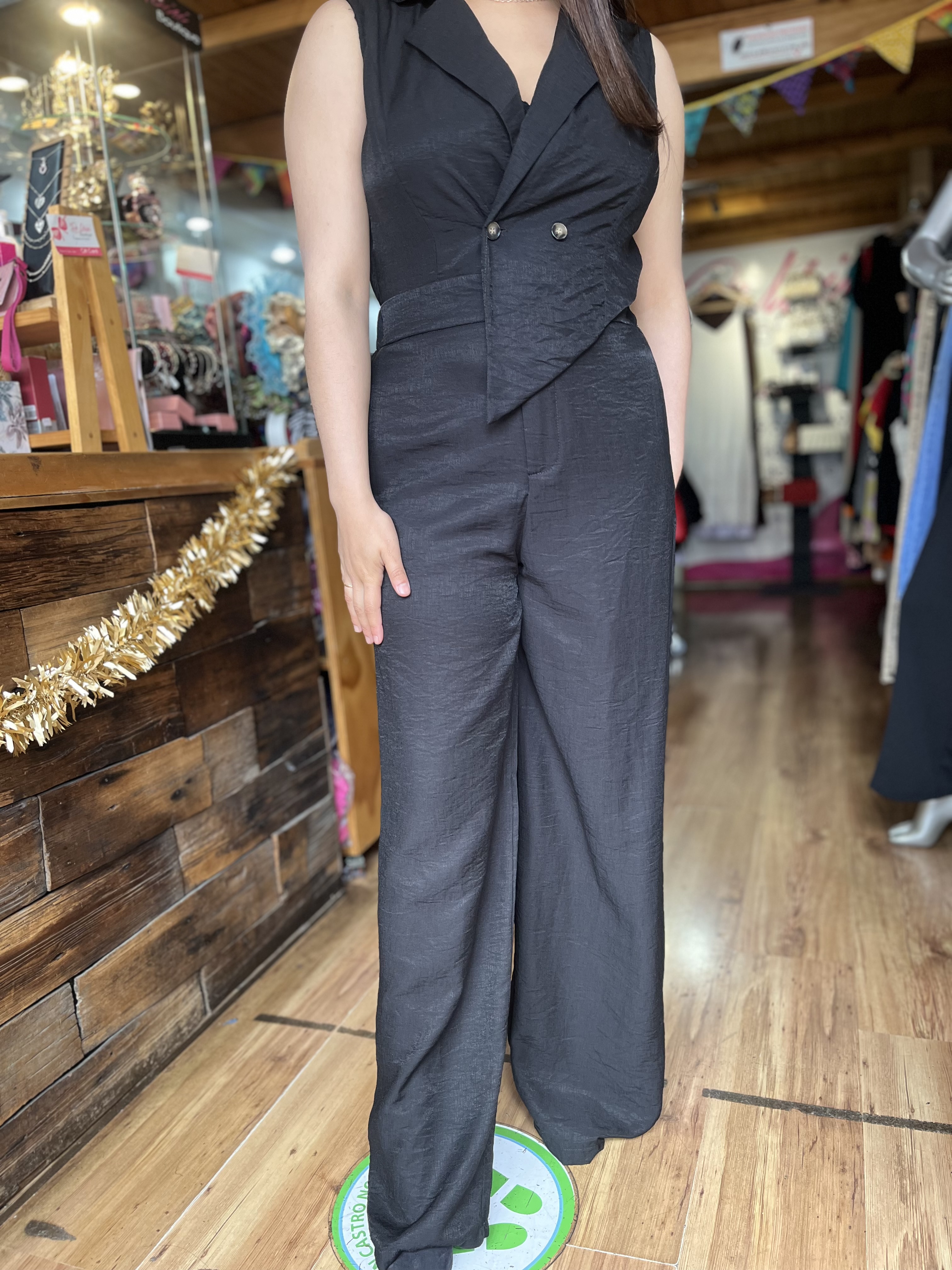 Descubre nuestro elegante enterito cruzado en color negro, diseñado especialmente para esos momentos que requieren un toque de distinción. Este enterito cuenta con prácticos bolsillos y un sofisticado cruce con botones, complementado por un clásico cuello camisero.