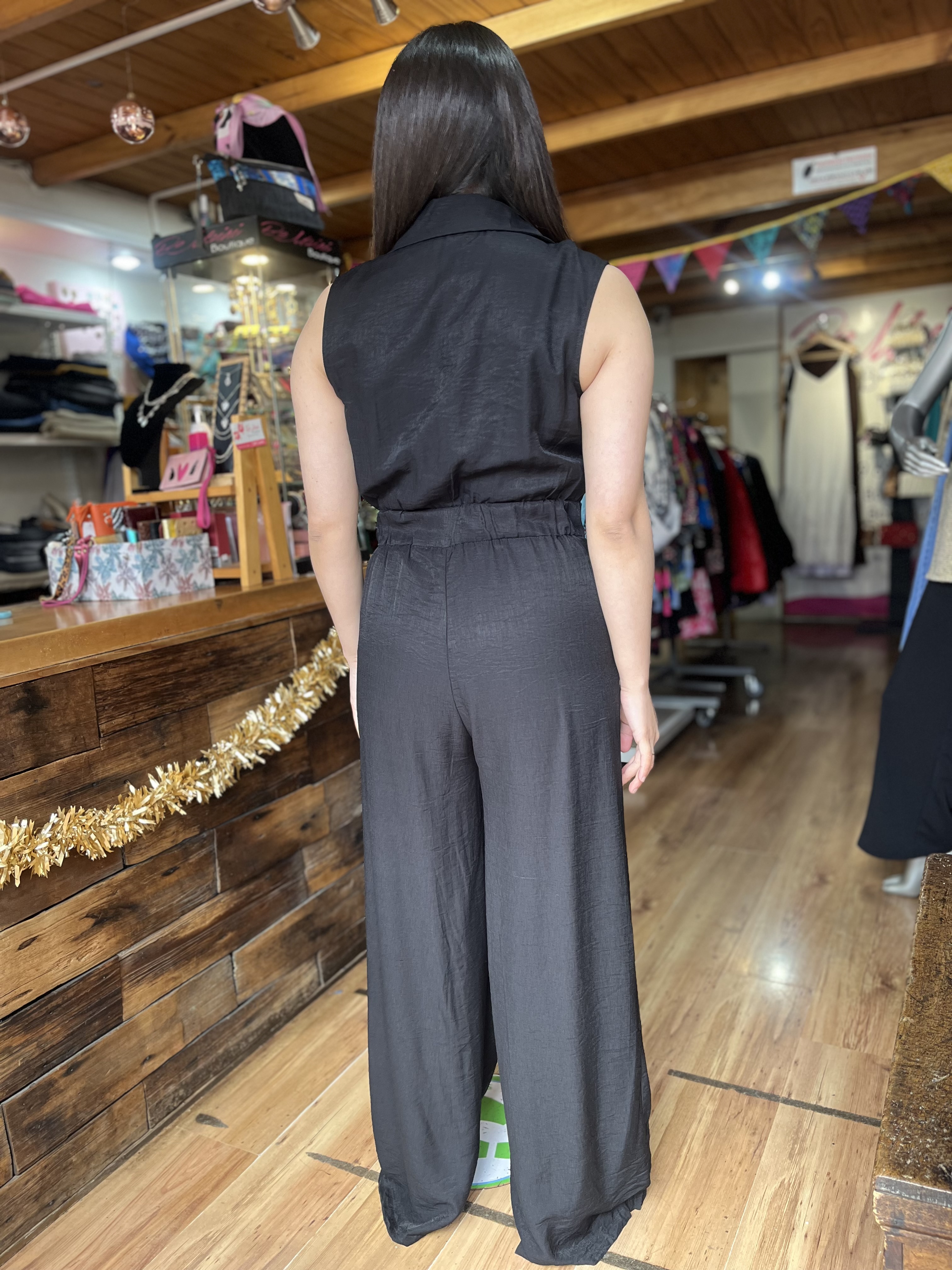 La tela crep, con un sutil brillo, agrega un aire de elegancia a tu atuendo, mientras que la pretina trasera elasticada garantiza una comodidad excepcional y un ajuste perfecto. Ideal para ocasiones formales, este enterito es una pieza versátil que puedes combinar con diferentes accesorios y calzado para crear looks únicos y sofisticados.