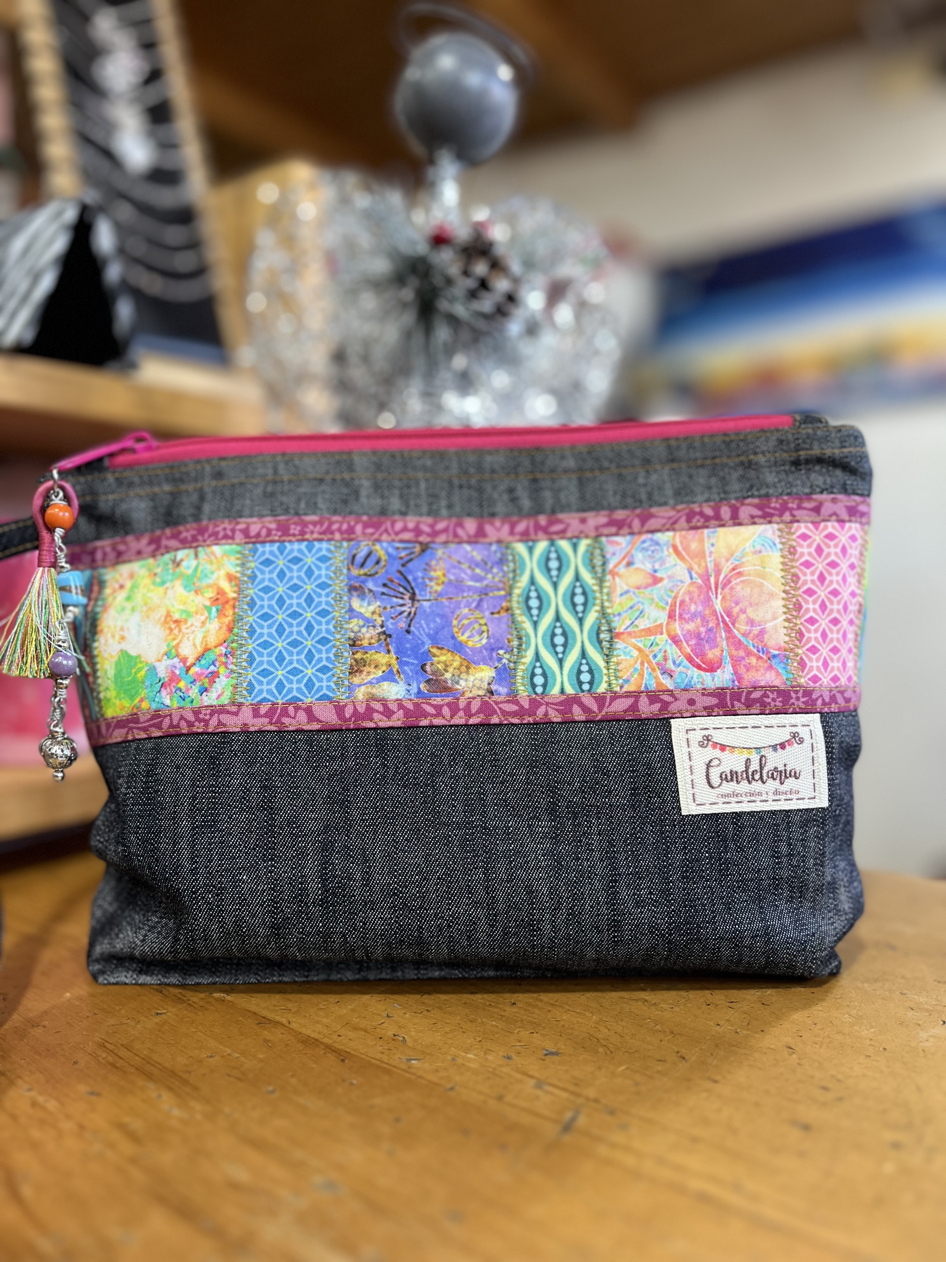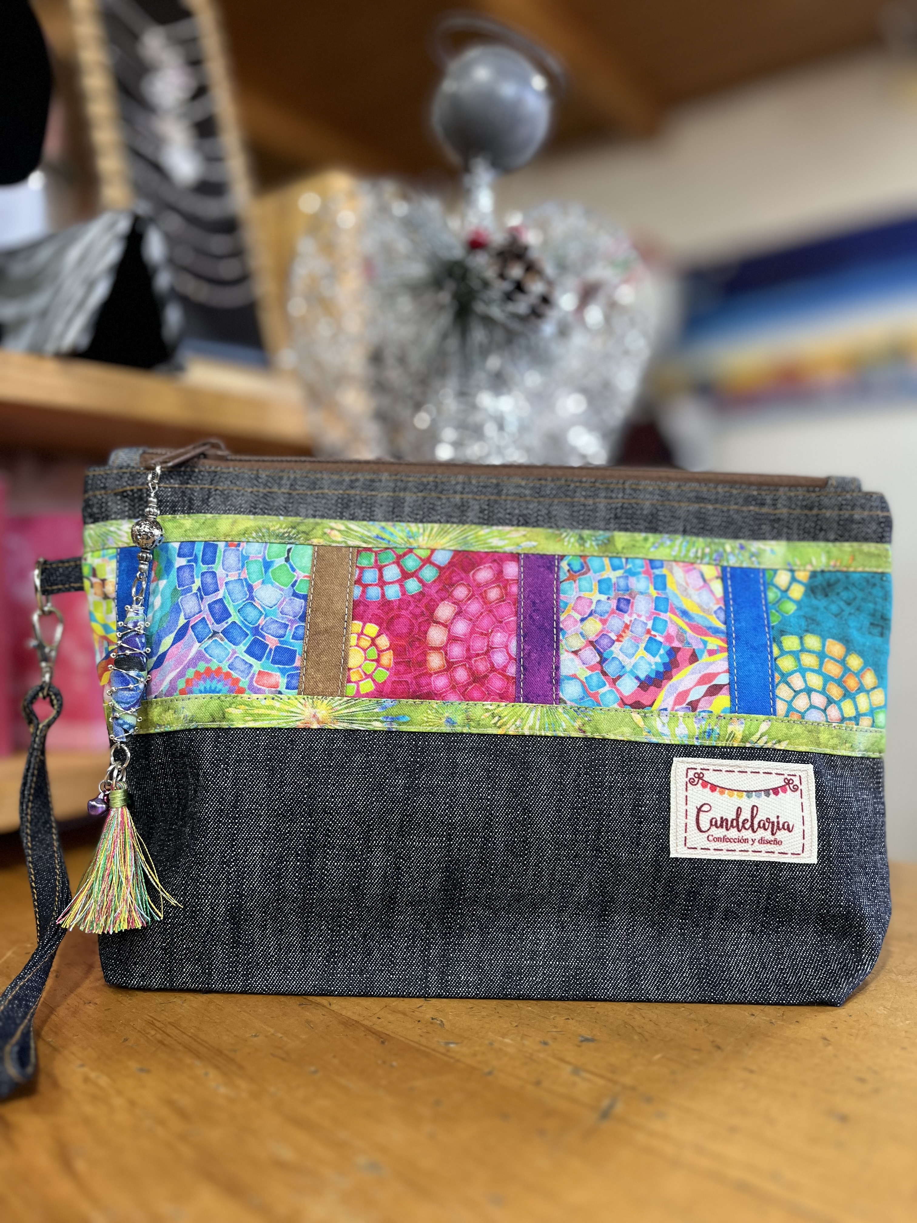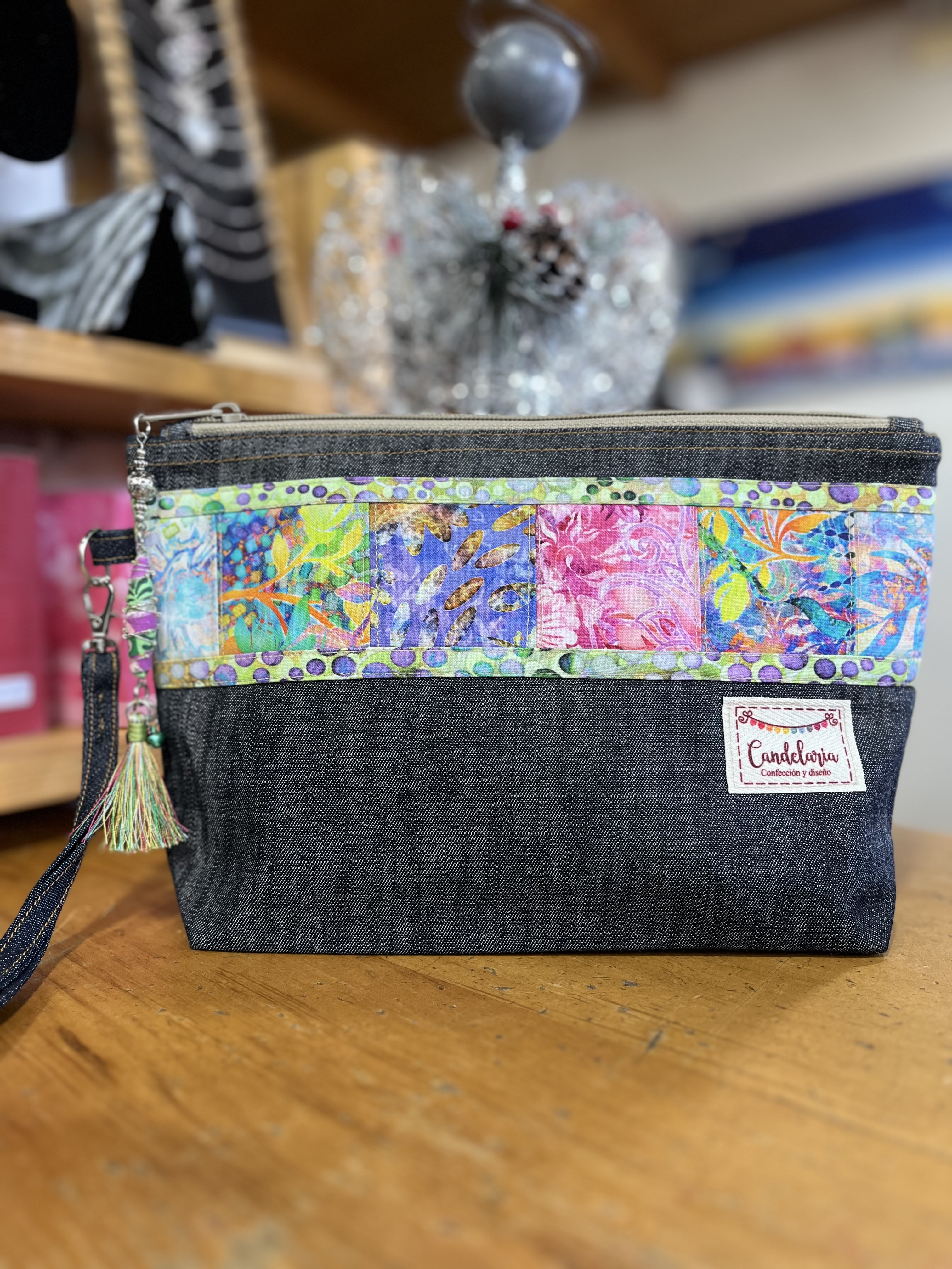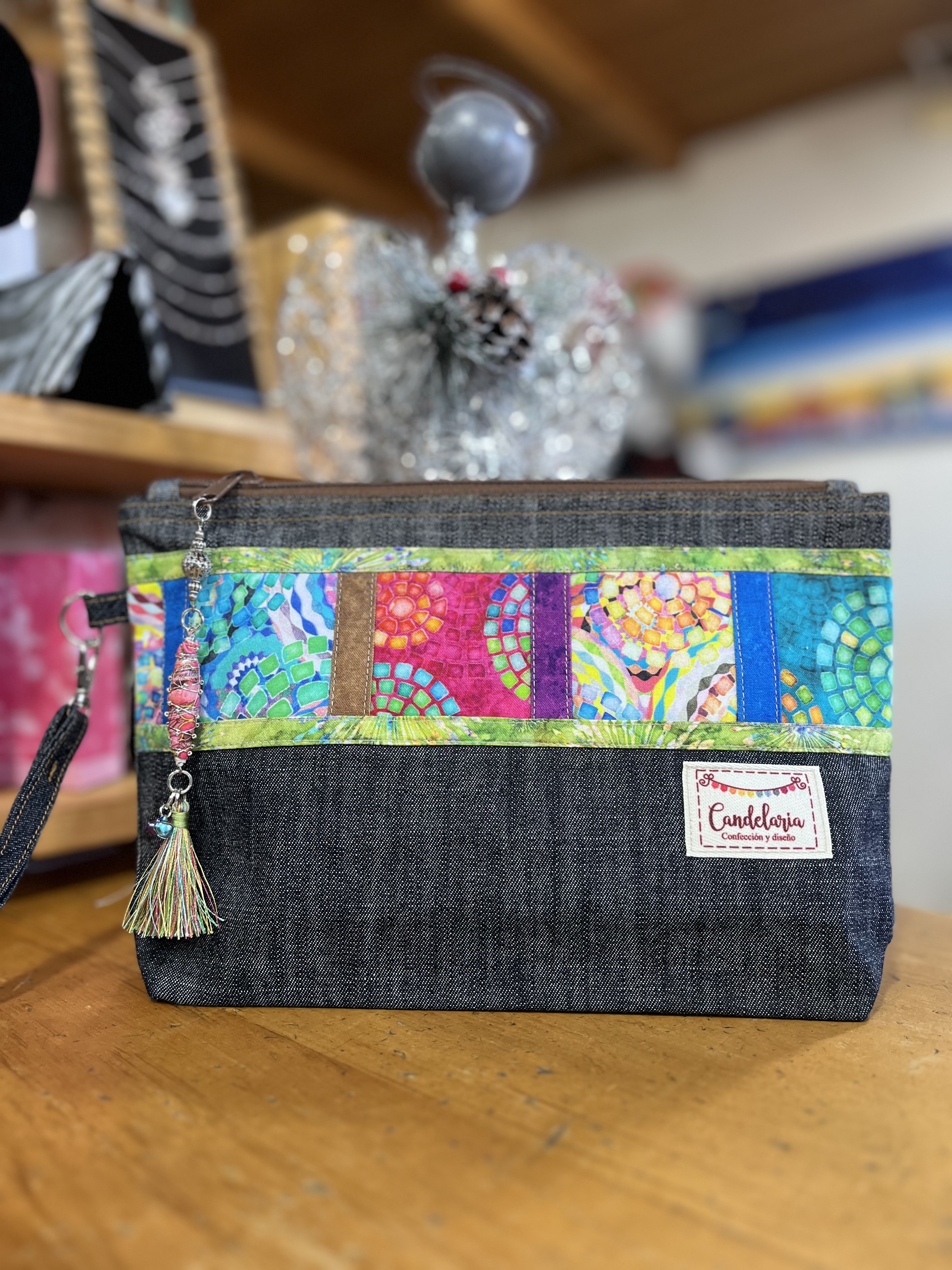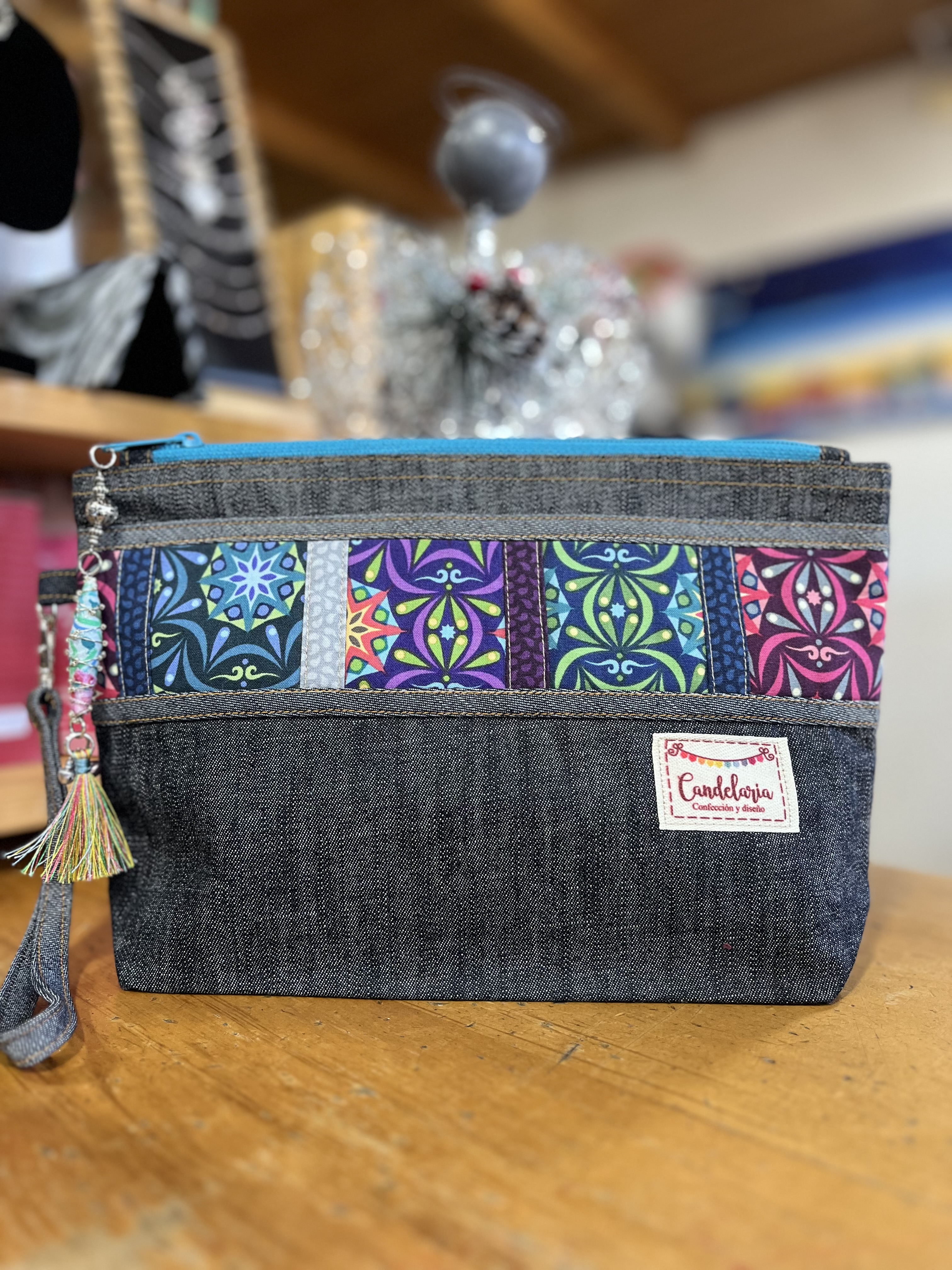 Estuche XL mosaico mezclilla y algodon con asa desmontable
