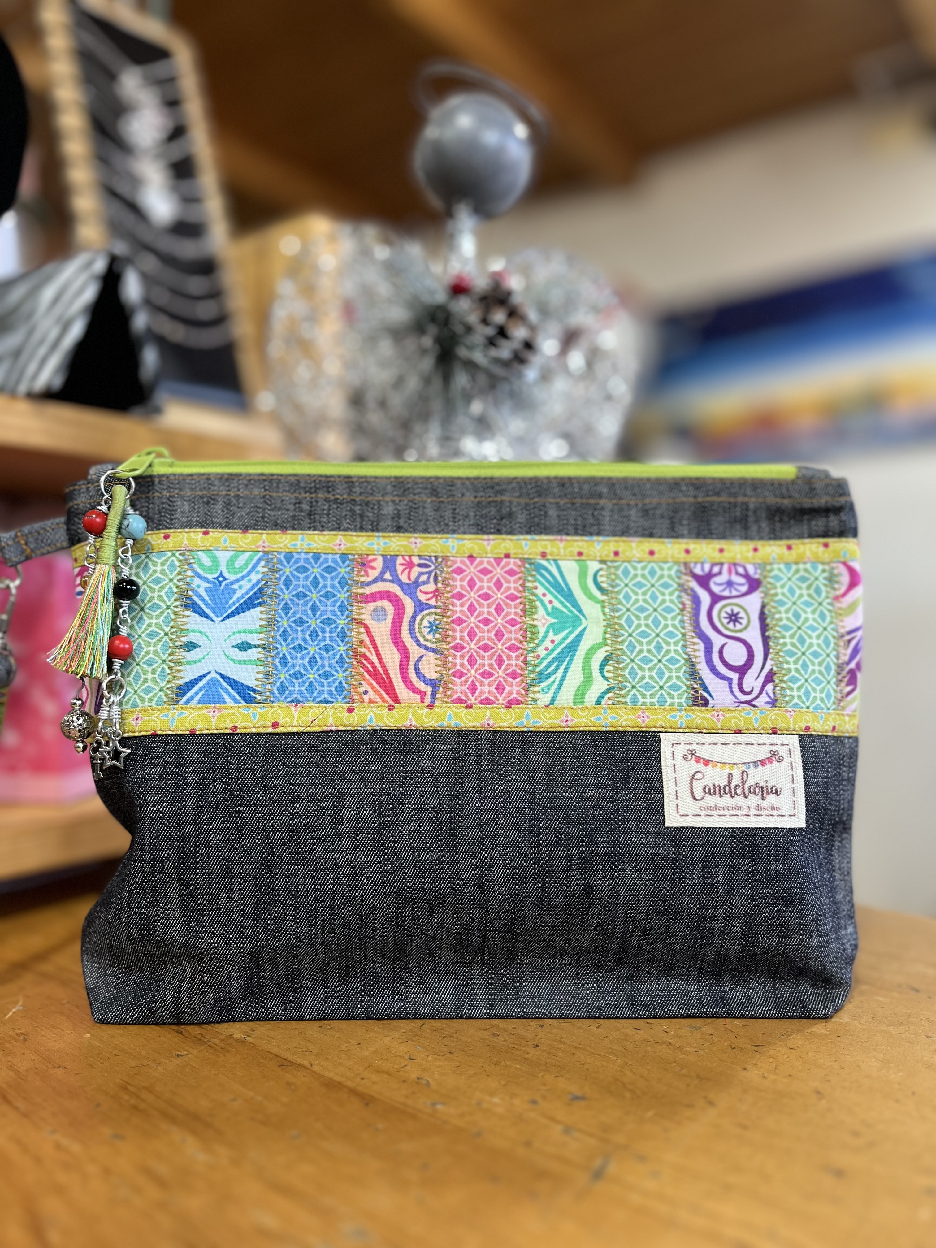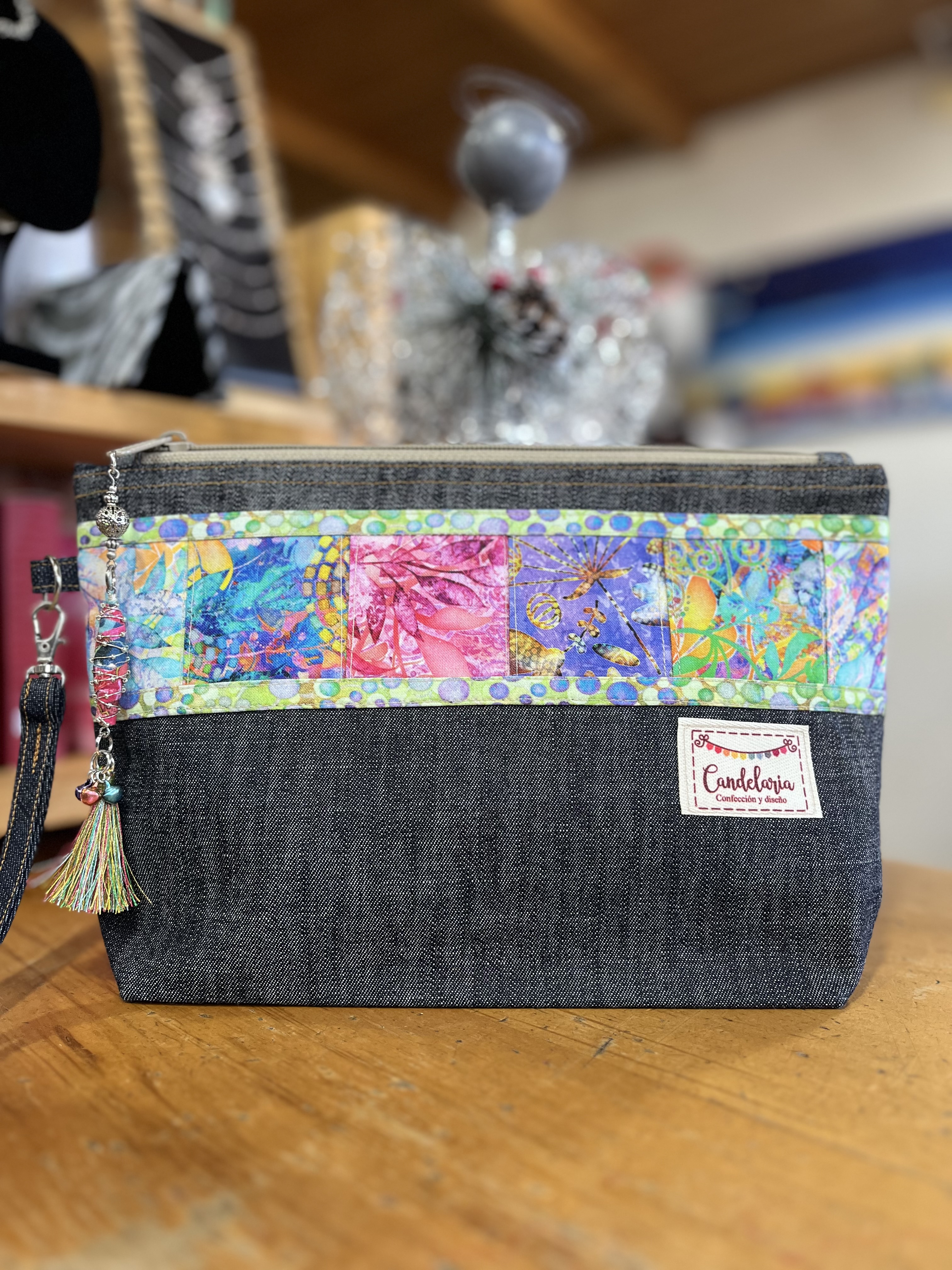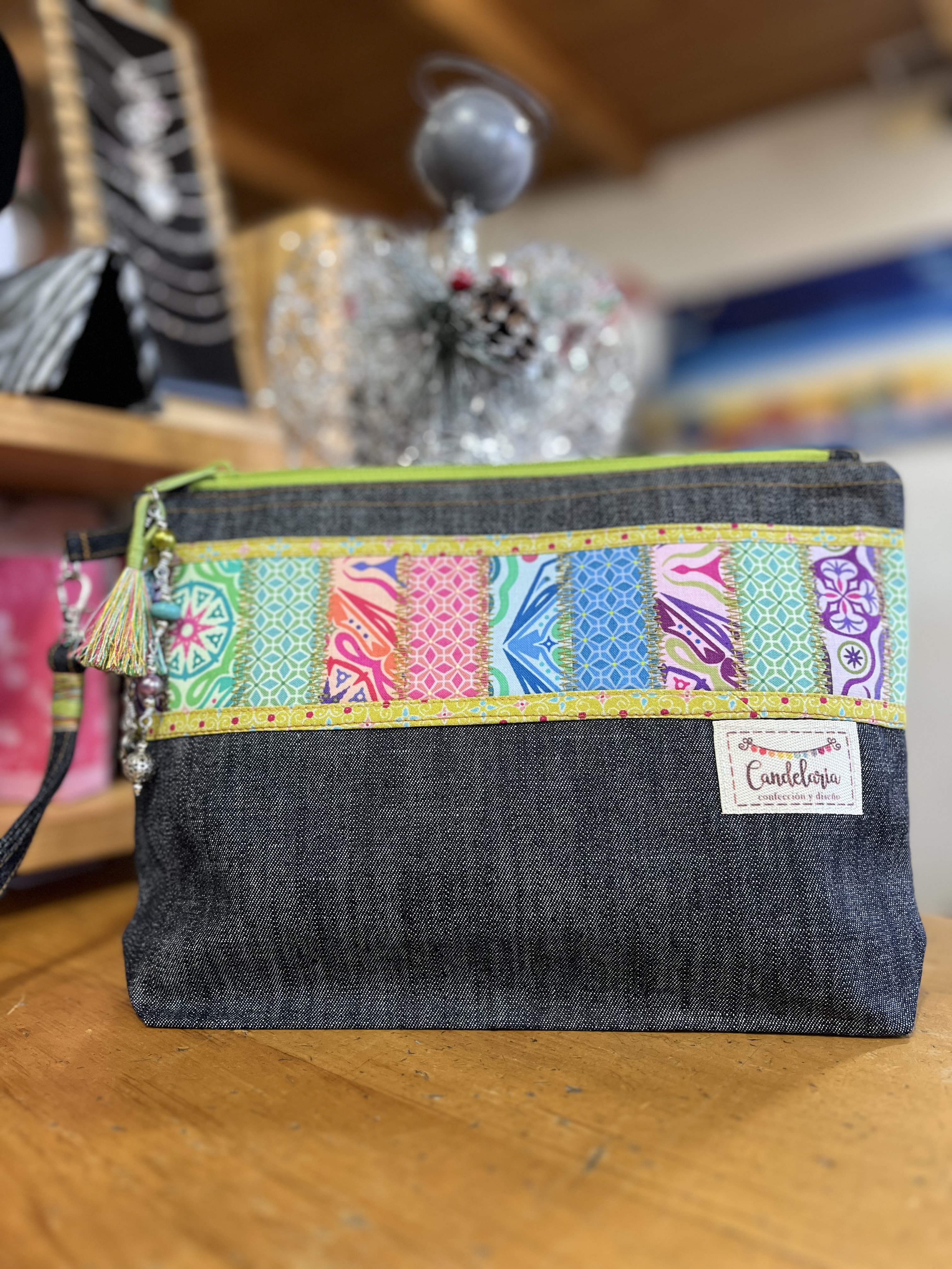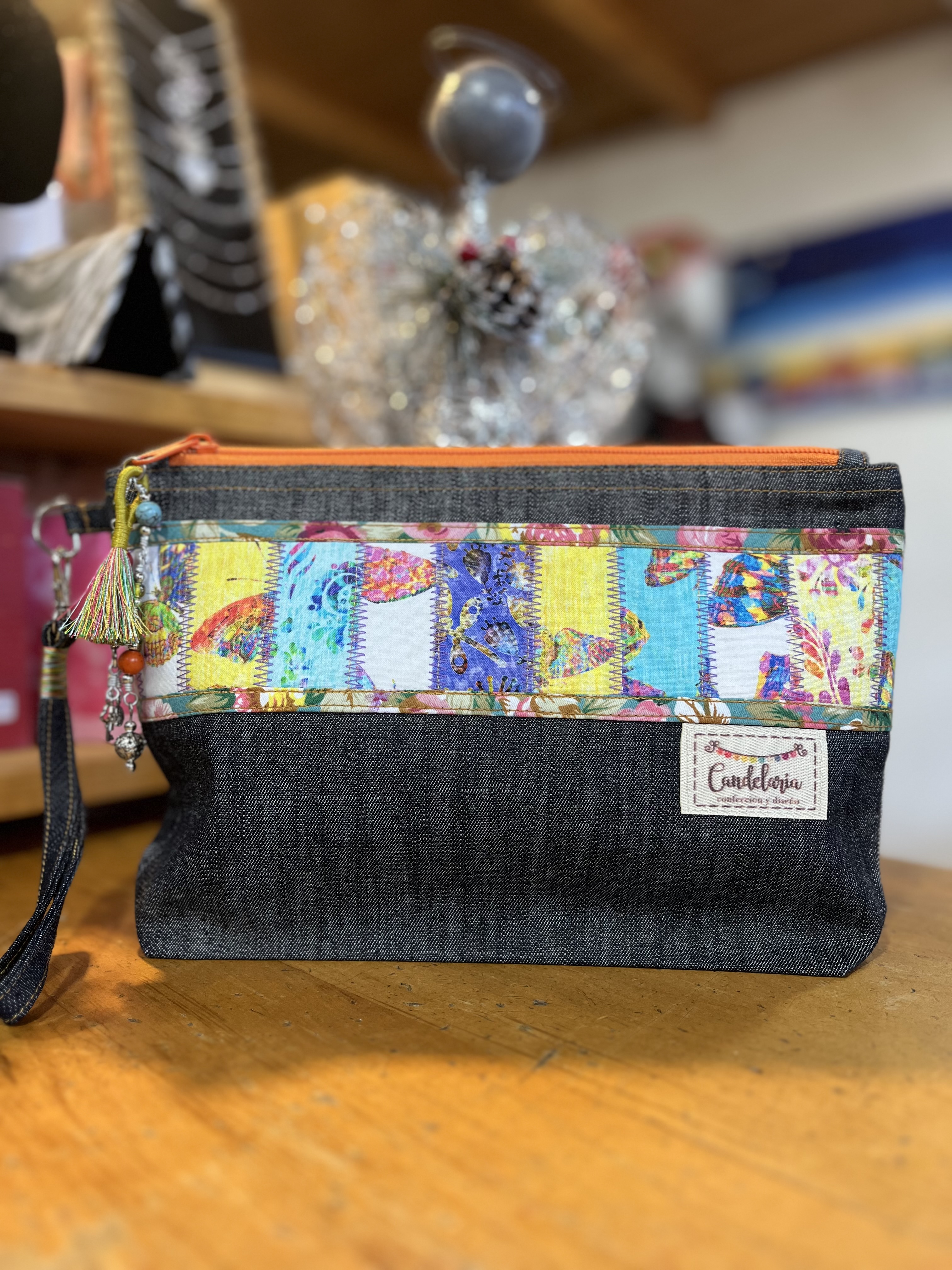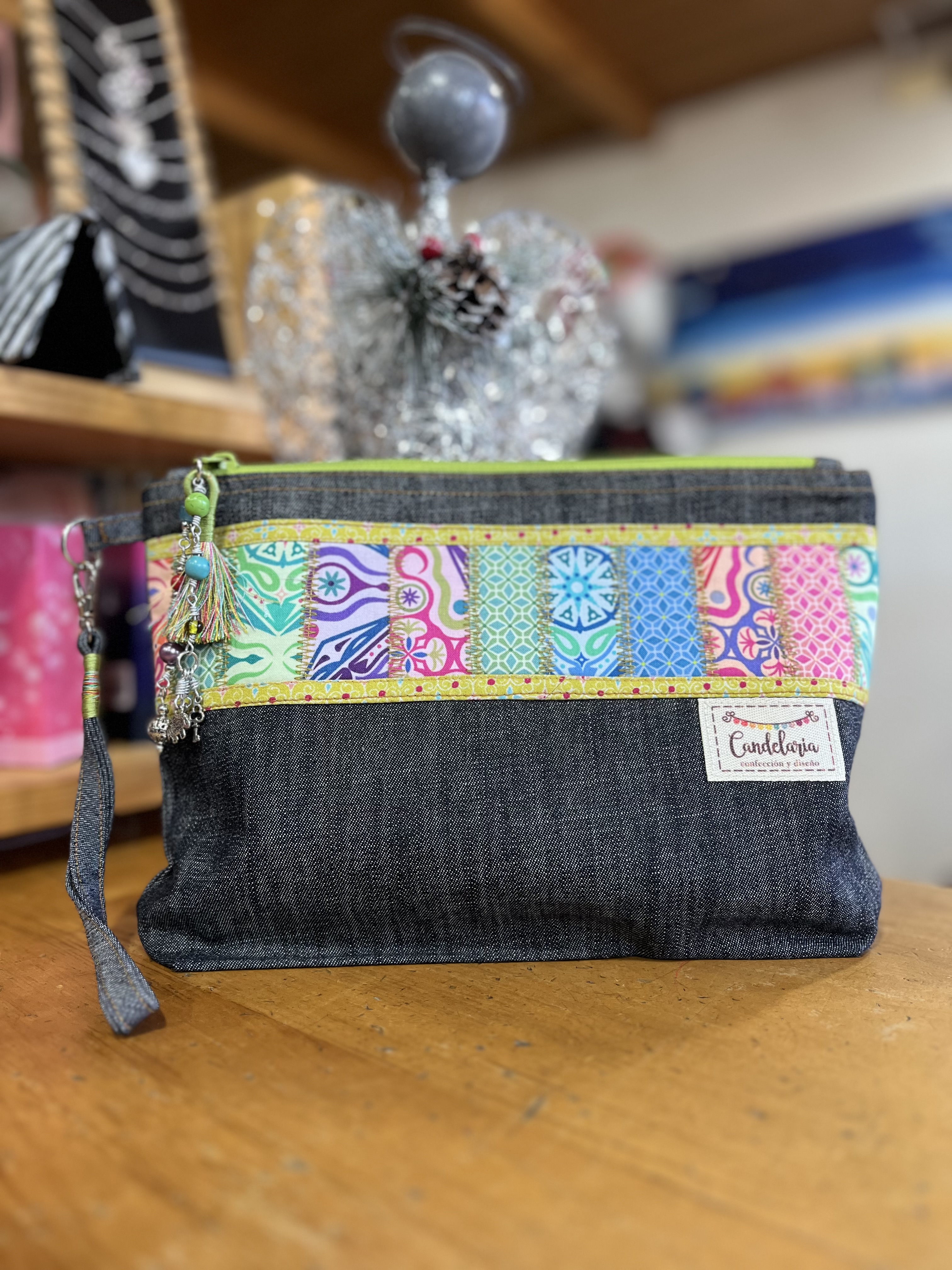 Estuche XL mosaico mezclilla y algodon con asa desmontable