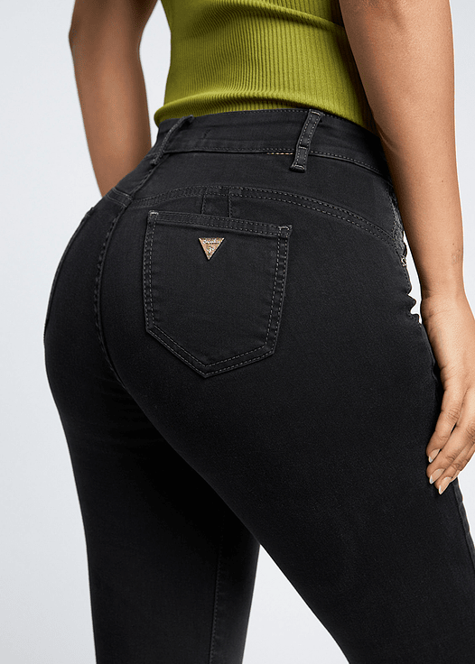 Ajuste de cintura alta, tela súper stretch, tejido full elástico, suave y cómodo, calce efecto push up con dos pinzas para crear una forma redondeada y realzar glúteos, pretina para 1 botón.