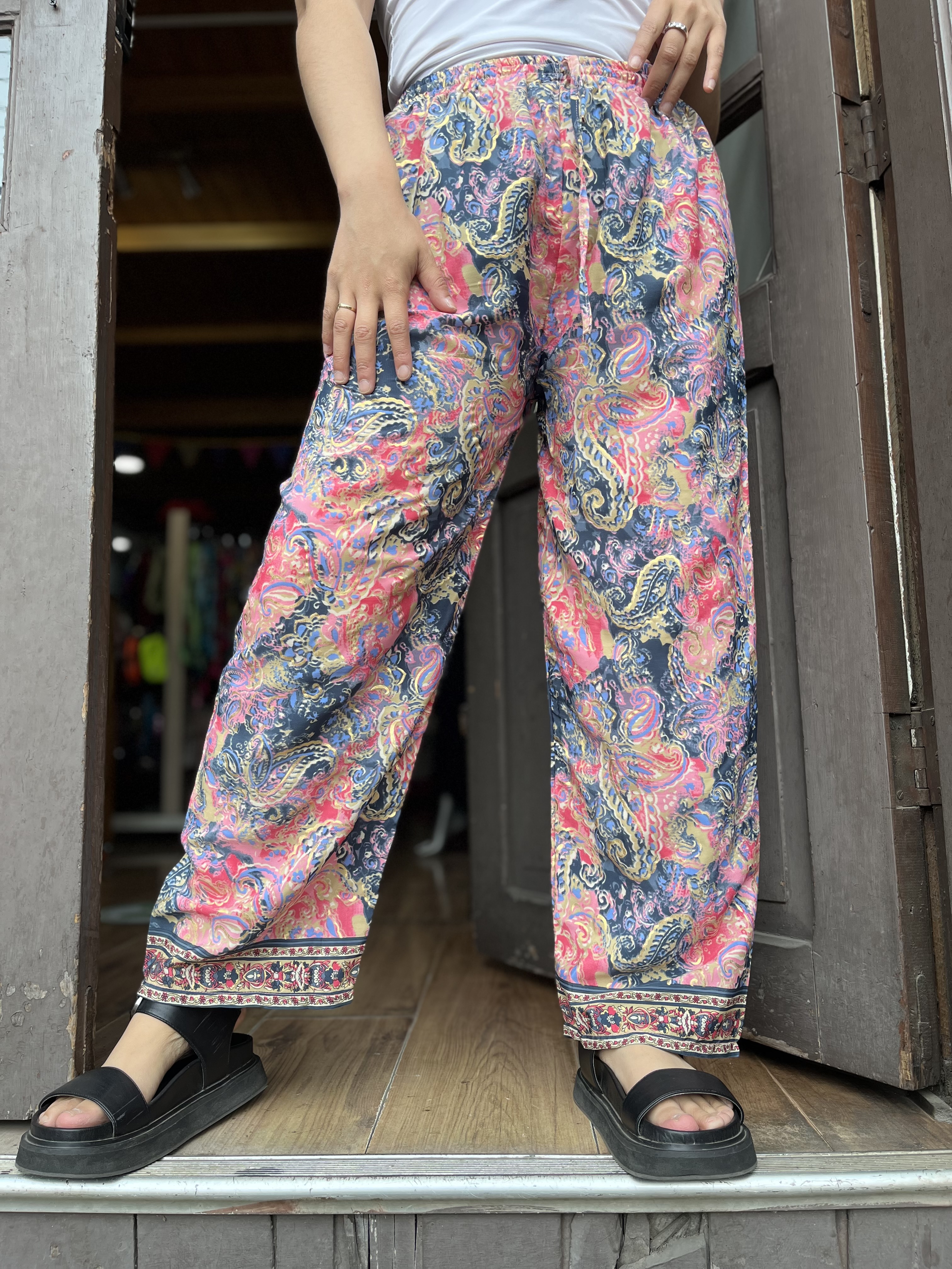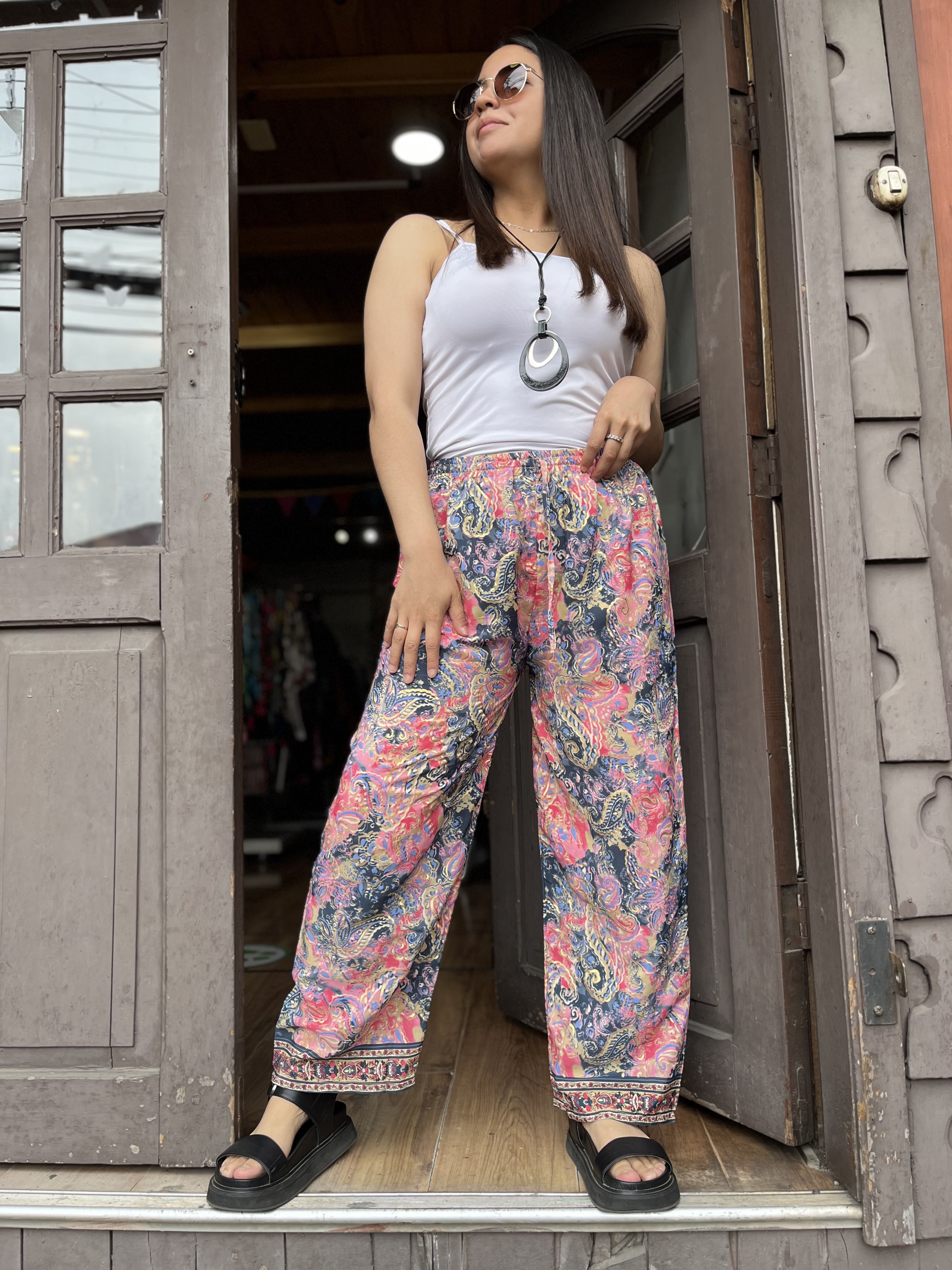 Pantalon India seda recto azul coral cintura elasticada