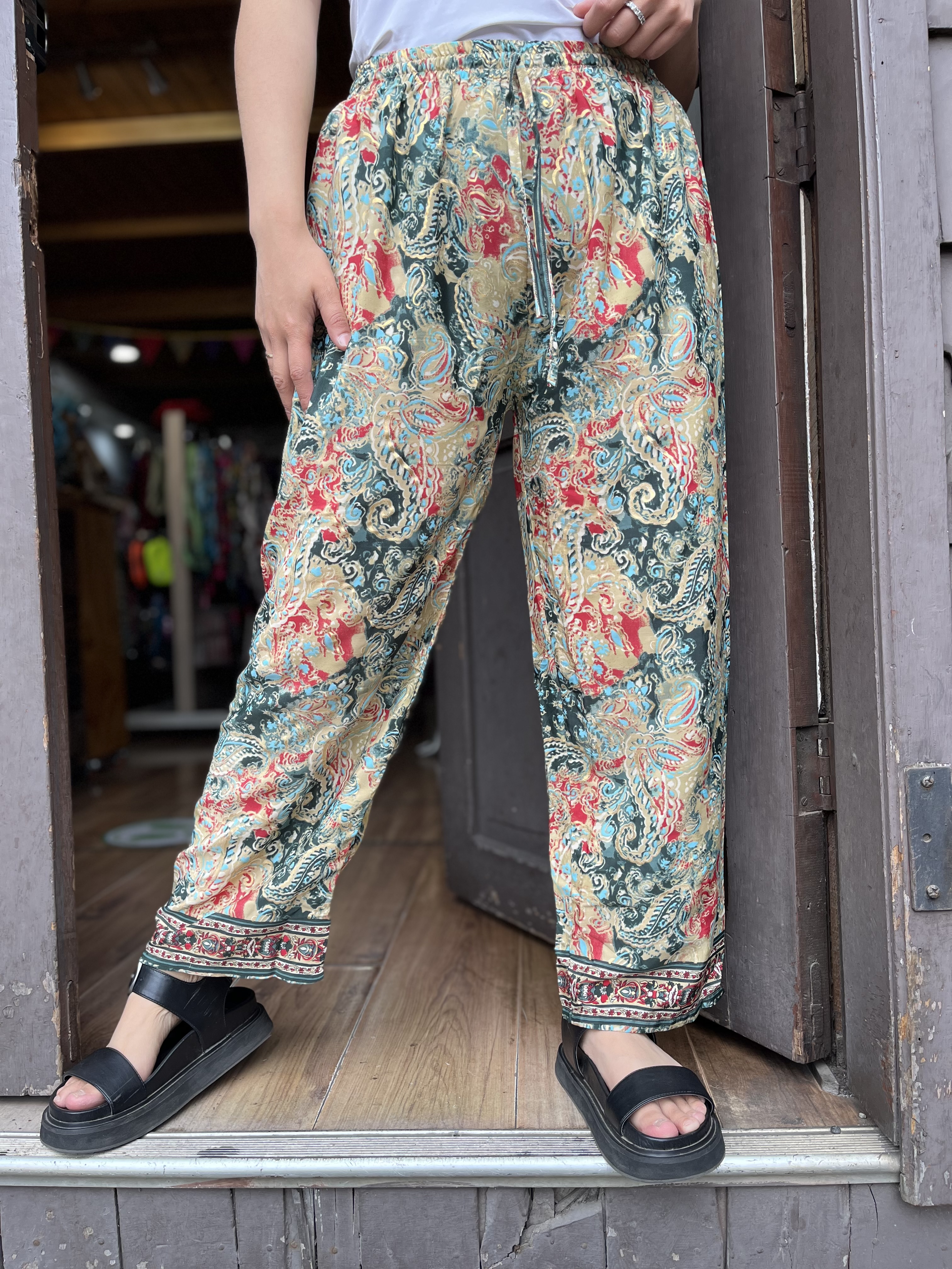 Pantalon India seda recto beige verde rojo cintura elasticada