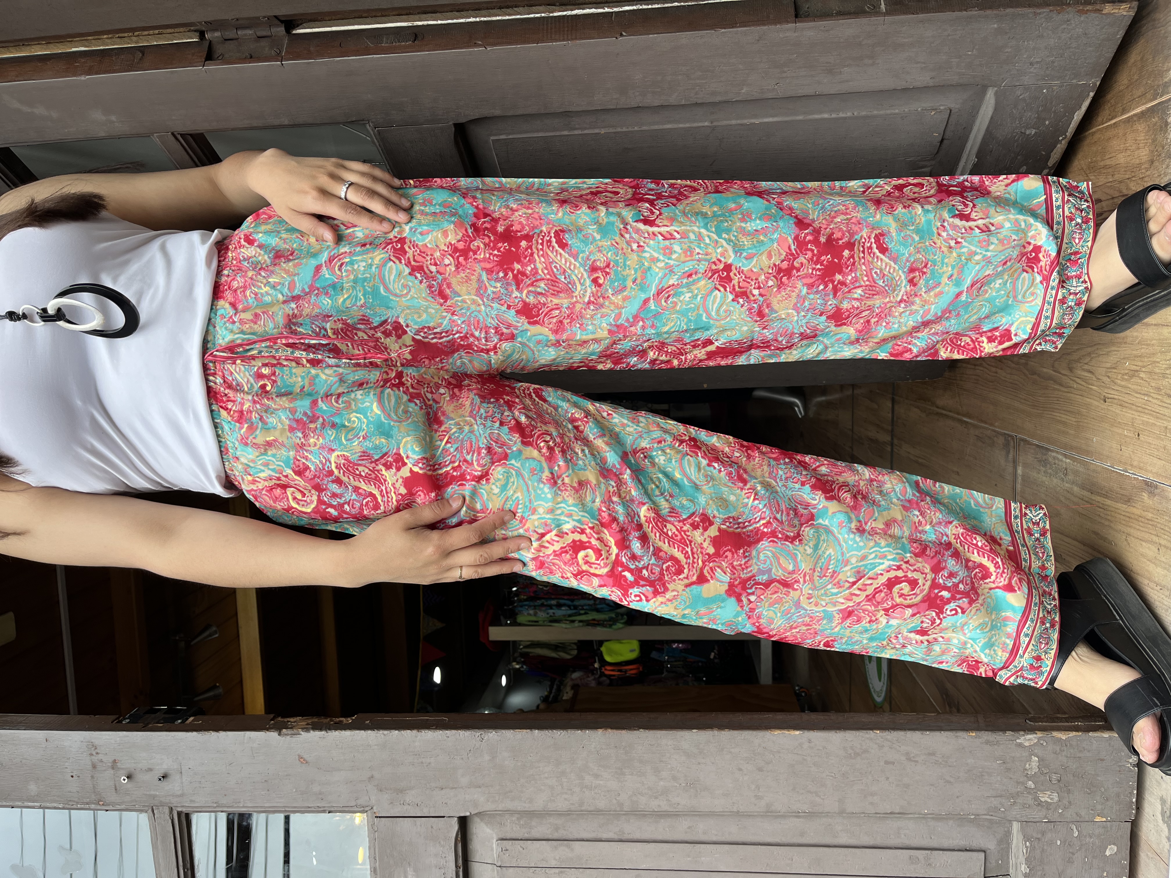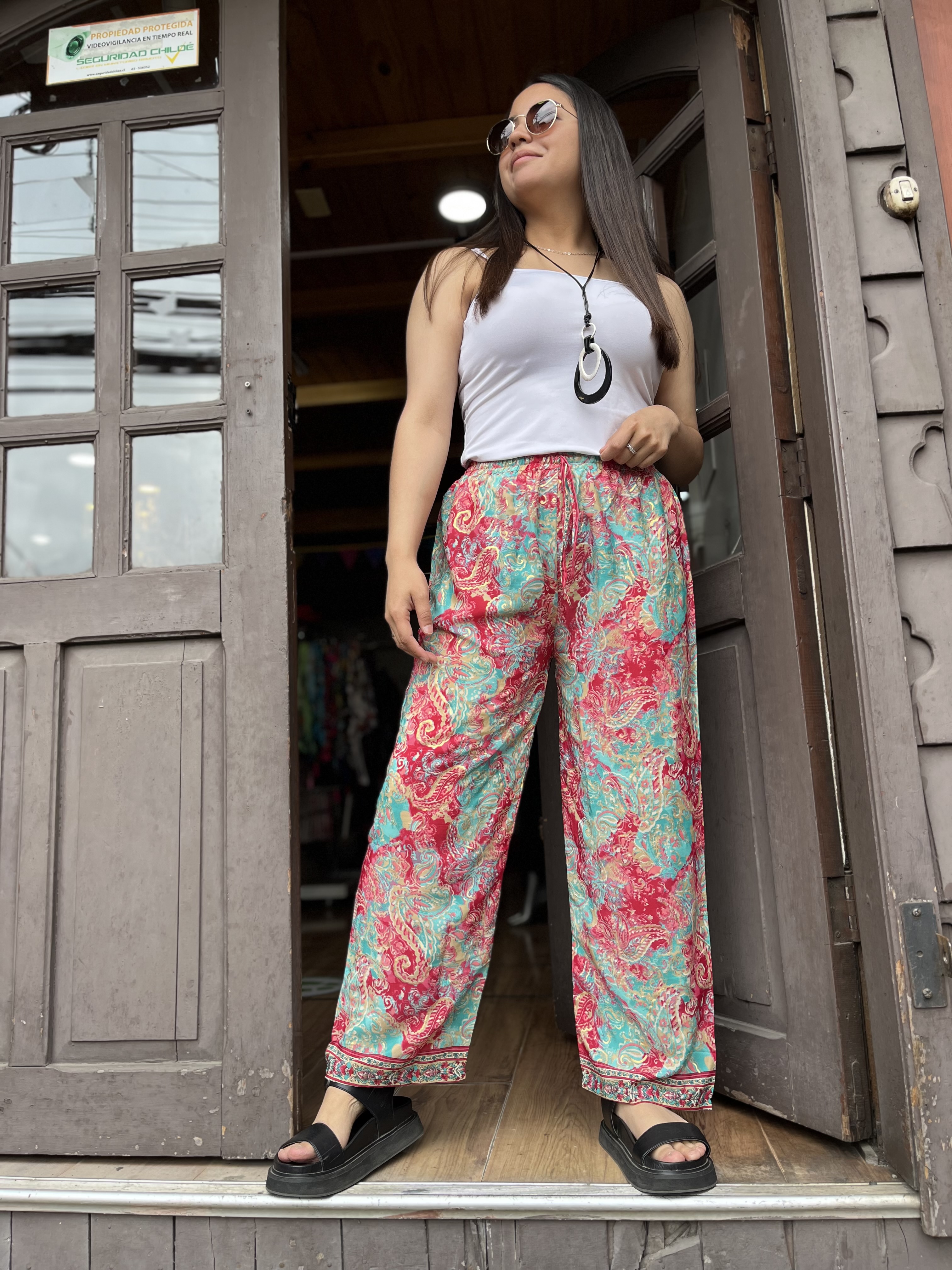 Pantalon India seda recto turquesa rojo cintura elasticada