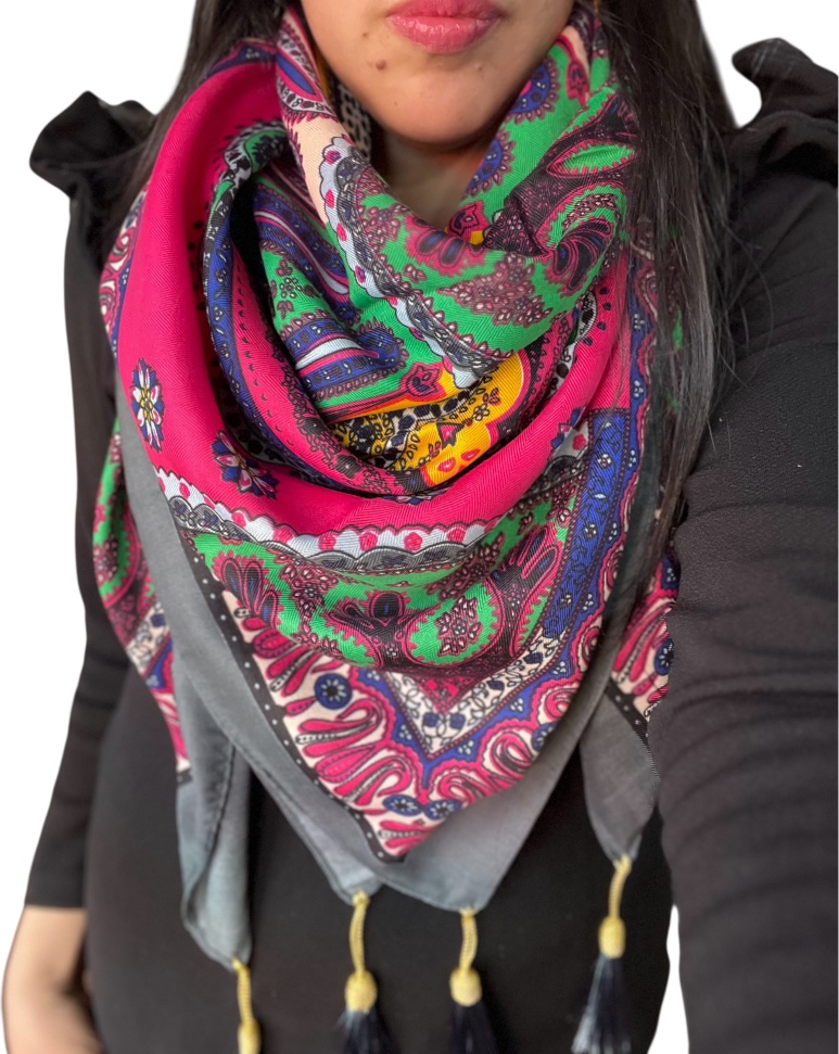 Pañuelo borlas 120*120 cms gris fucsia mandalas
