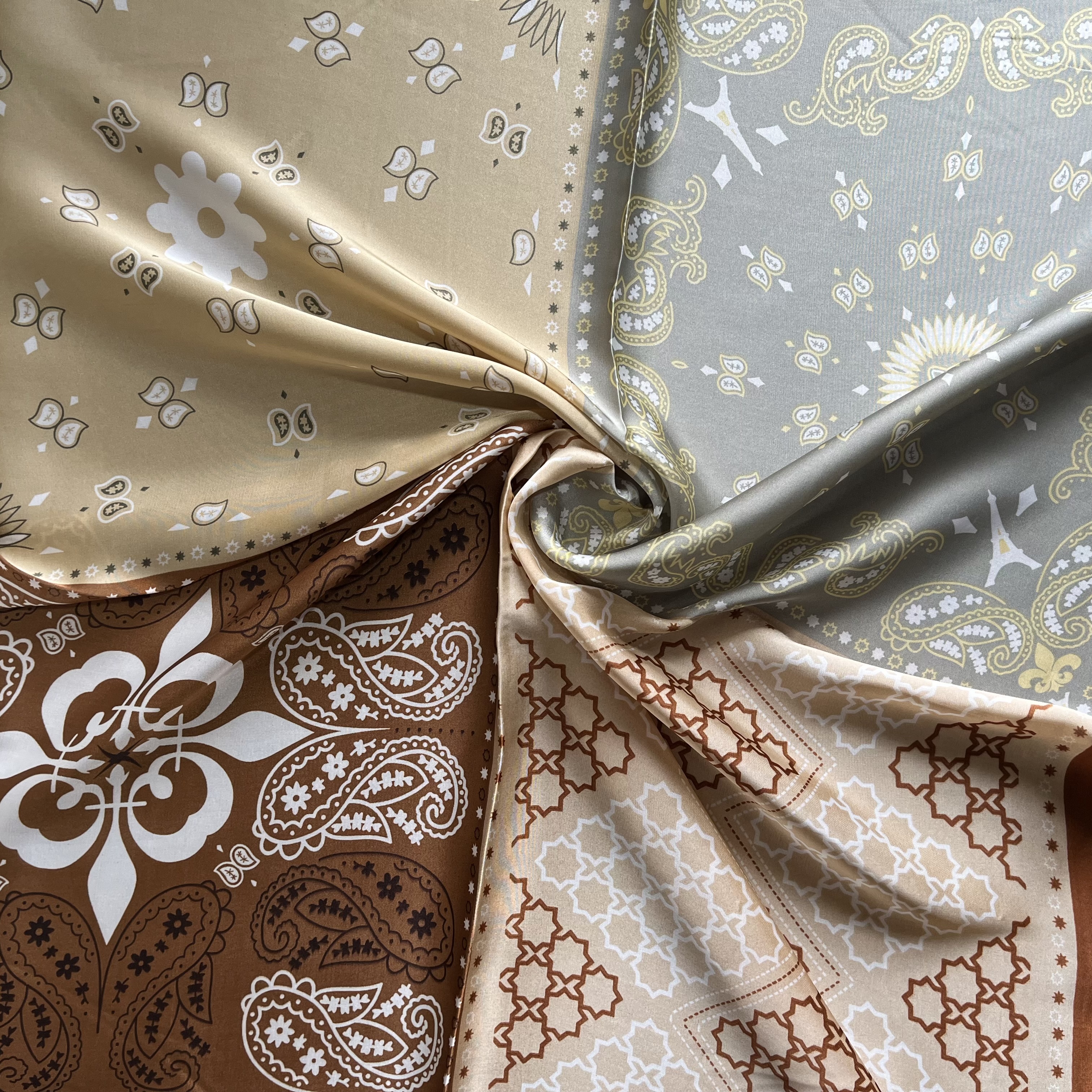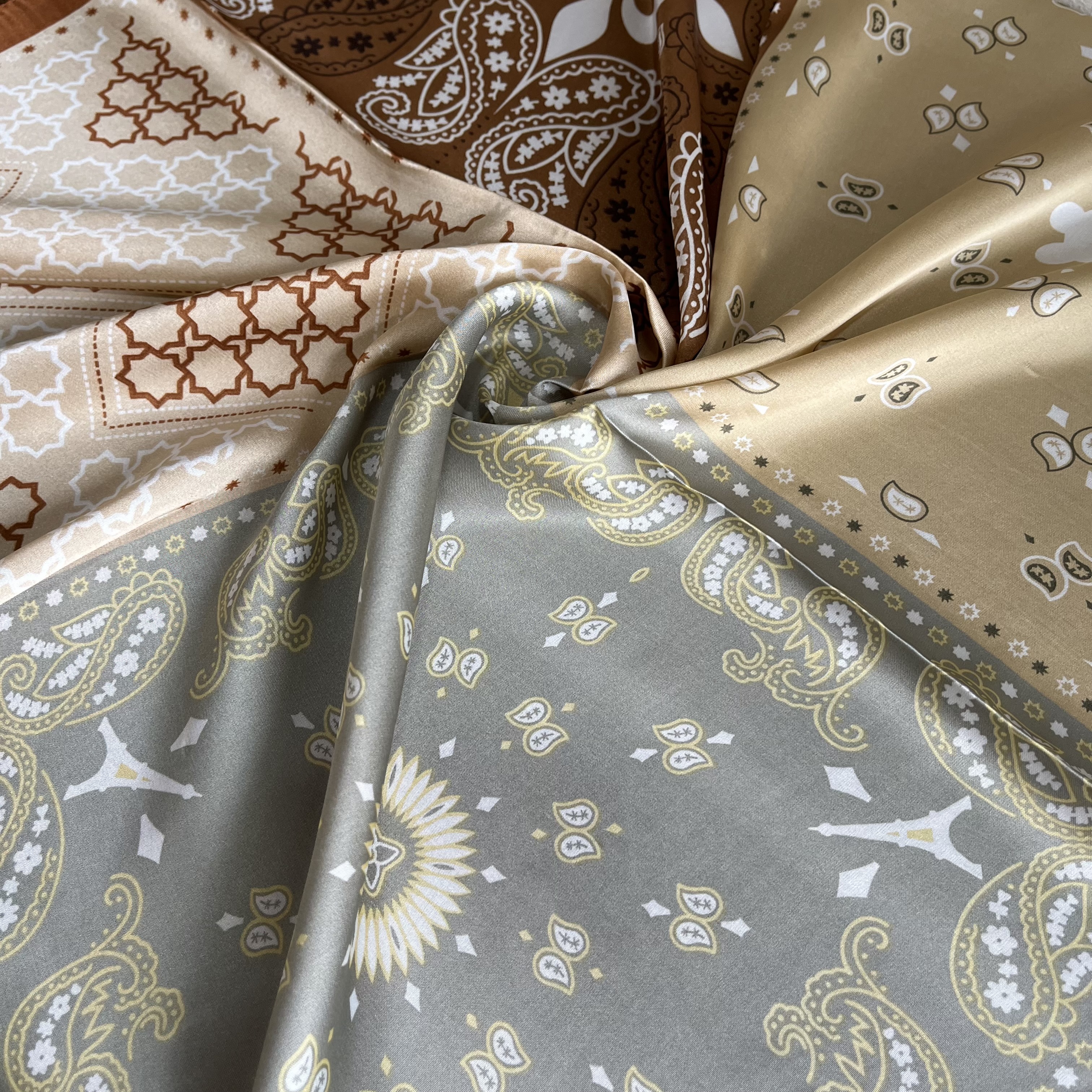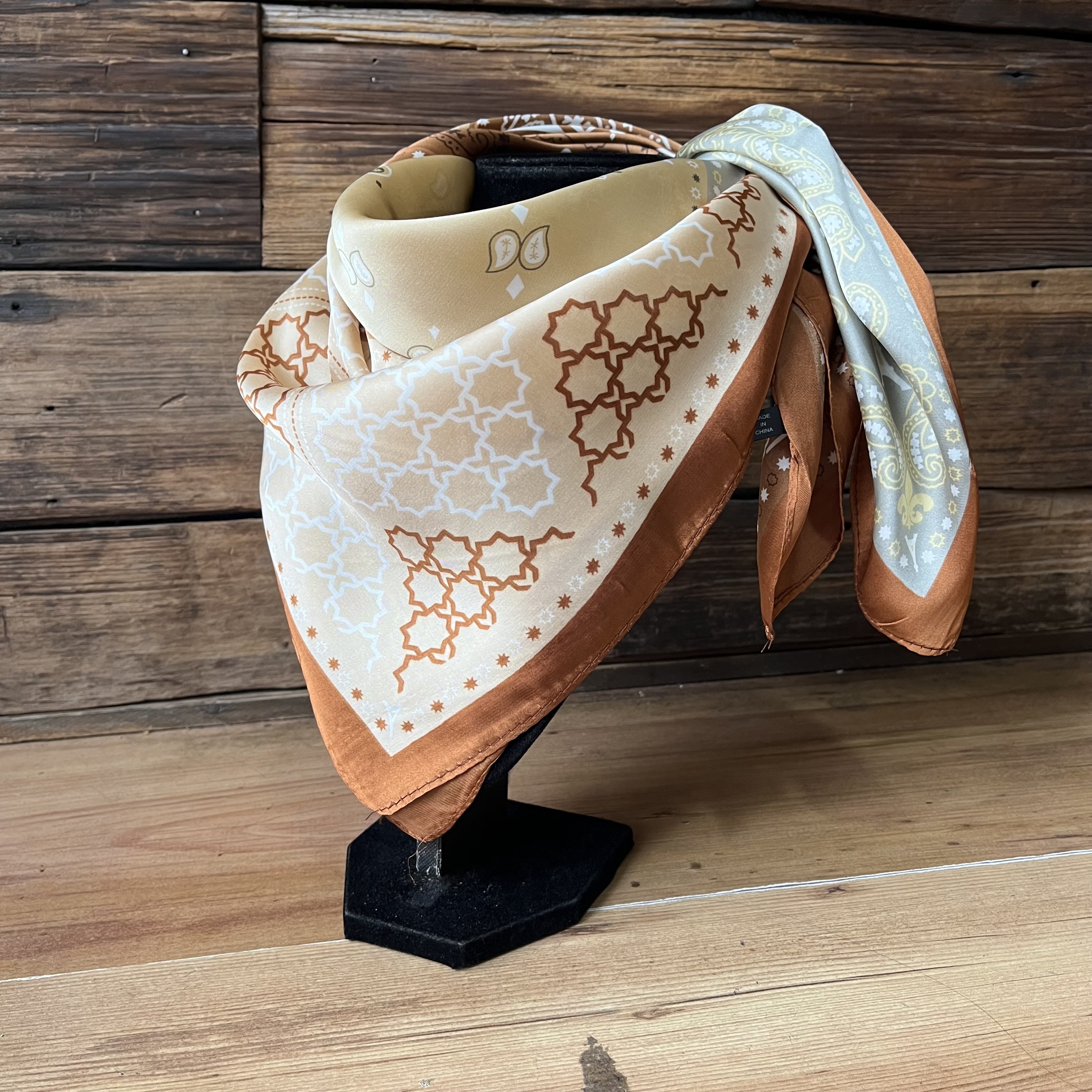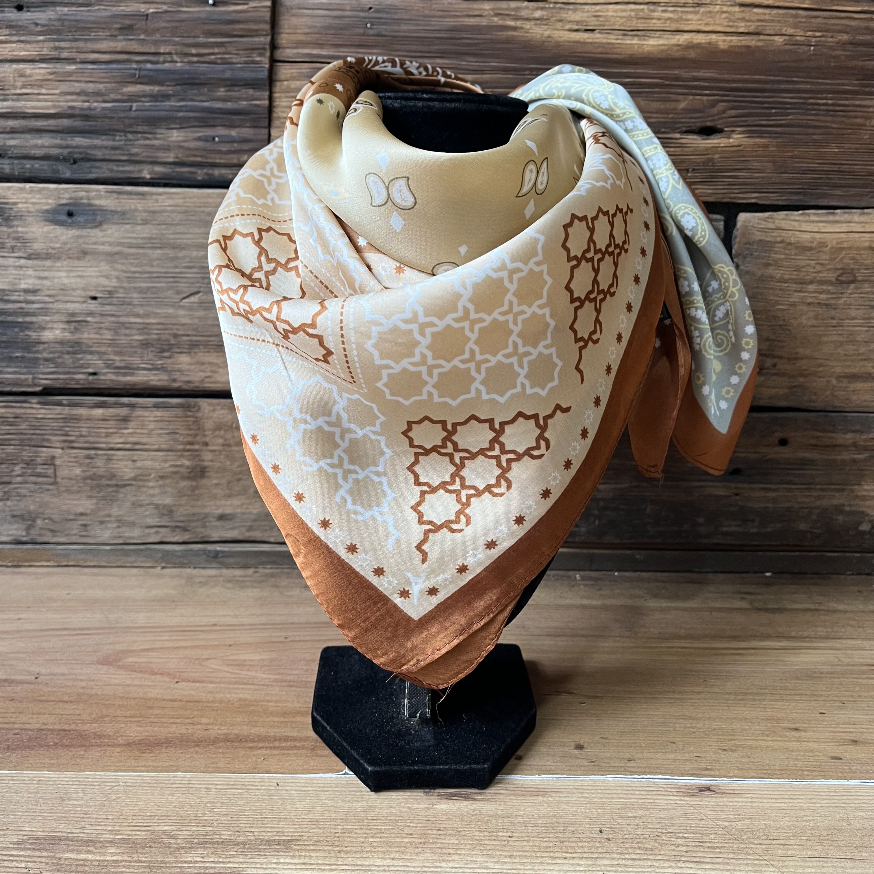Pañuelo seda 70*70 cms mosaico tribal bordes cafe