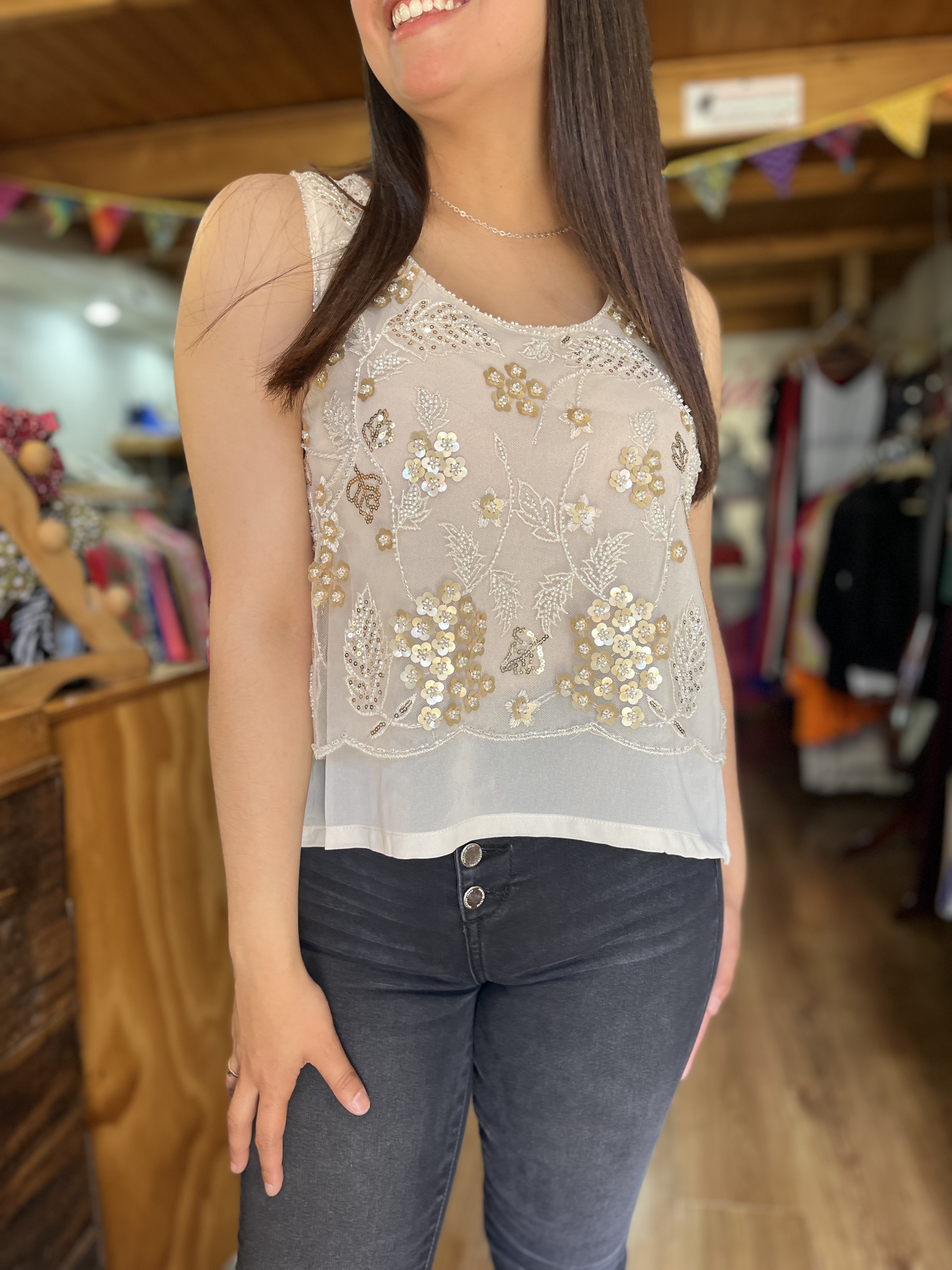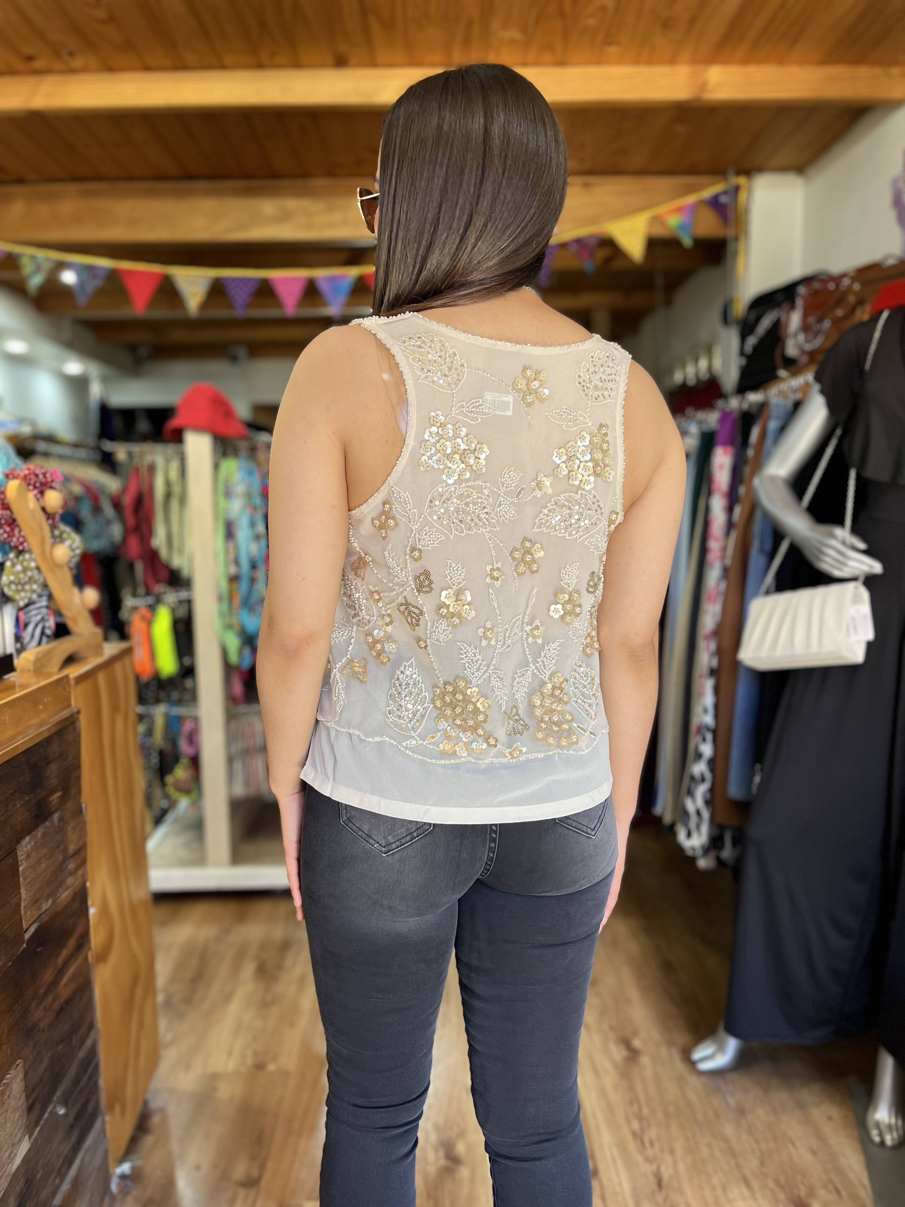 Polera bordado lentejuelas beige golden sin mangas