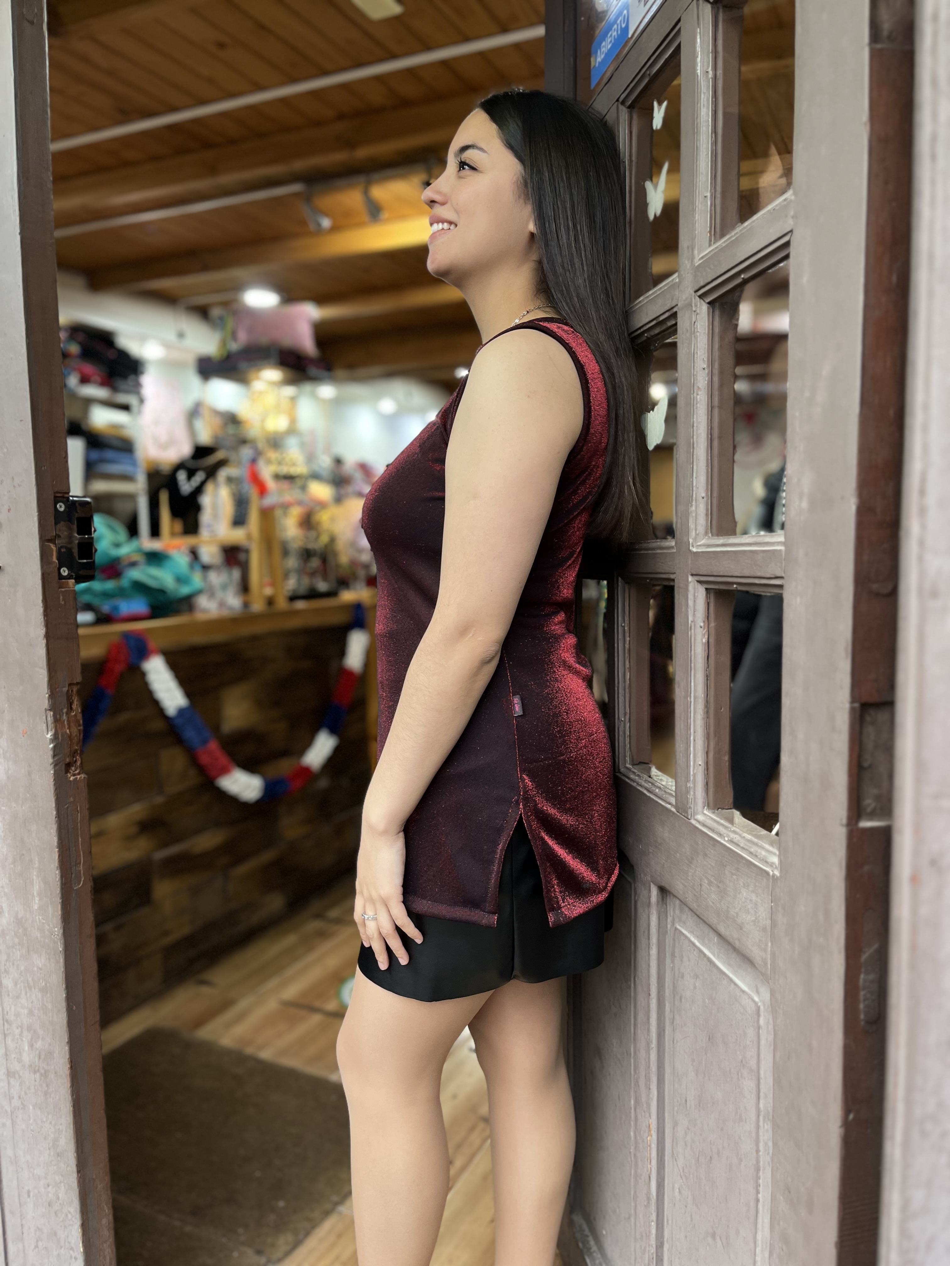 Polera brillo rojo negro sin mangas abertura lateral