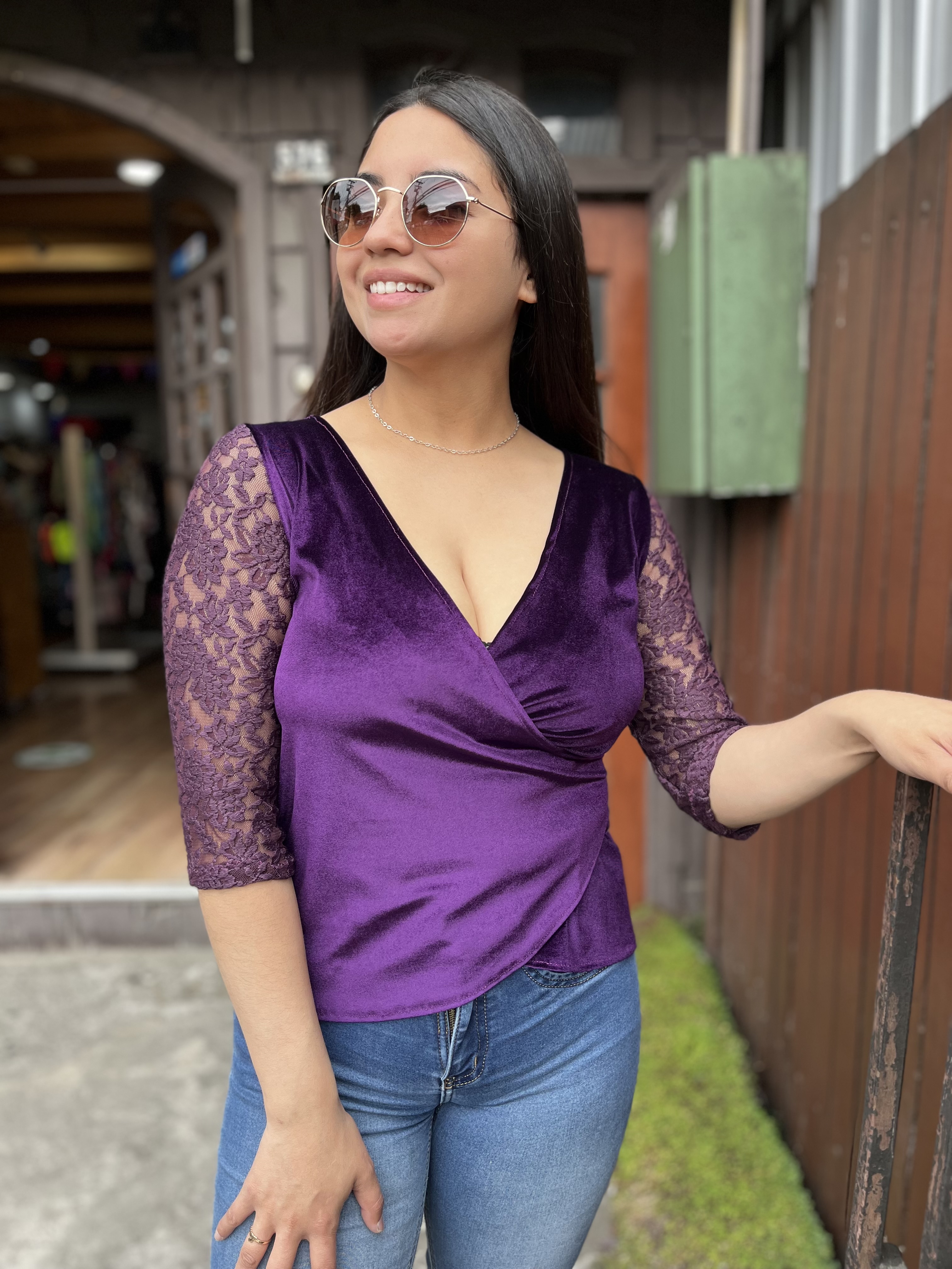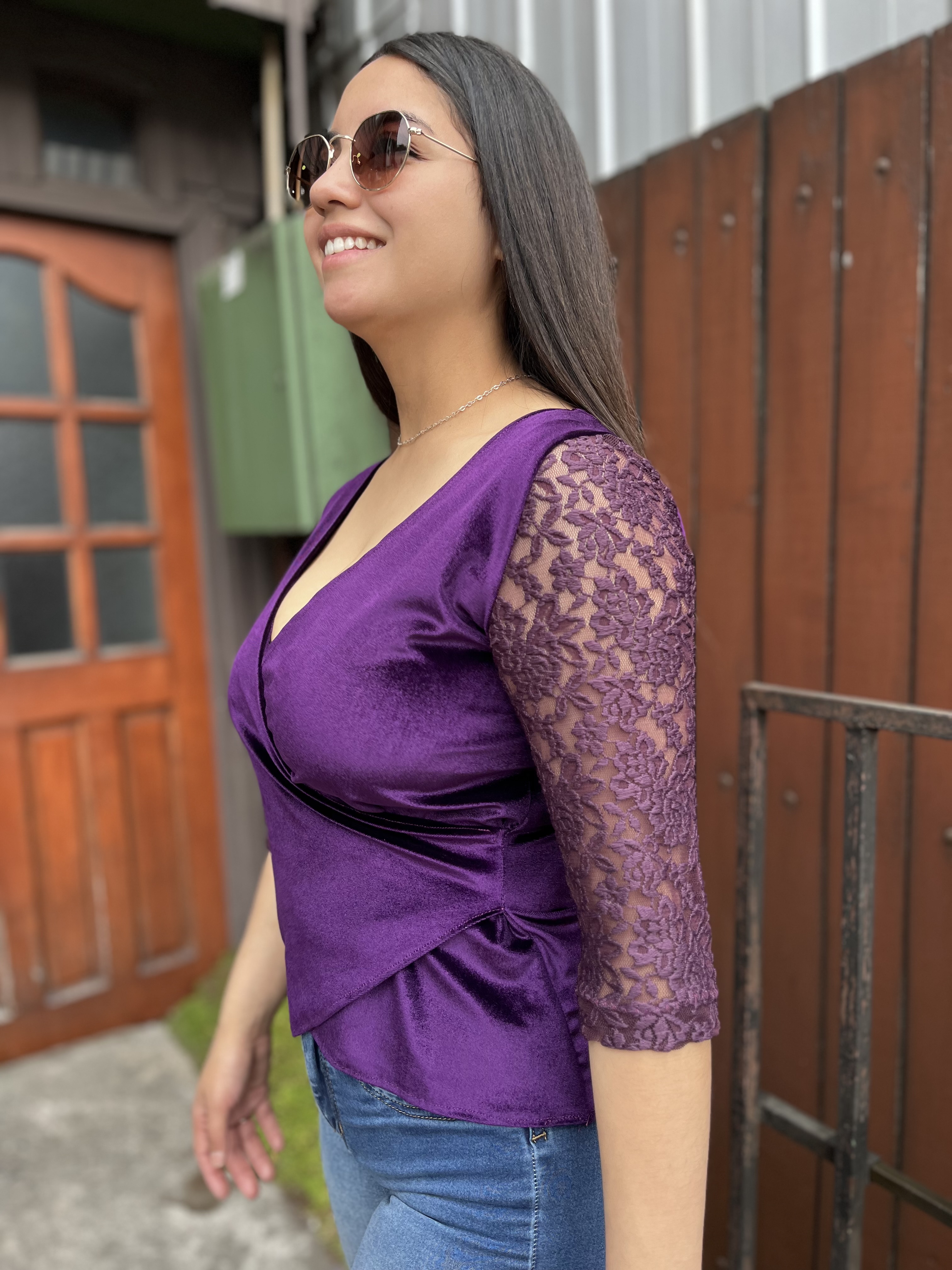 Polera Gloria morado velvet y encaje manga 3/4