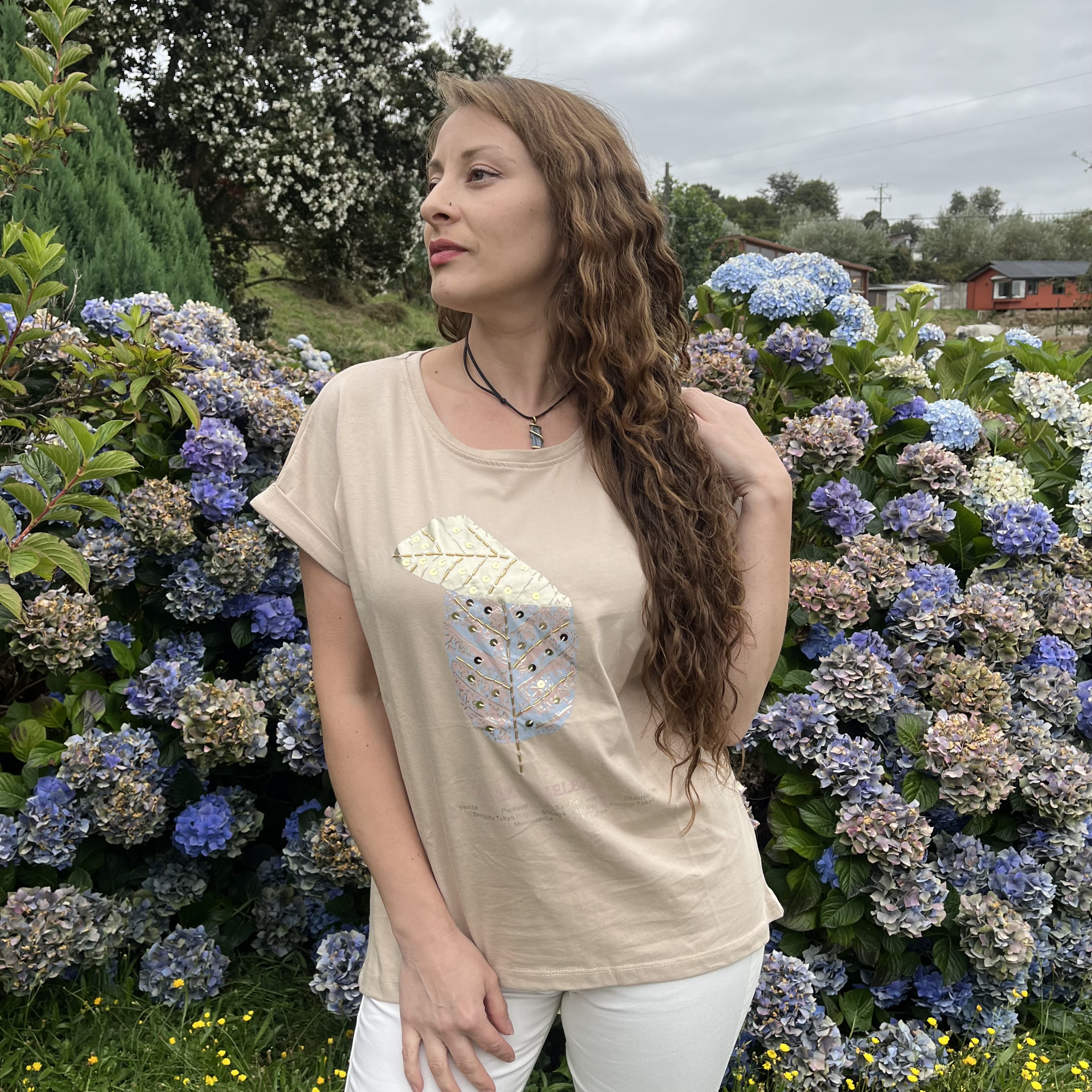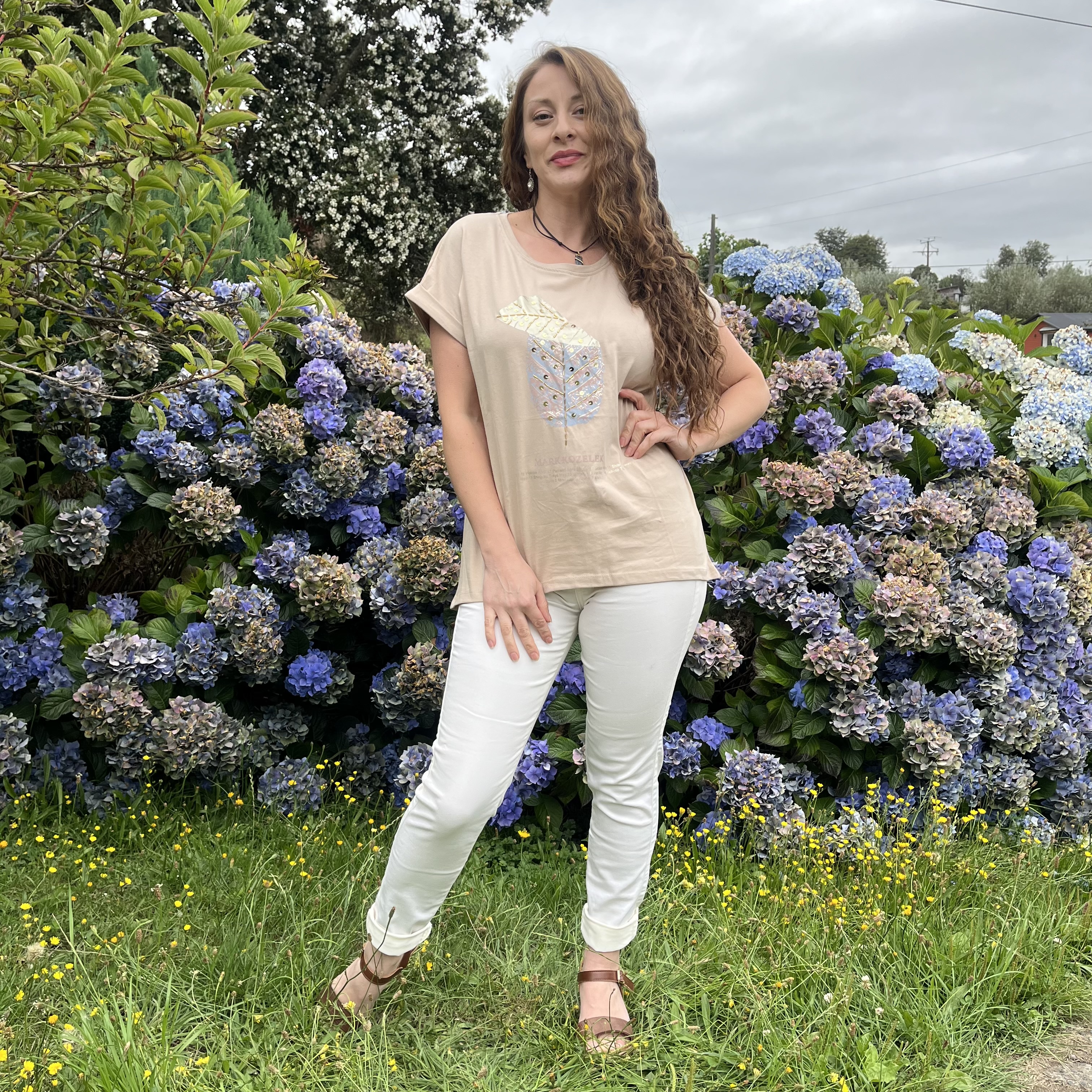 Polera lino y algodon beige estampado hoja brillo y lentejuelas