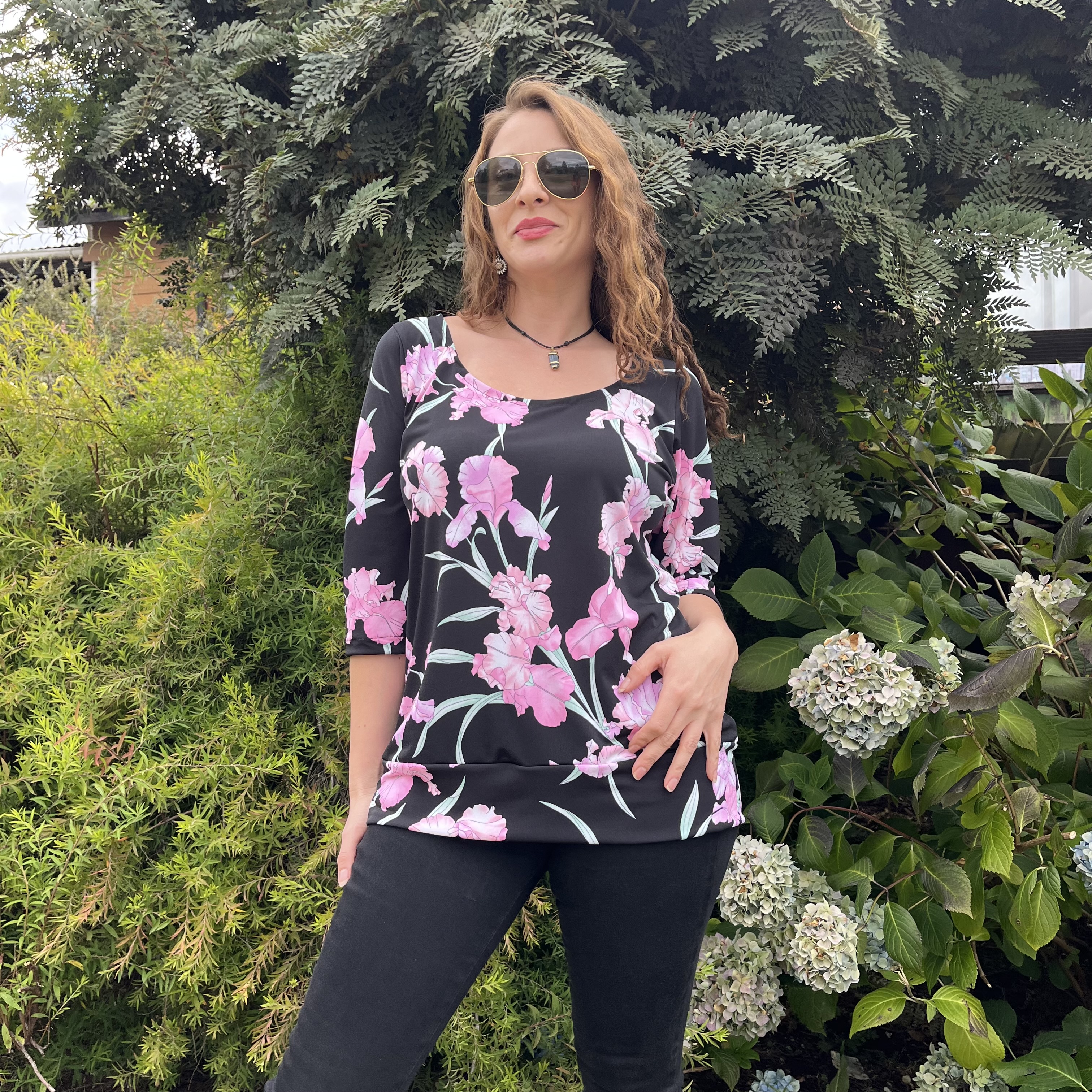 Polera Maria lycra negro floral rosado