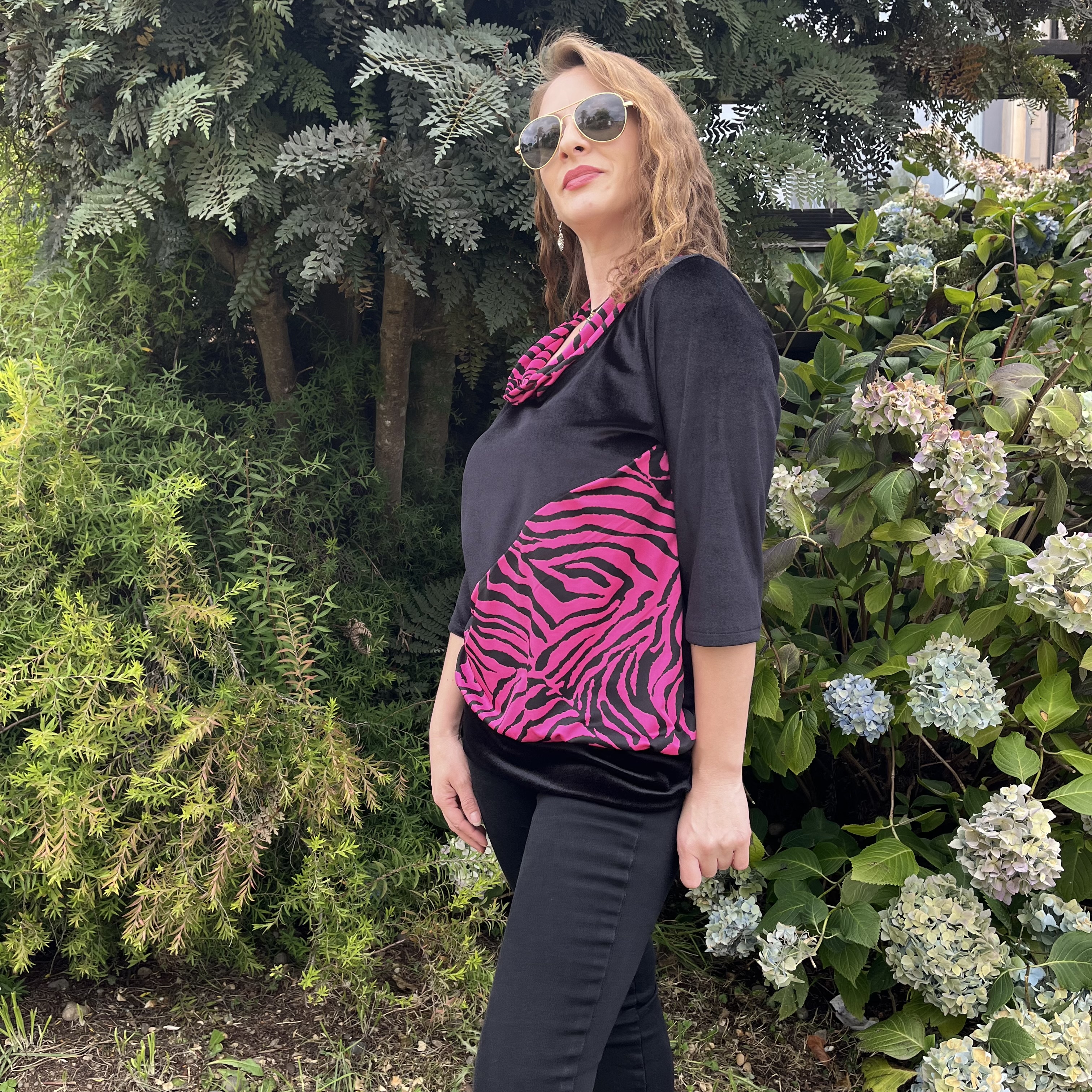 Polera Marina velvet negro cebra fucsia
