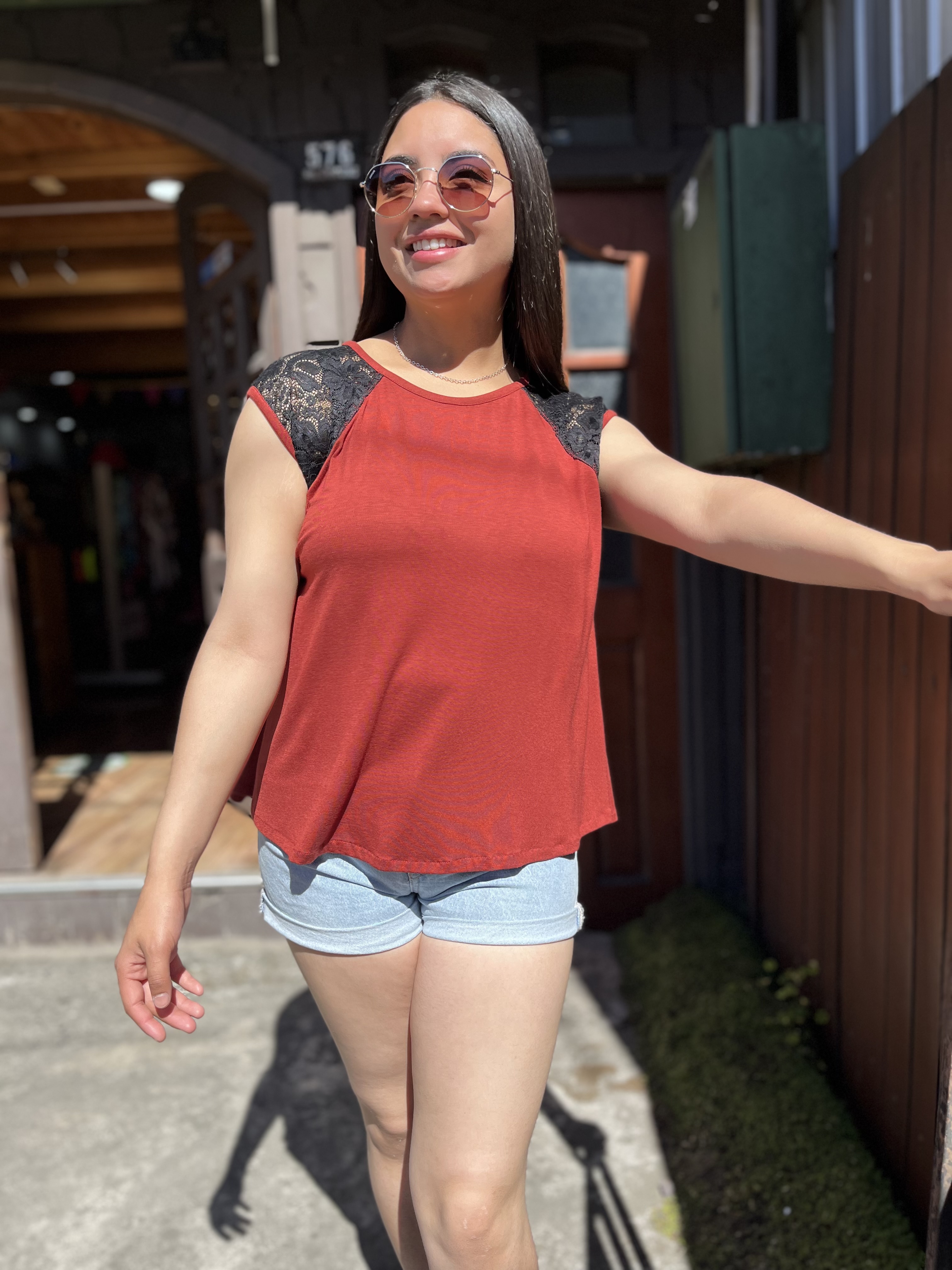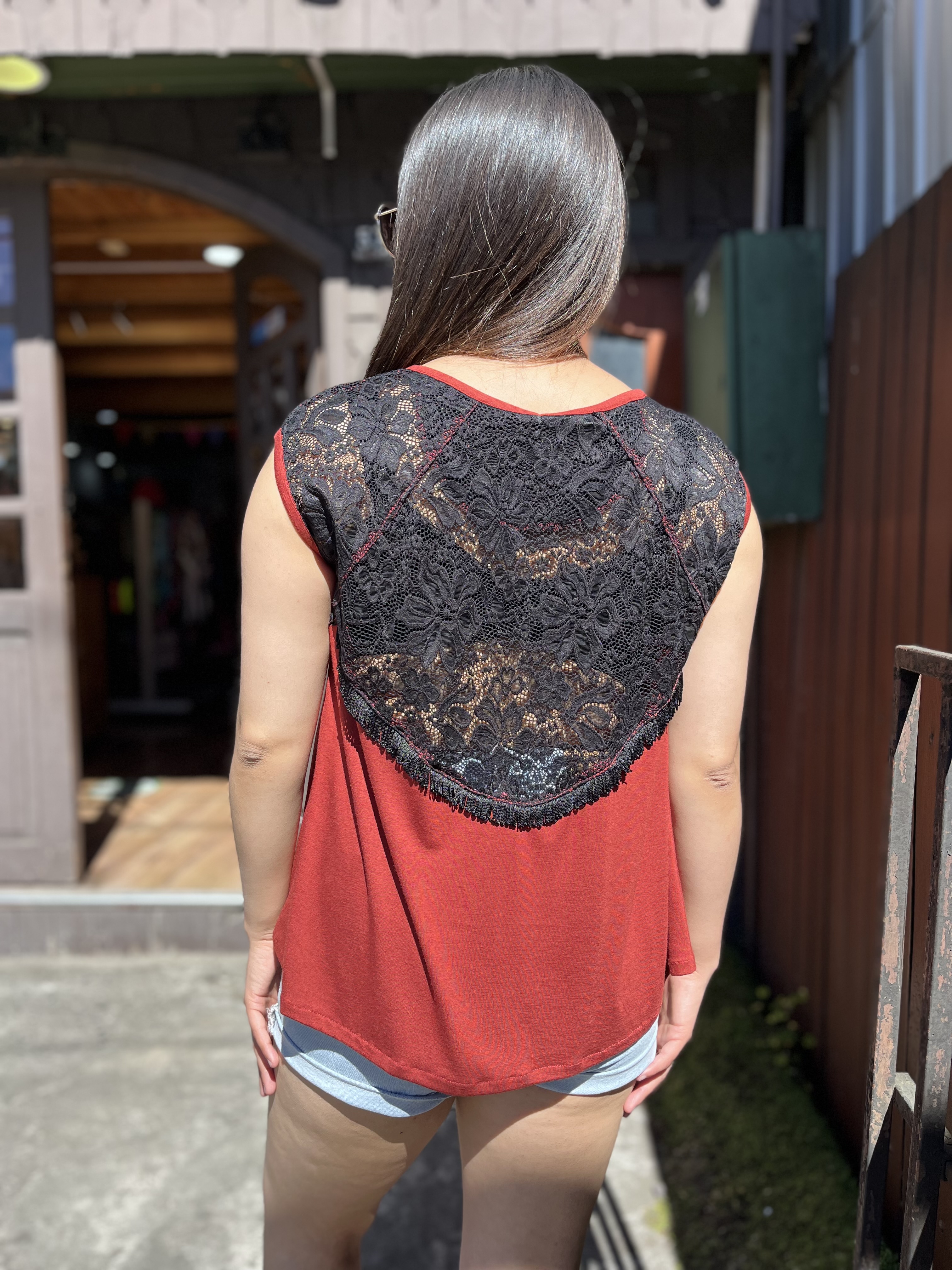 Polera Ultravioleta Olivia terracorta encaje negro algodón manga corta