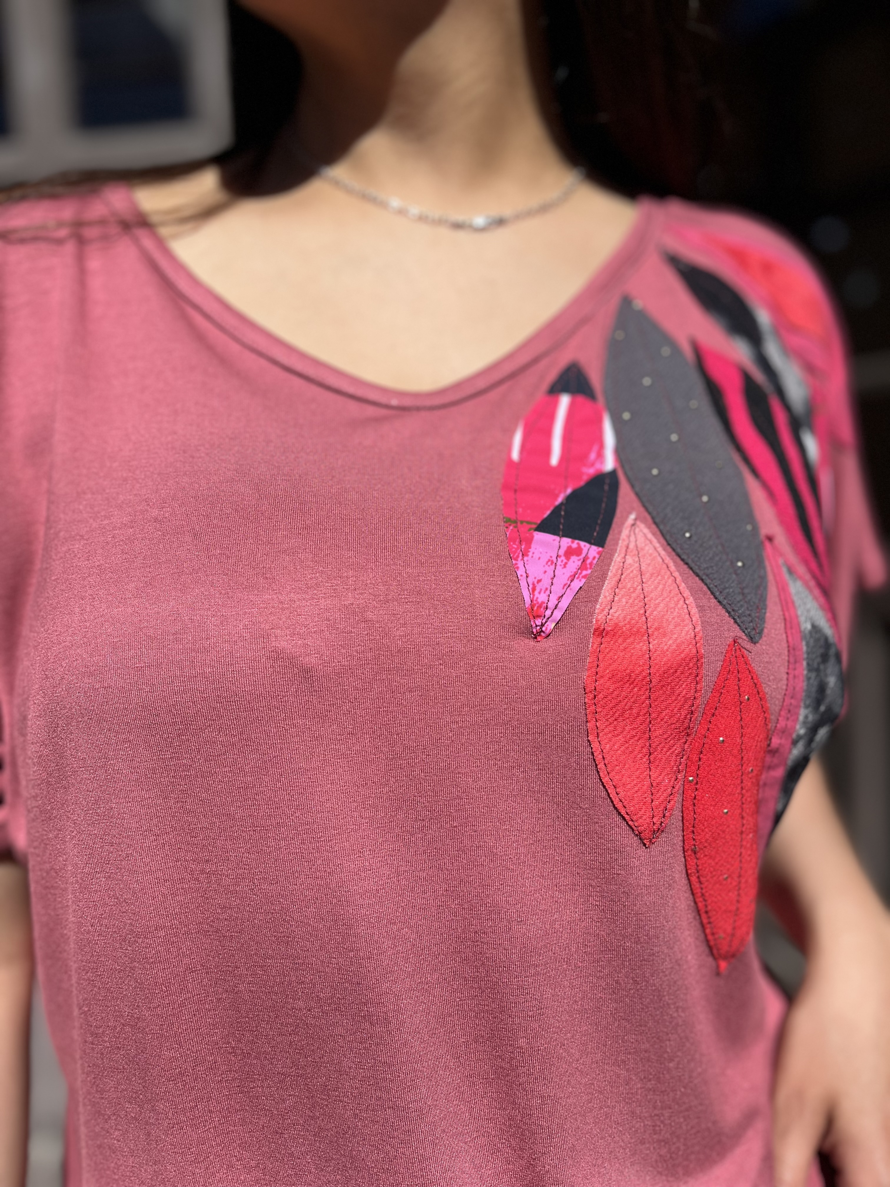 Descubre nuestra hermosa polera de manga corta, confeccionada en una suave mezcla de modal y algodón que ofrece una comodidad excepcional. Esta prenda única se destaca por su hermosa composición de hojas aplicadas a mano, cada diseño es exclusivo, garantizando que lleves un look auténtico y original.