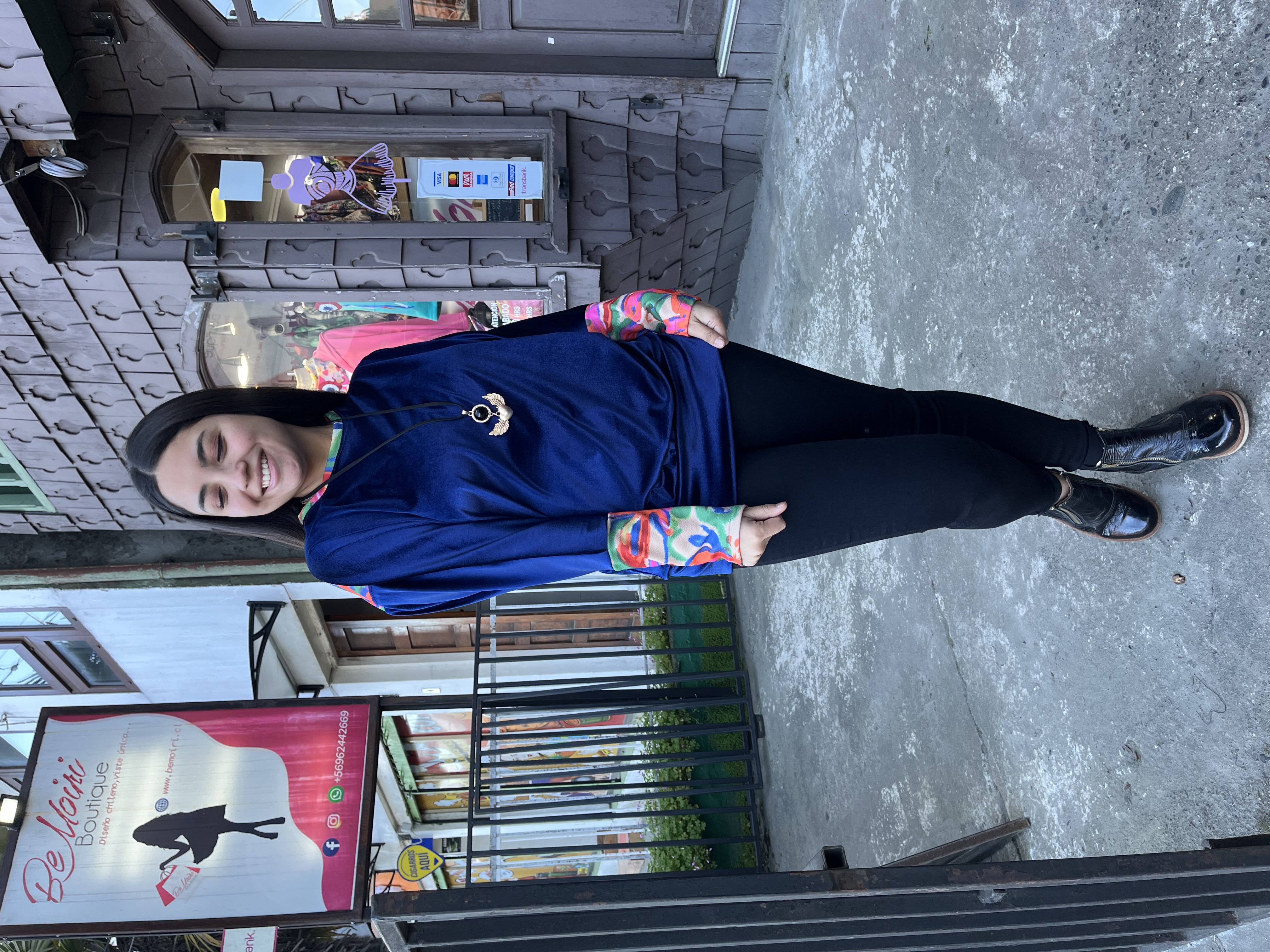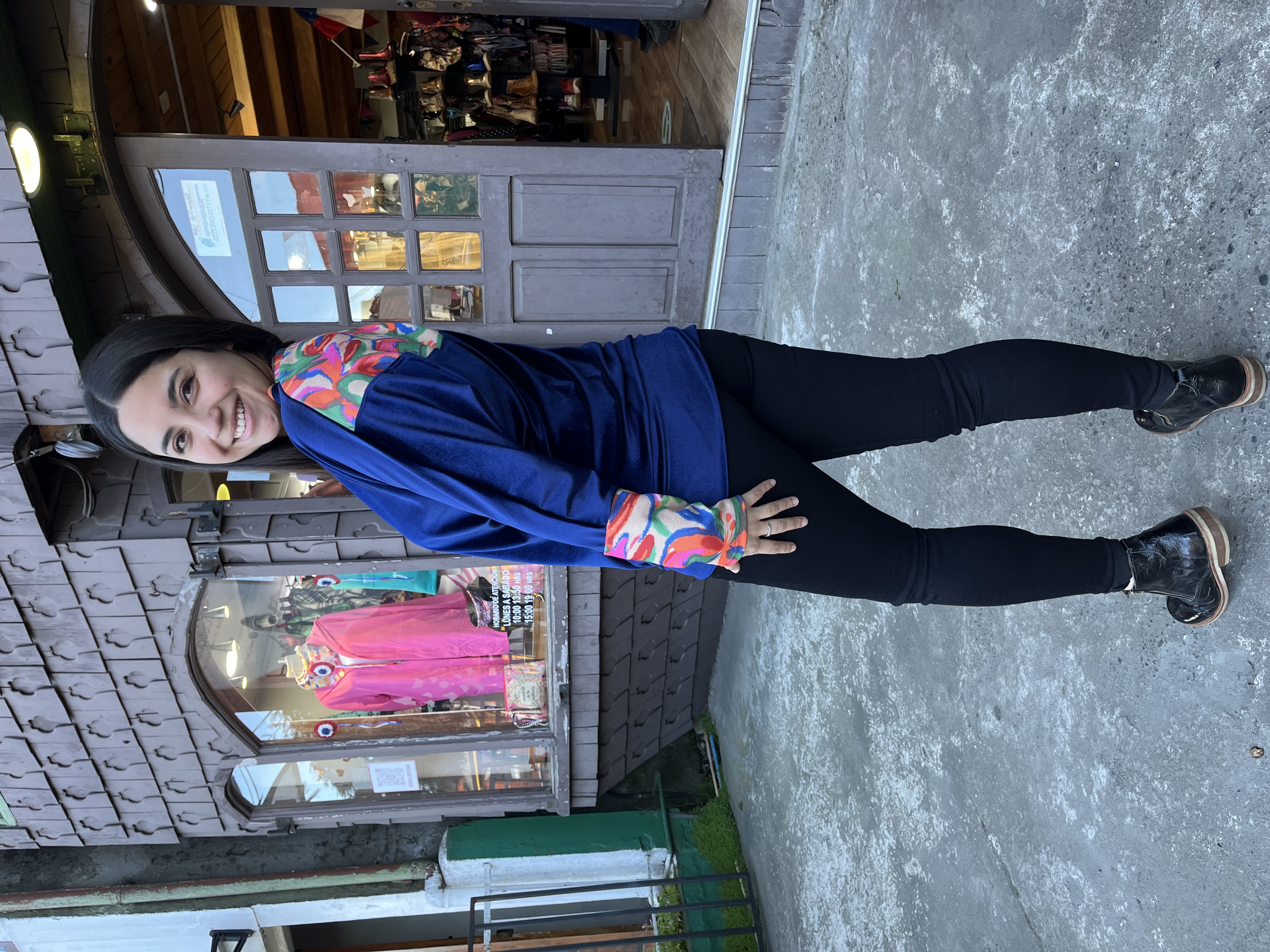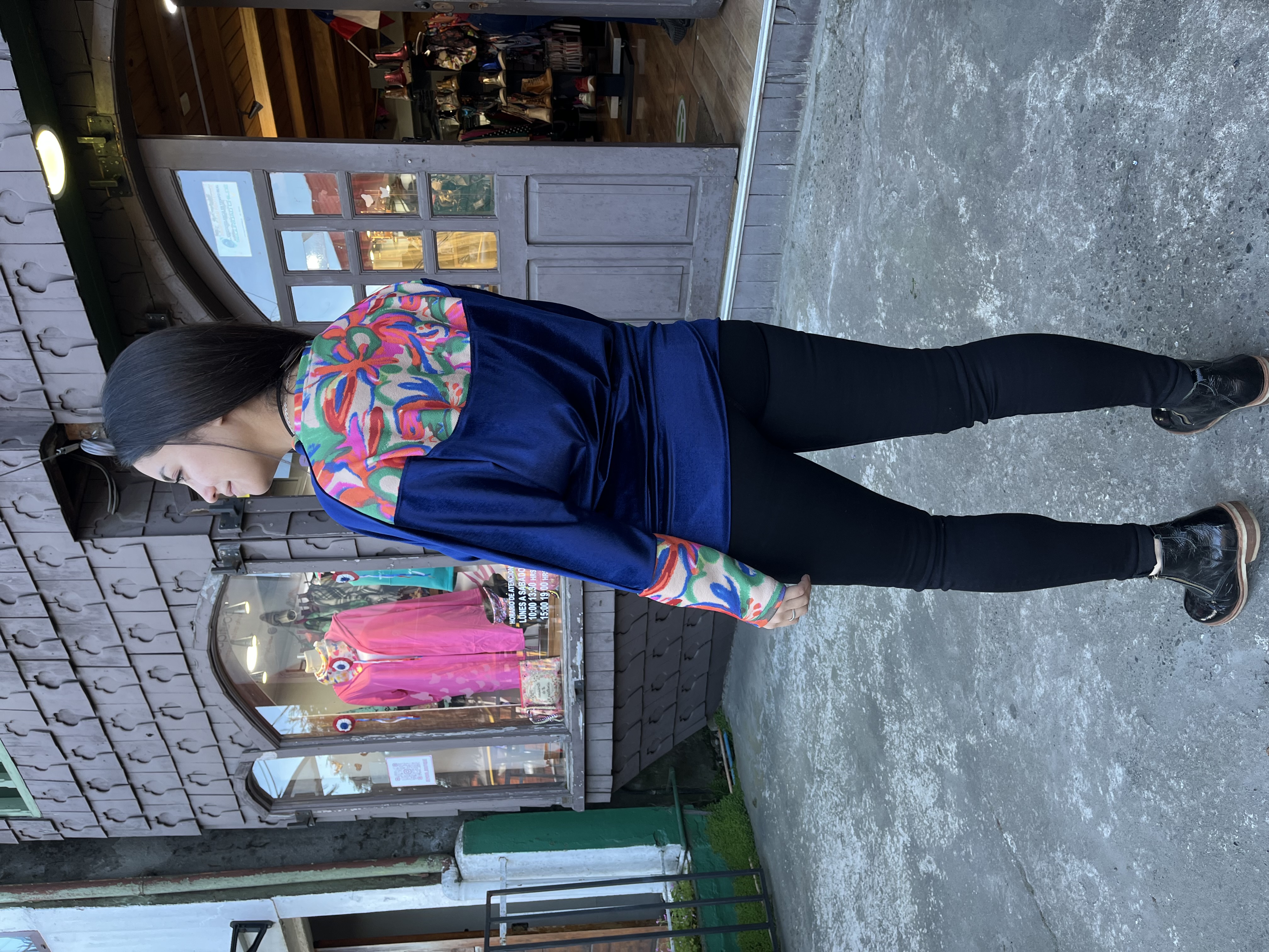 Poleron murcielago velvet azul francia aplicación estampada floral
