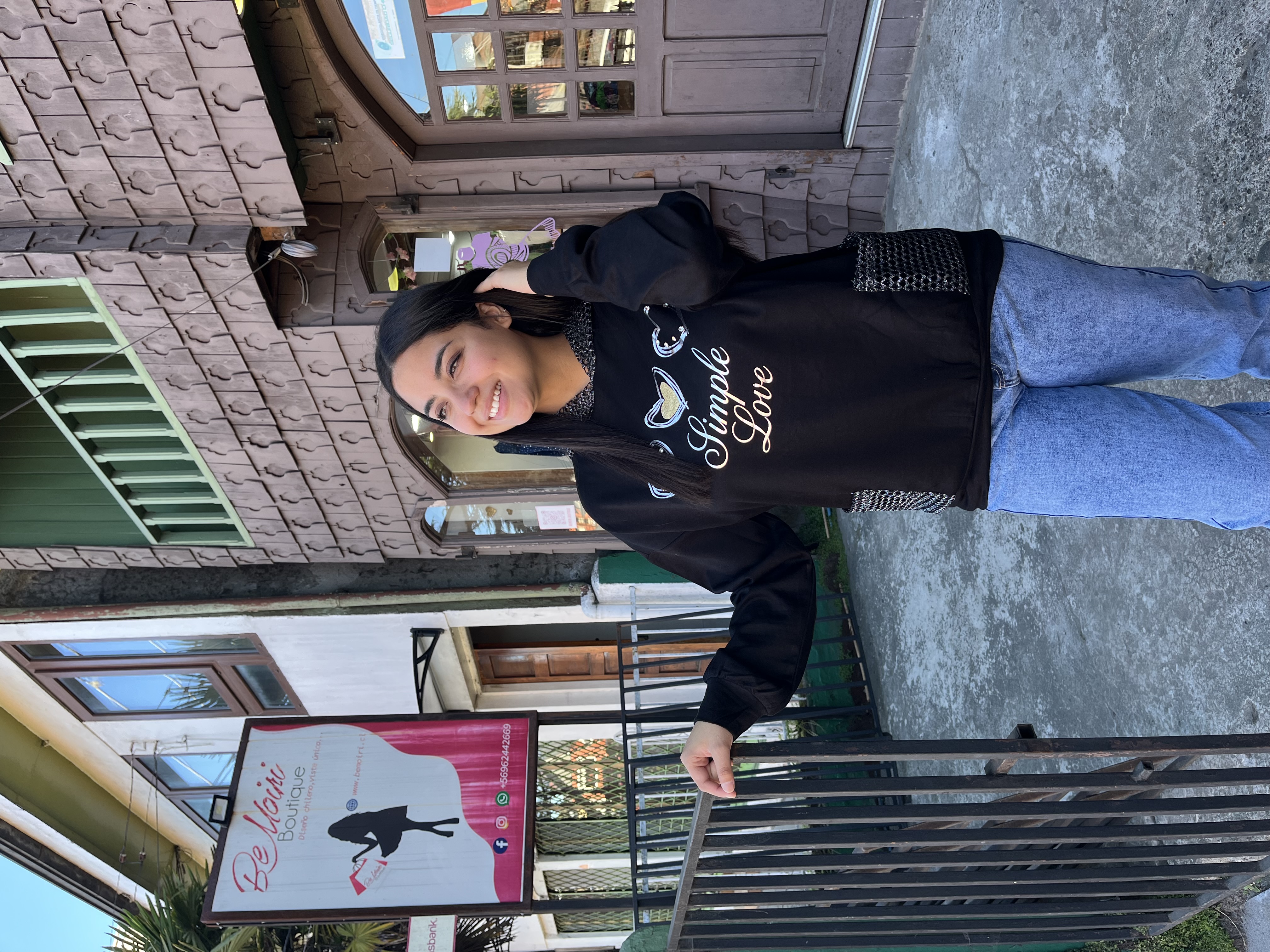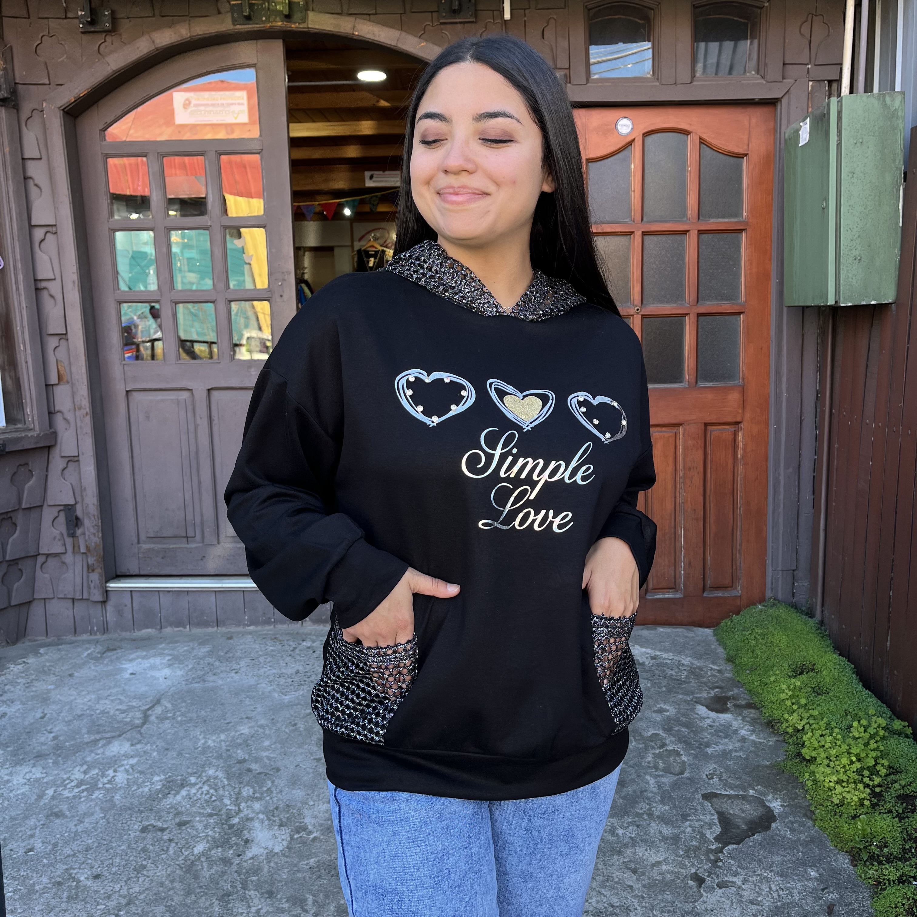Poleron Simple Love negro foil plata con capucha malla y bolsillos, muy ondero y lleno de estilo.
