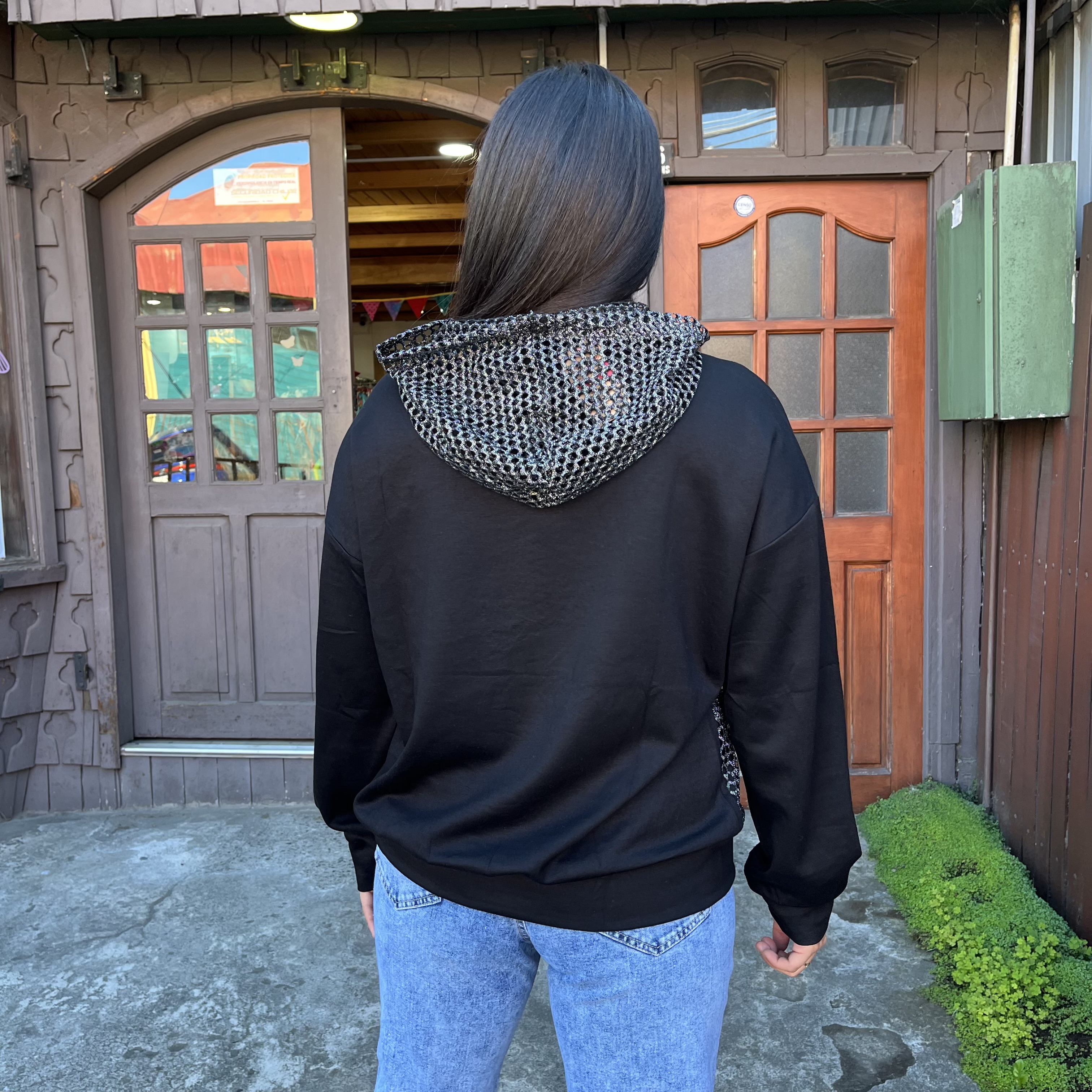 Poleron Simple Love negro foil plata con capucha malla