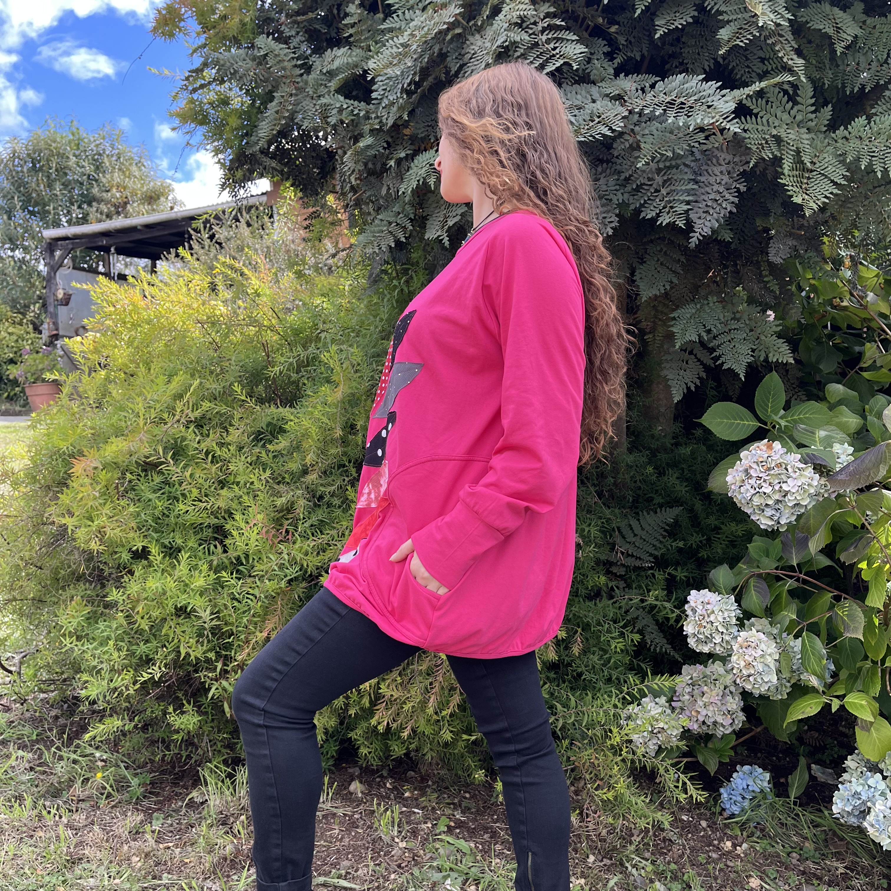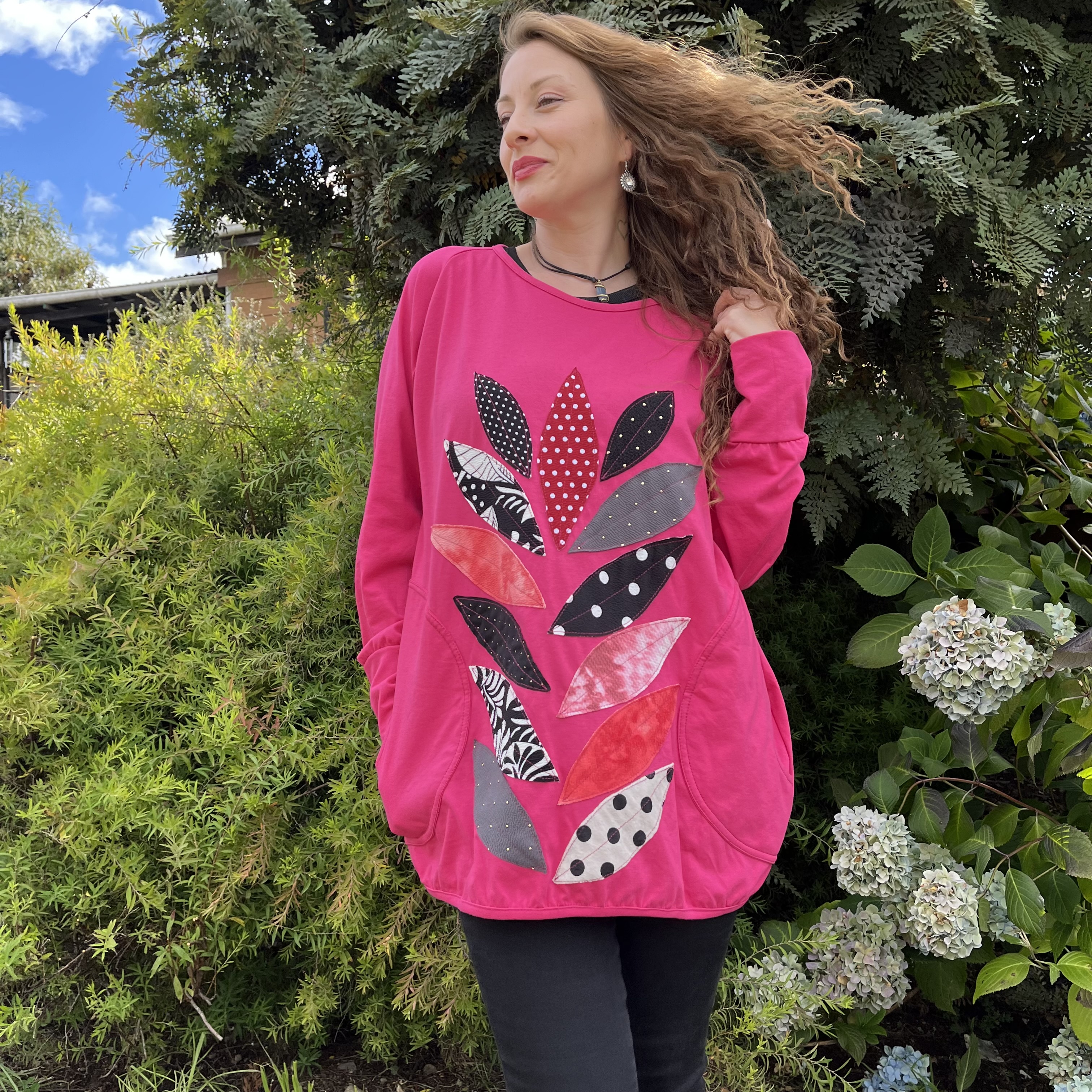 Poleron Ultravioleta Elisa algodon fucsia hojas rojo lunares