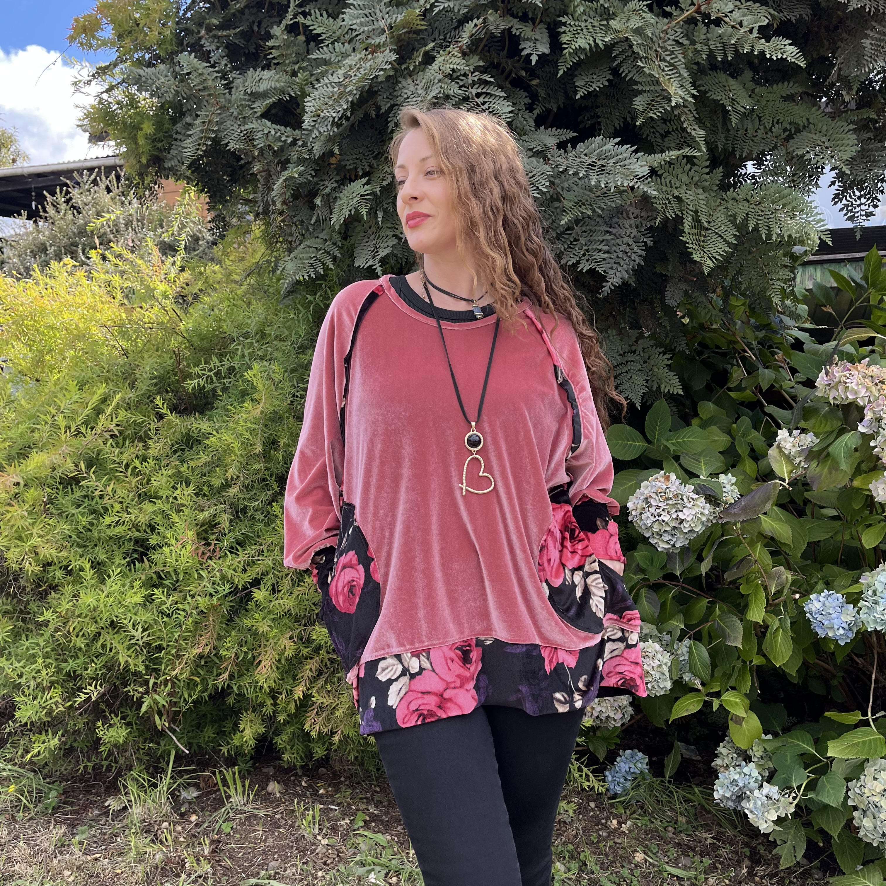 Poleron Ultravioleta Olivia velvet rosado negro floral