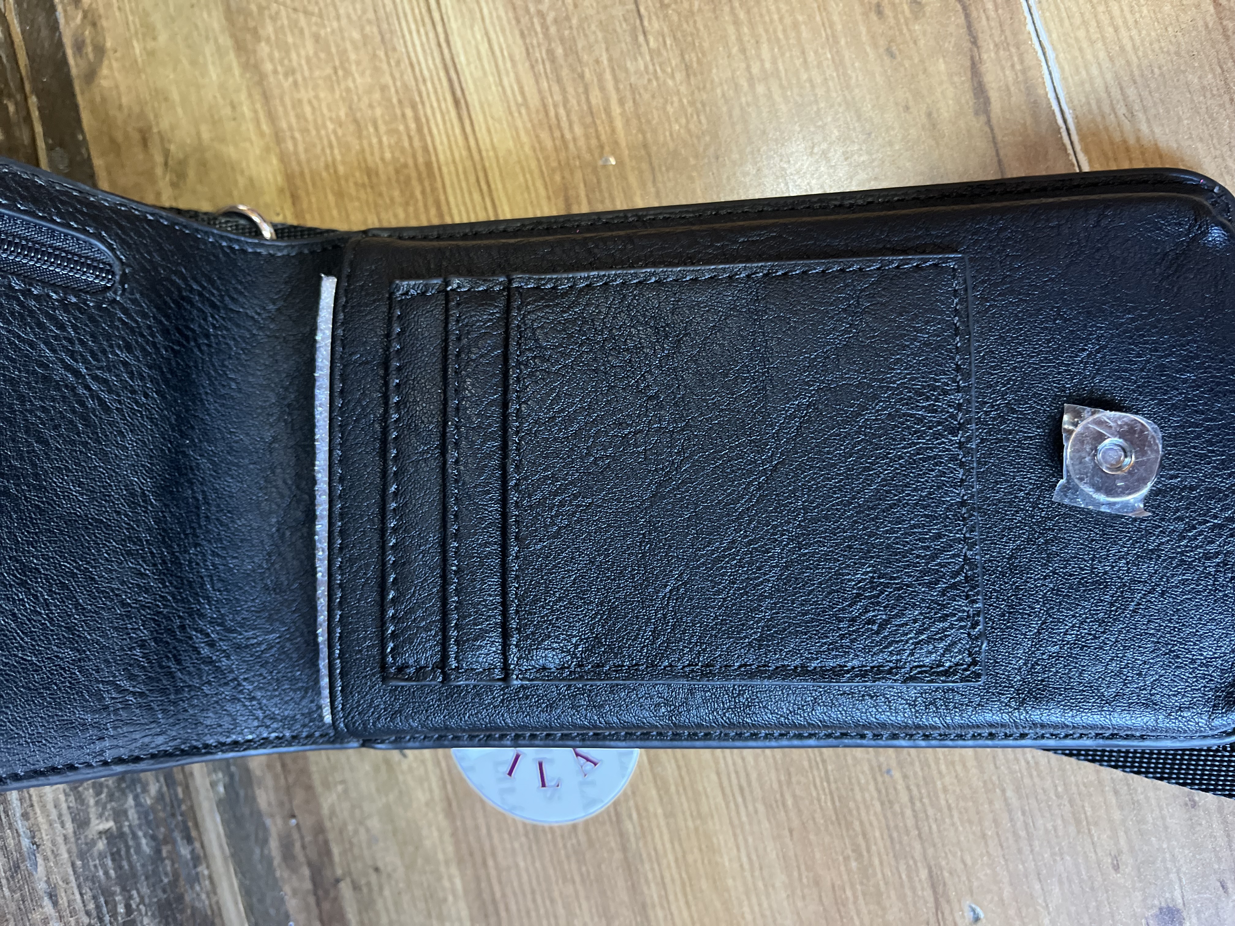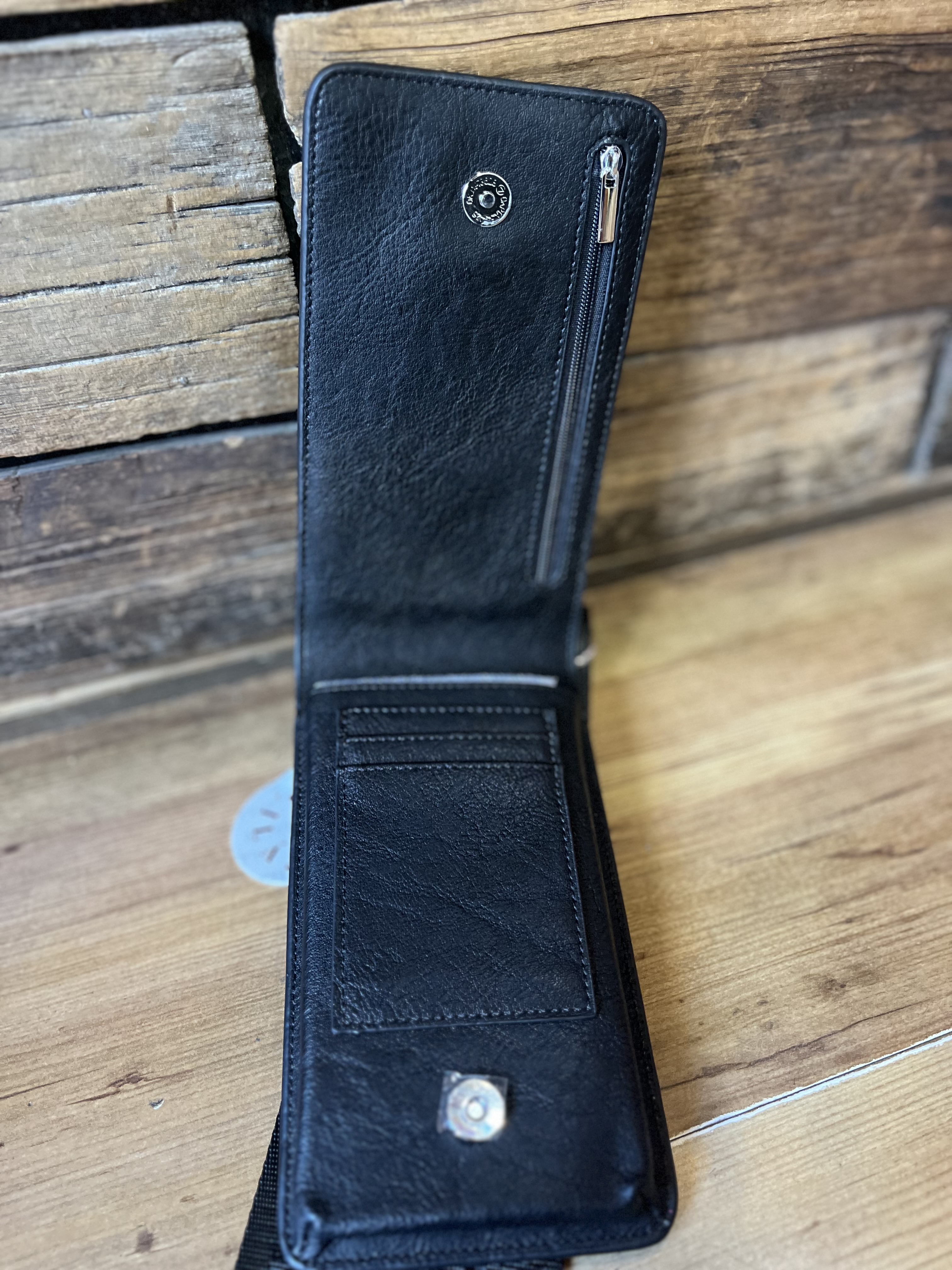 Espacio para celular, 4 tarjetas y cierre para monedas, posee broche imantado y strap desmontable.