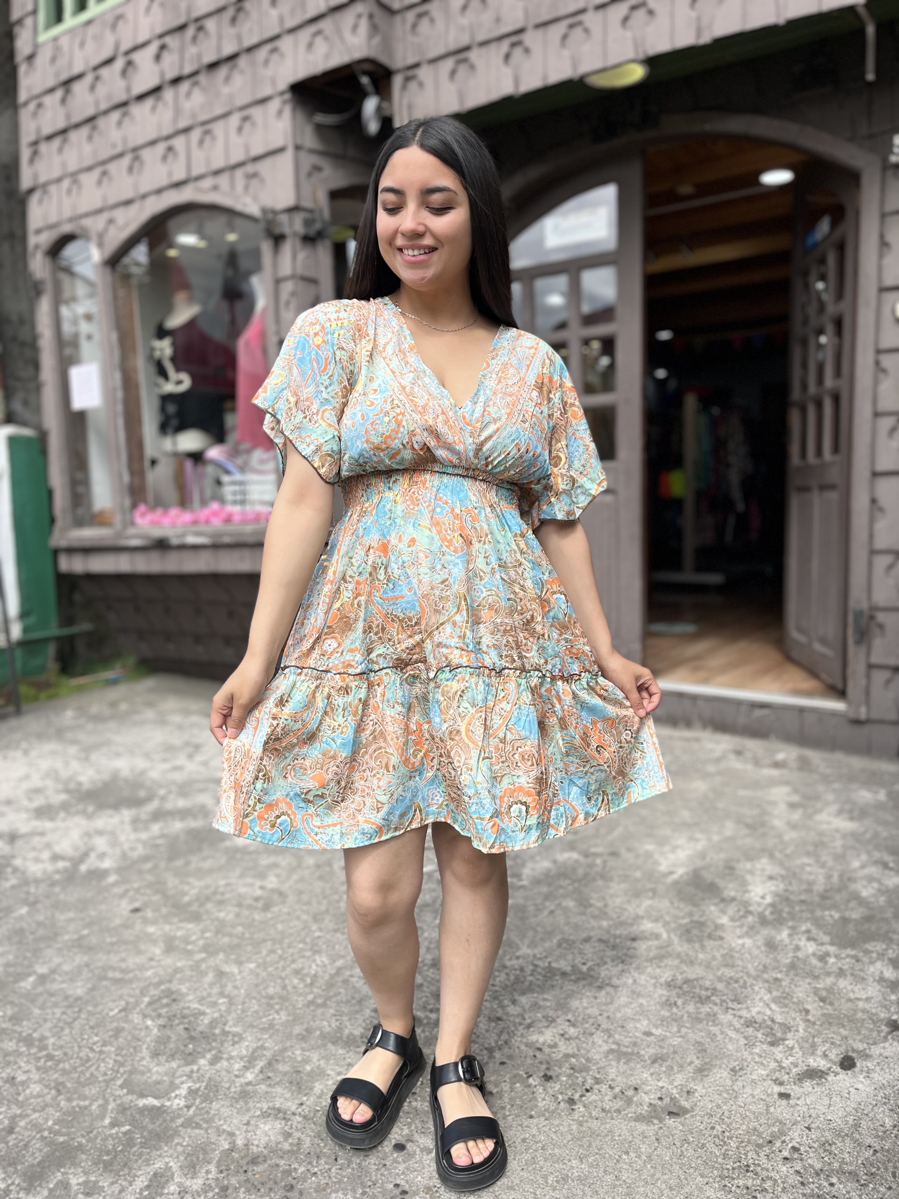 Descubre el nuevo vestido con coquetos vuelitos en sus mangas, diseñado para brindar femineidad y comodidad en los días calurosos de verano. Con un escote en forma de V y un ajuste en la cintura y de calce semi holgado este vestido se adapta perfectamente a todos los tipos de cuerpo, lo que lo convierte en una opción versátil y favorecedora.