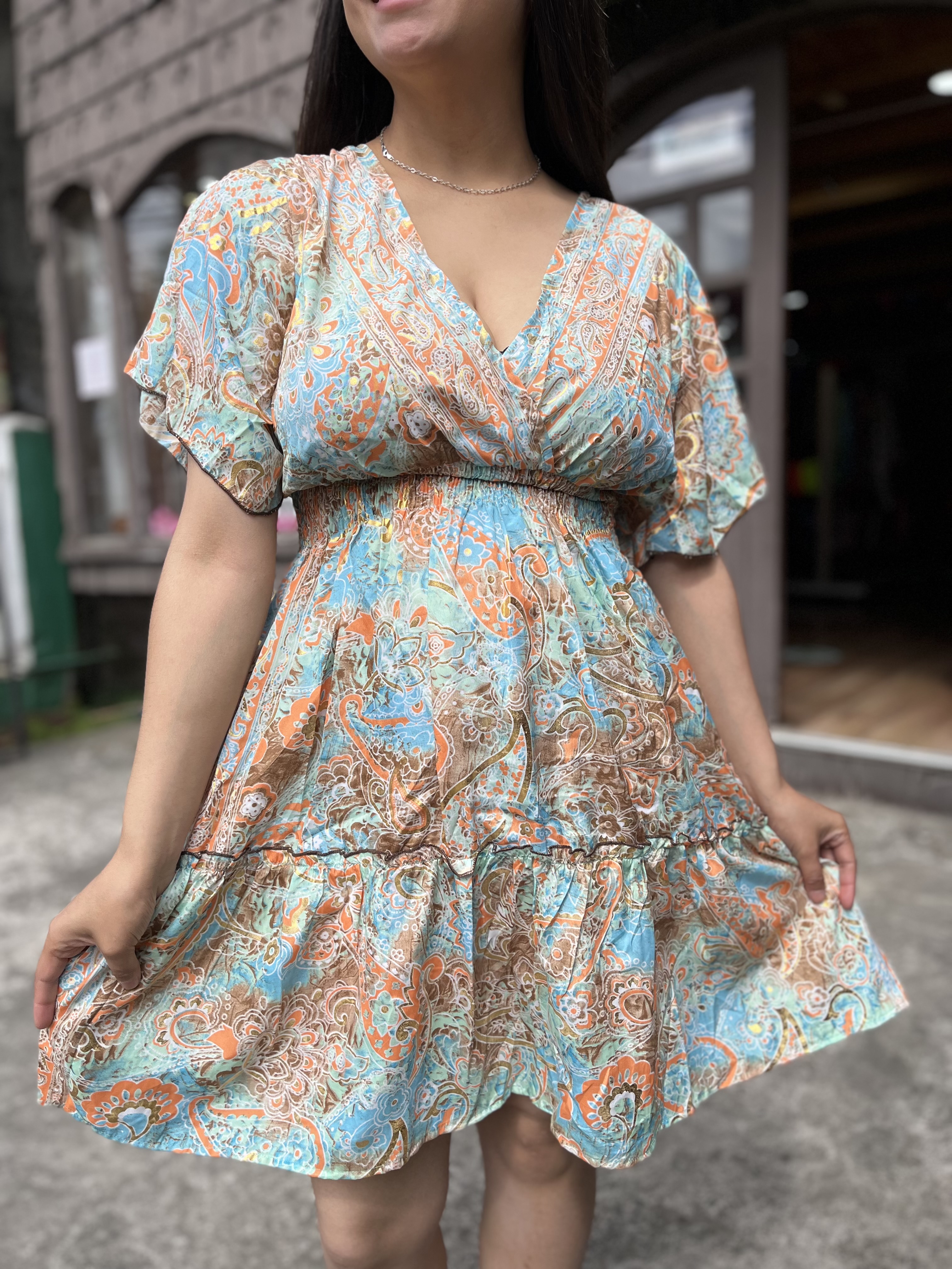Vestido India cintura elasticada gold camel naranjo manga vuelo