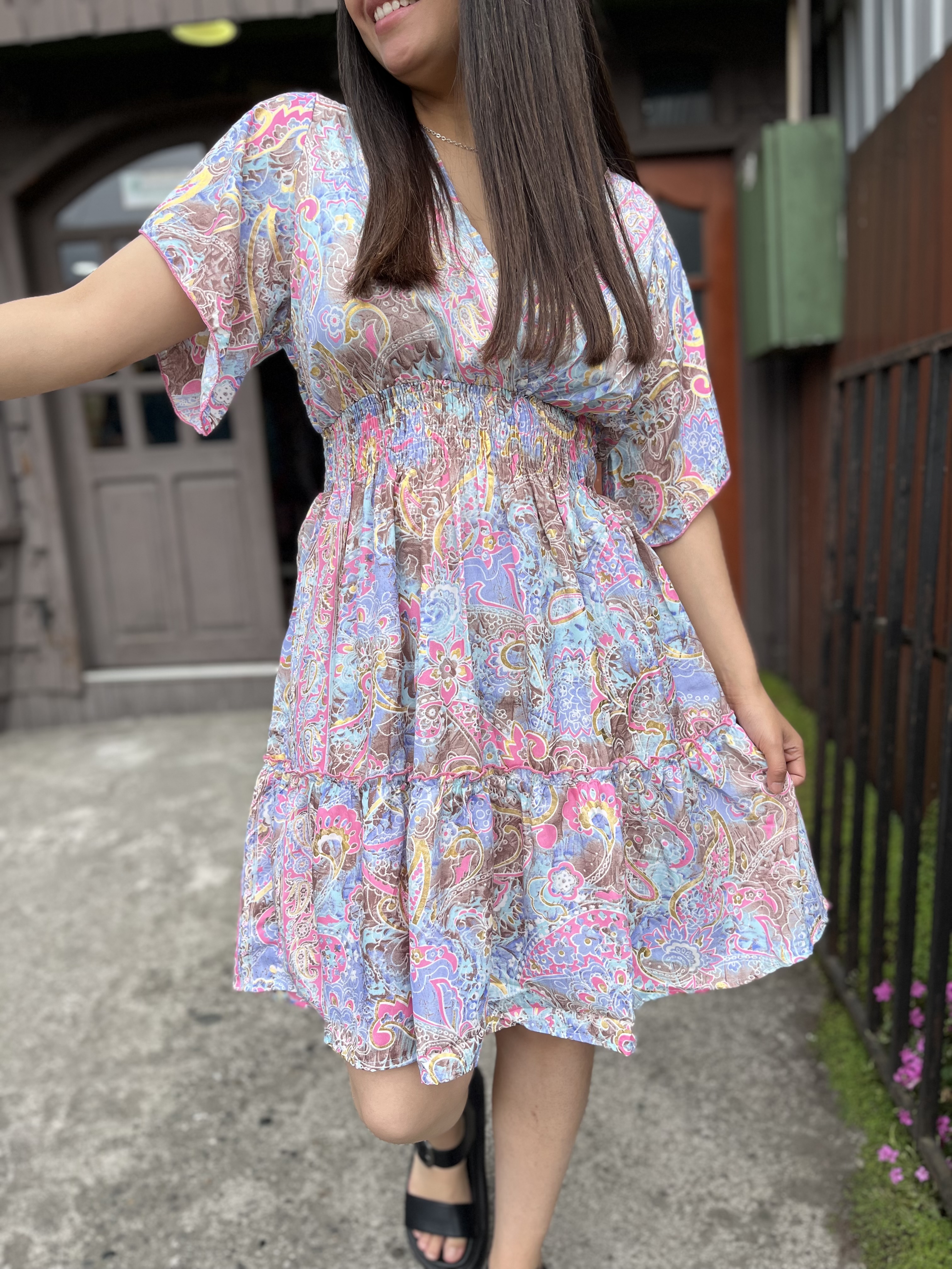 Vestido India cintura elasticada gold celeste rosado manga vuelo