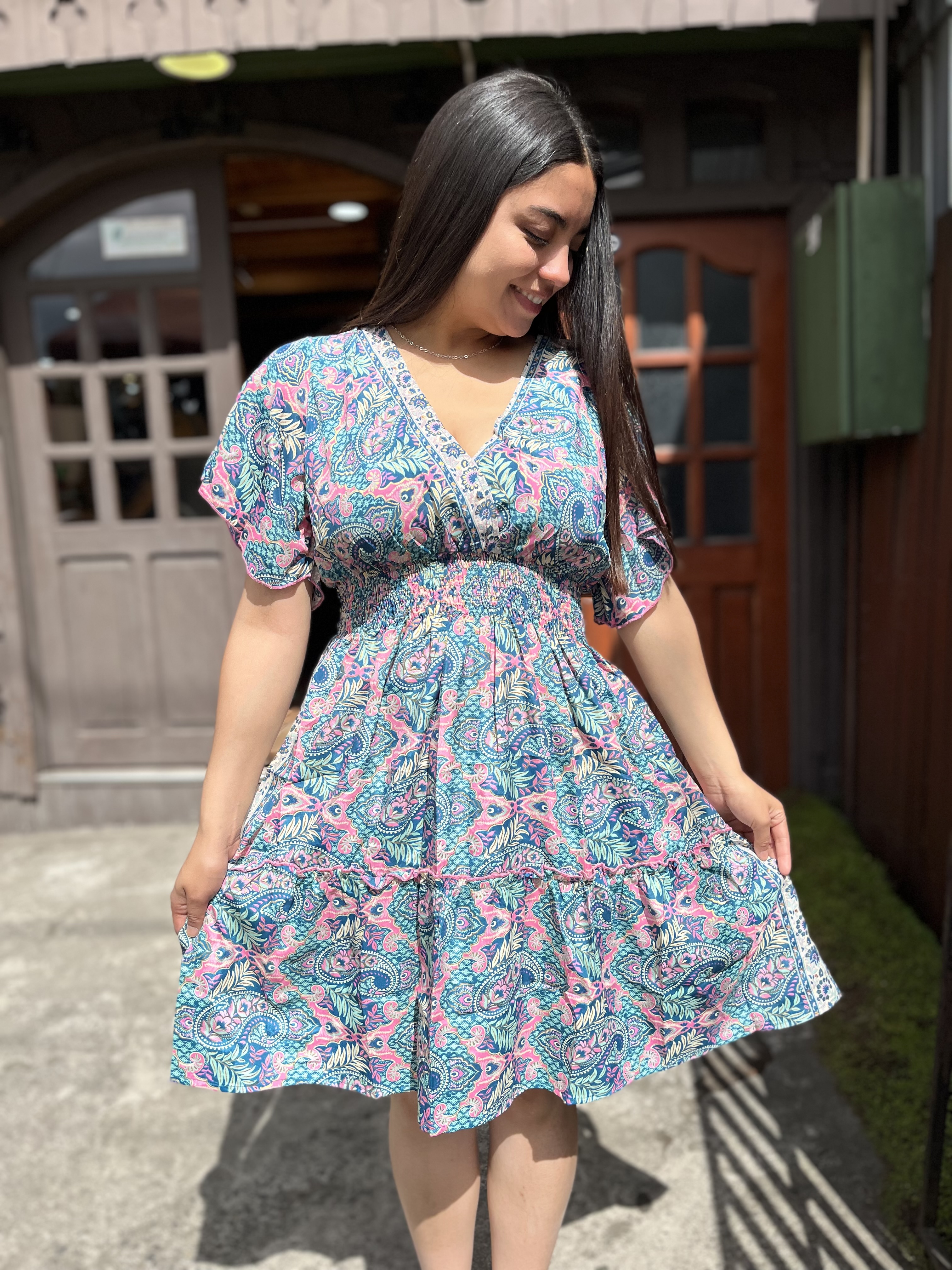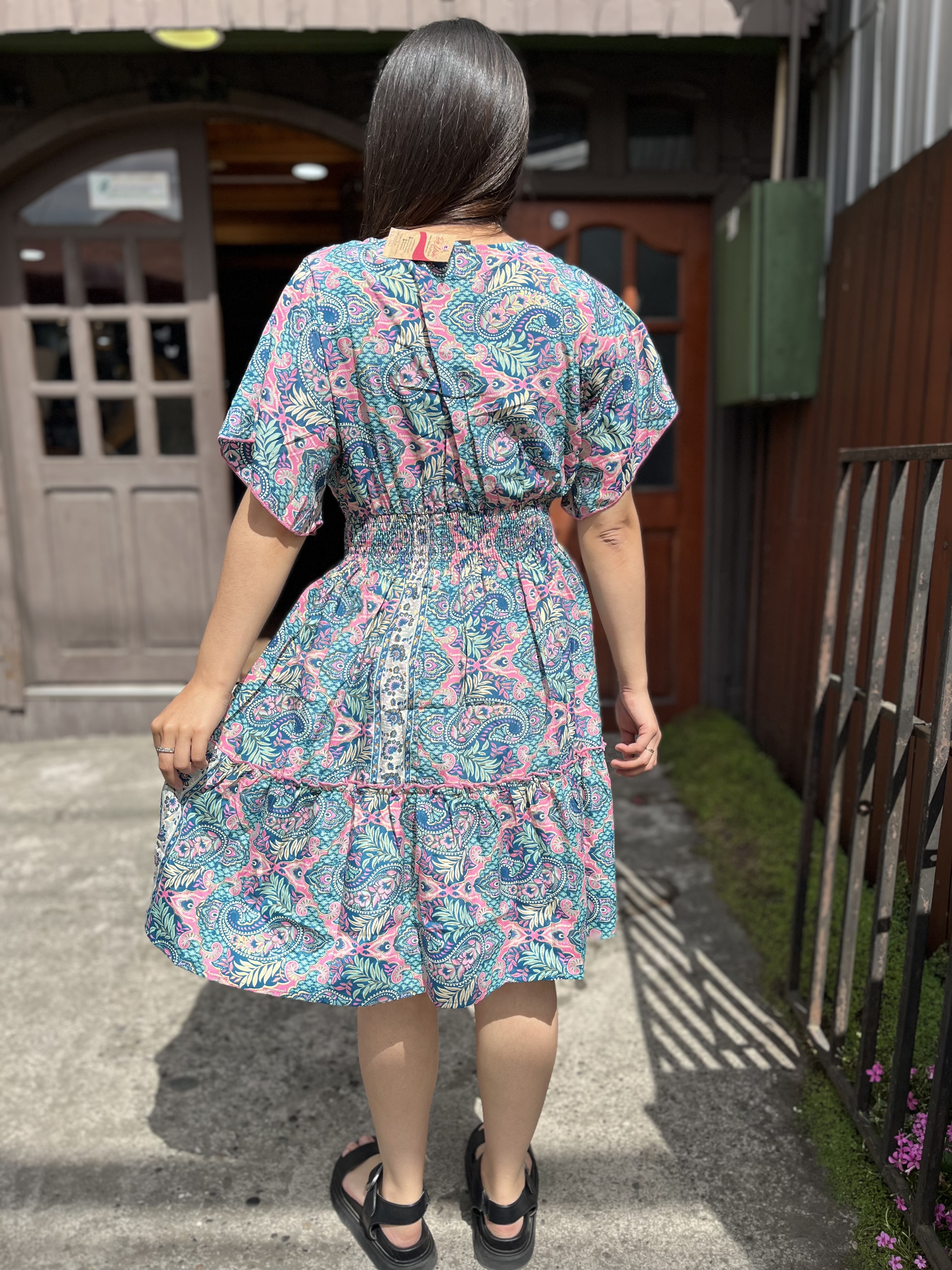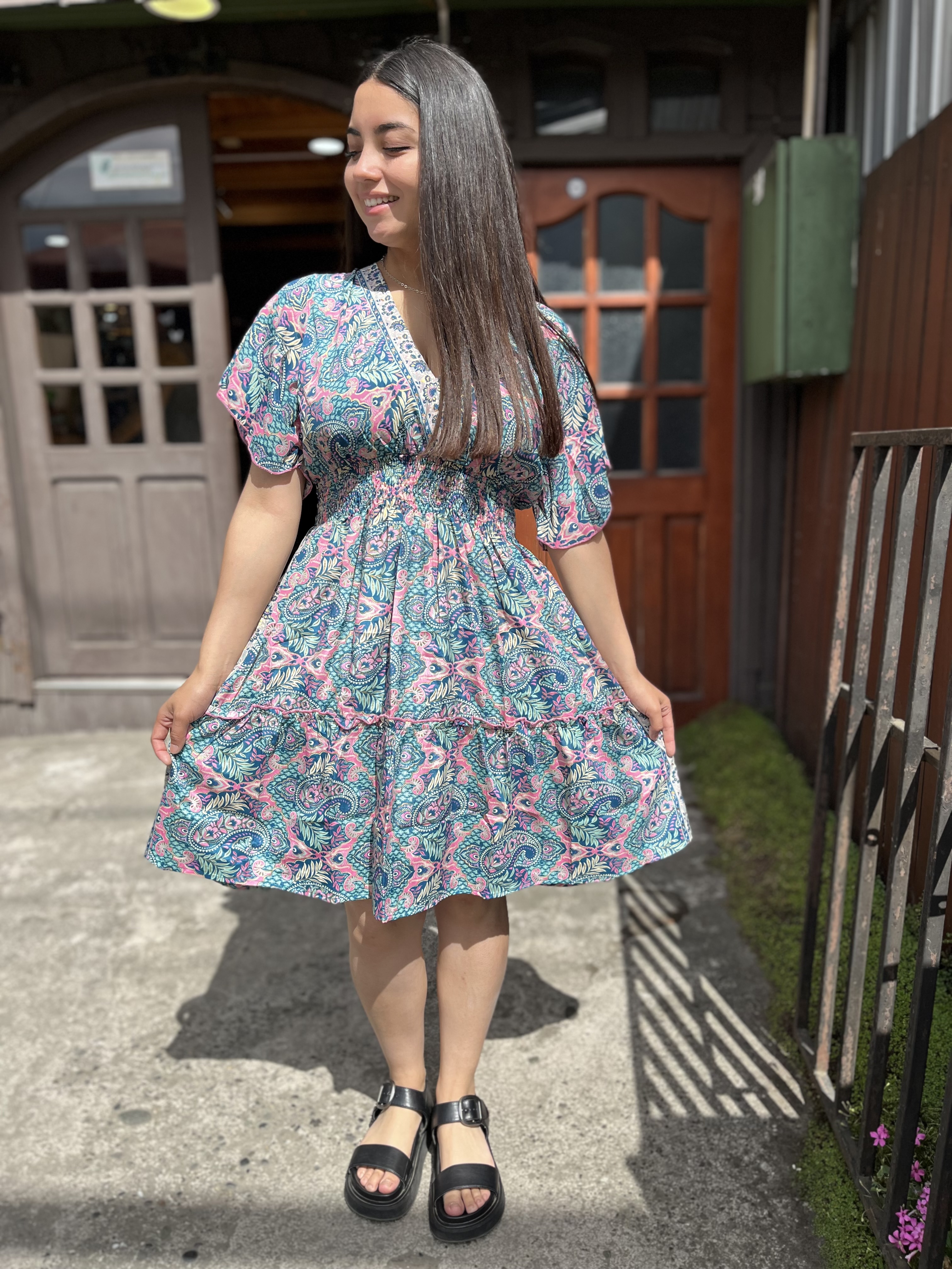 Vestido India cintura elasticada gold verde rosado manga vuelo