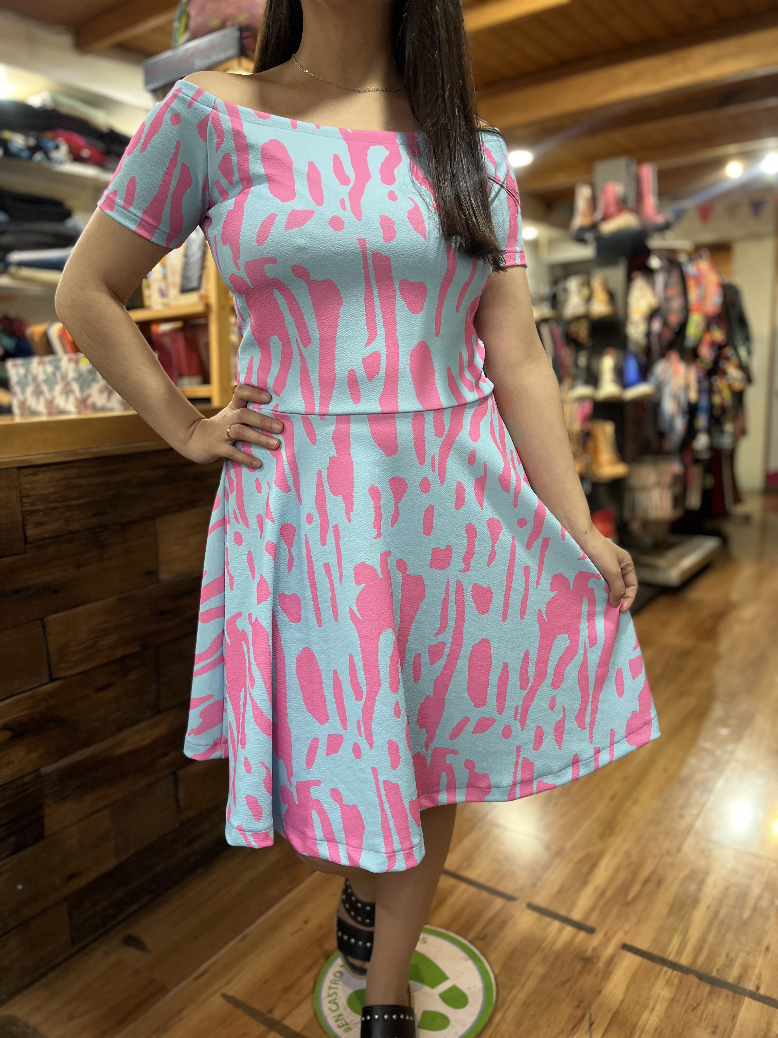 Vestido sofia sin hombros celeste y fucsia manga corta